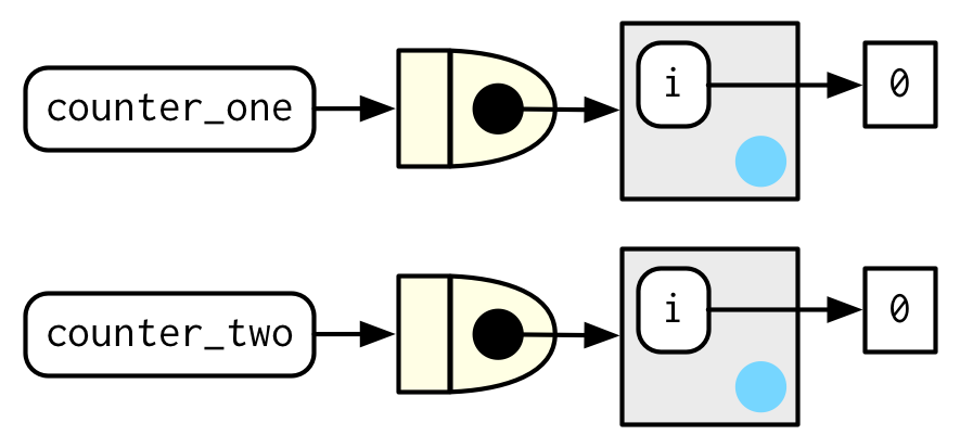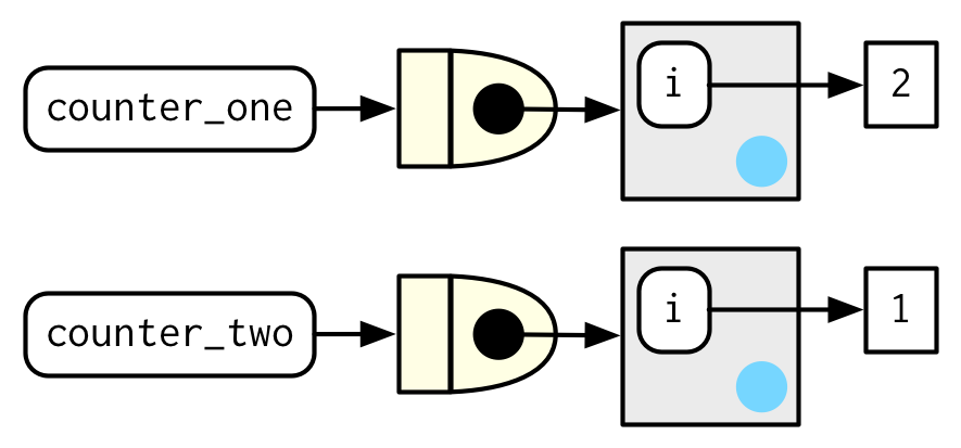 Cuando se ejecuta la función fabricada, i <<- i + 1 modificará i en su entorno adjunto. Debido a que las funciones fabricadas tienen entornos envolventes independientes, tienen recuentos independientes: