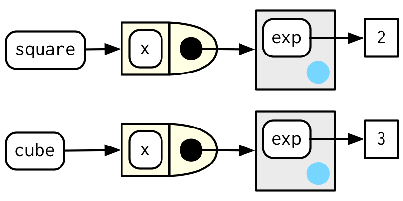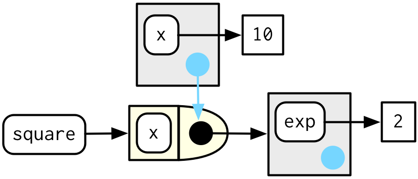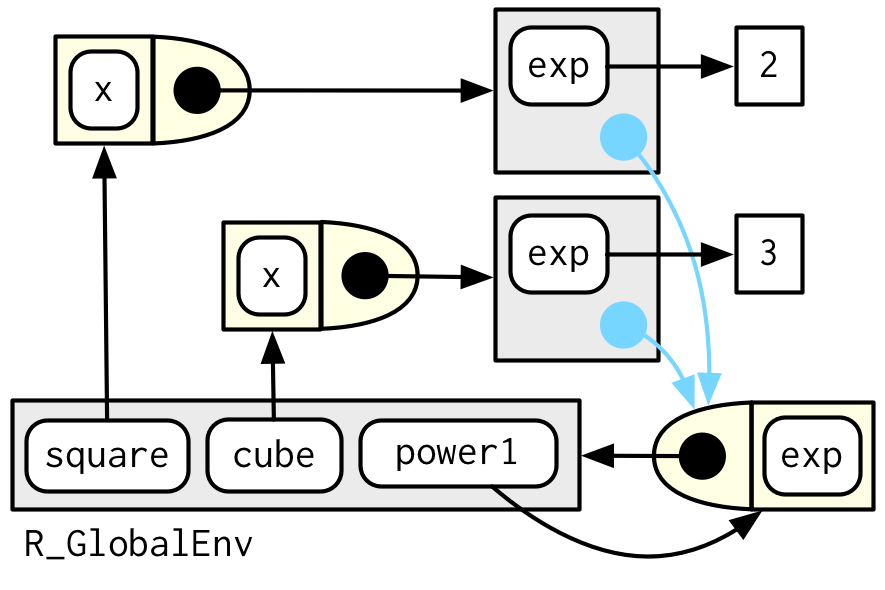 Para terminar, veamos el entorno de ejecución de square(10). Cuando square() ejecuta x ^ exp, encuentra x en el entorno de ejecución y exp en su entorno adjunto.
