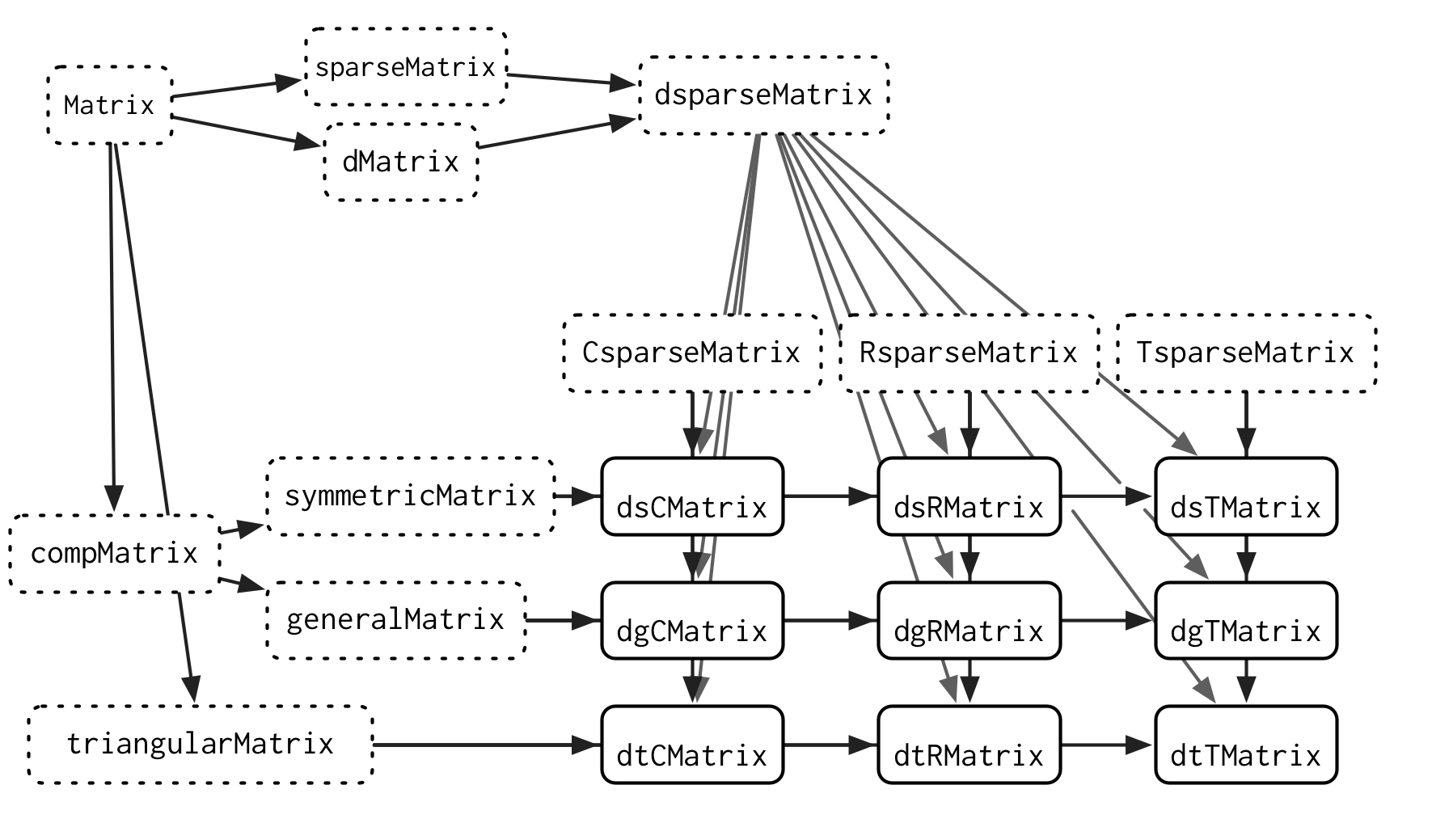 S4 también es una buena opción para sistemas complejos de objetos interrelacionados, y es posible minimizar la duplicación de código mediante la implementación cuidadosa de métodos. El mejor ejemplo de tal sistema es el paquete Matrix (Bates y Maechler 2018). Está diseñado para almacenar y calcular de manera eficiente con muchos tipos diferentes de matrices densas y dispersas. A partir de la versión 1.7.0, define clases 108, funciones genéricas 23 y métodos 1780, y para darle una idea de la complejidad, se muestra un pequeño subconjunto del gráfico de clase en Figura 16.1.