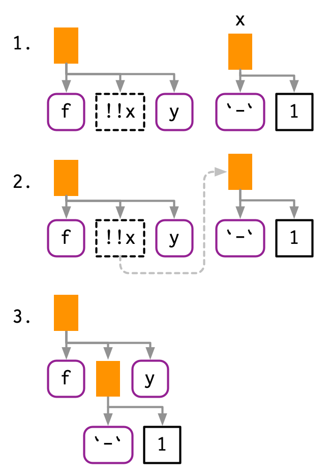 !!xcomo!(!x). Esta es la razón por la que en las versiones antiguas de R es posible que vea paréntesis adicionales al imprimir expresiones. La buena noticia es que estos paréntesis no son reales y pueden ignorarse con seguridad la mayor parte del tiempo. La mala noticia es que se volverán reales si vuelves a analizar esa salida impresa en código R. Estas funciones de ida y vuelta no funcionarán como se espera, ya que!(!x)no elimina las comillas.↩︎A diferencia de, por ejemplo, Javascript, donde
