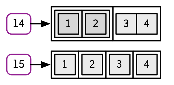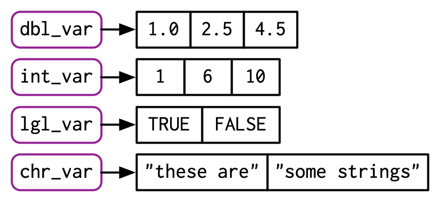 #> [1] 1 2 3 4En los diagramas, representaré los vectores como rectángulos conectados, por lo que el código anterior podría dibujarse de la siguiente manera:
