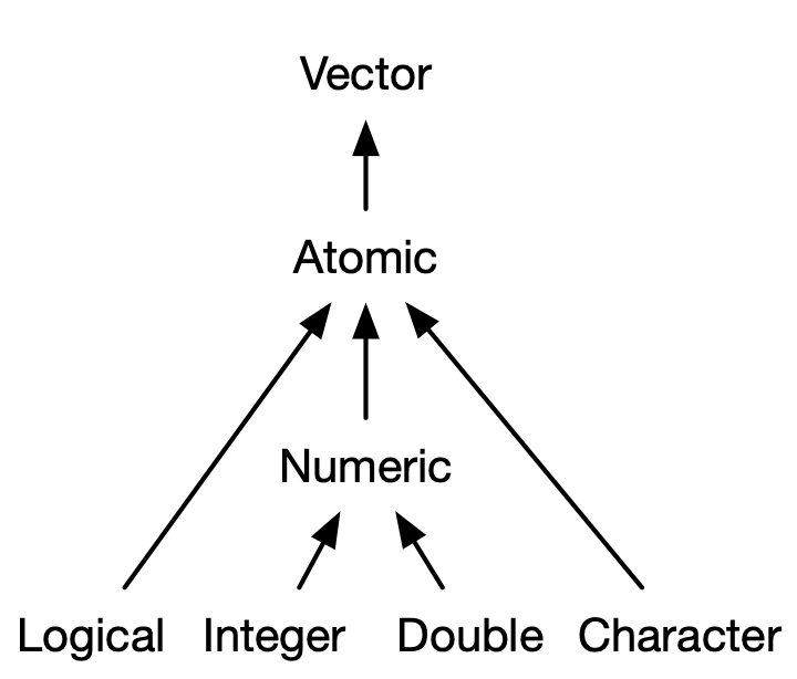 Hay cuatro tipos principales de vectores atómicos: lógico, entero, doble y carácter (que contiene cadenas). En conjunto, los vectores enteros y dobles se conocen como vectores numéricos 3. Hay dos tipos raros: complejos y crudos. No los discutiré más porque los números complejos rara vez se necesitan en las estadísticas, y los vectores sin procesar son un tipo especial que solo se necesita cuando se manejan datos binarios.