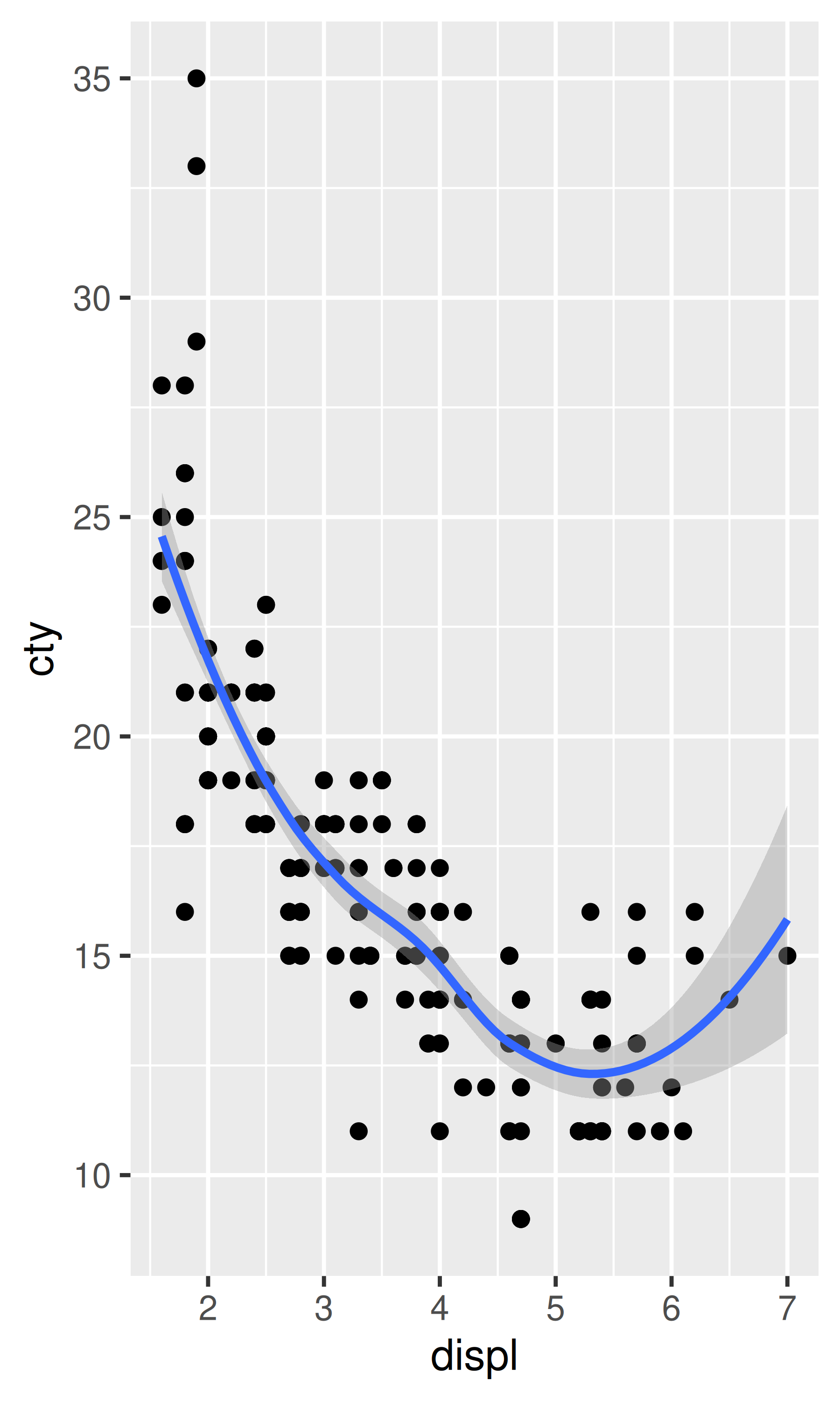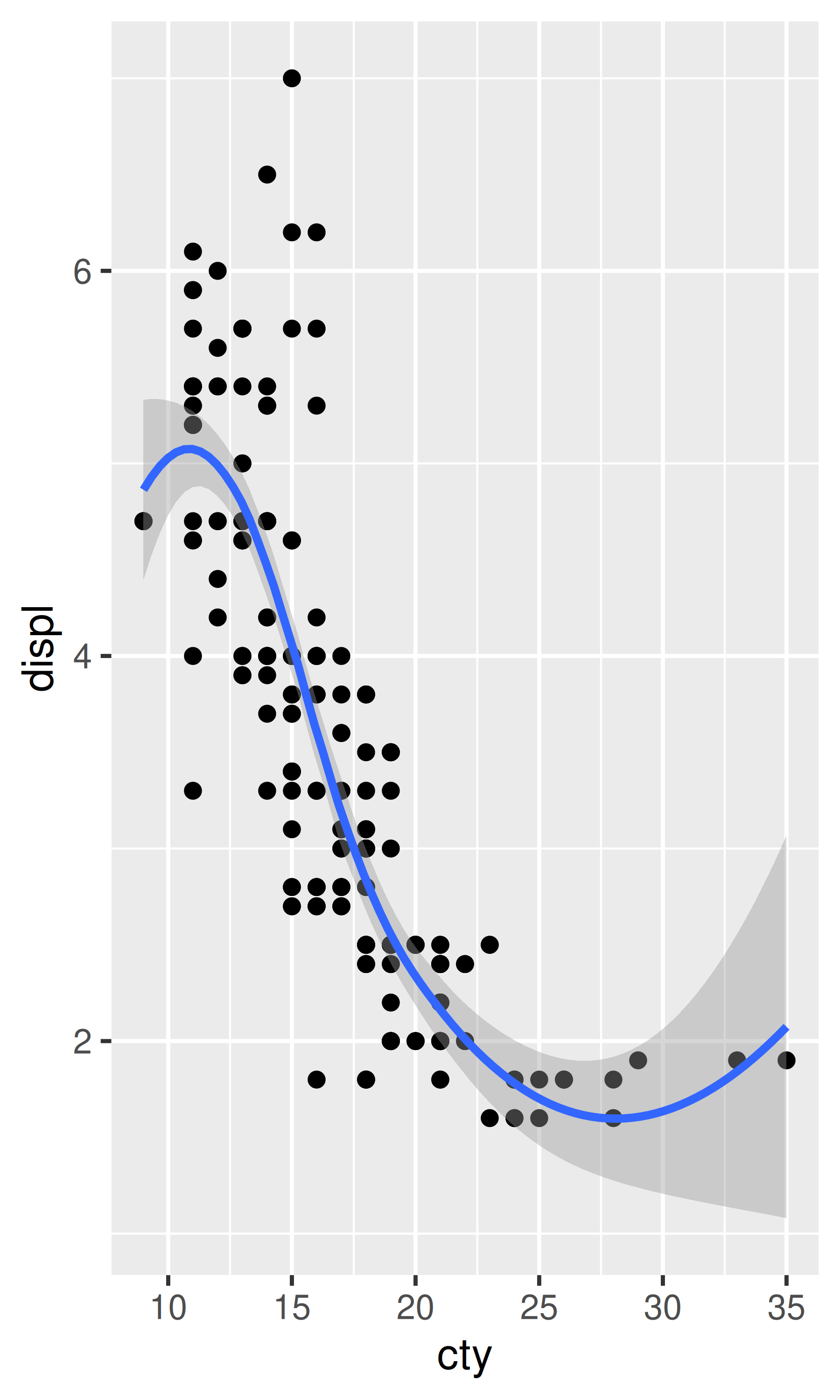 ggplot(mpg, aes(displ, cty)) +