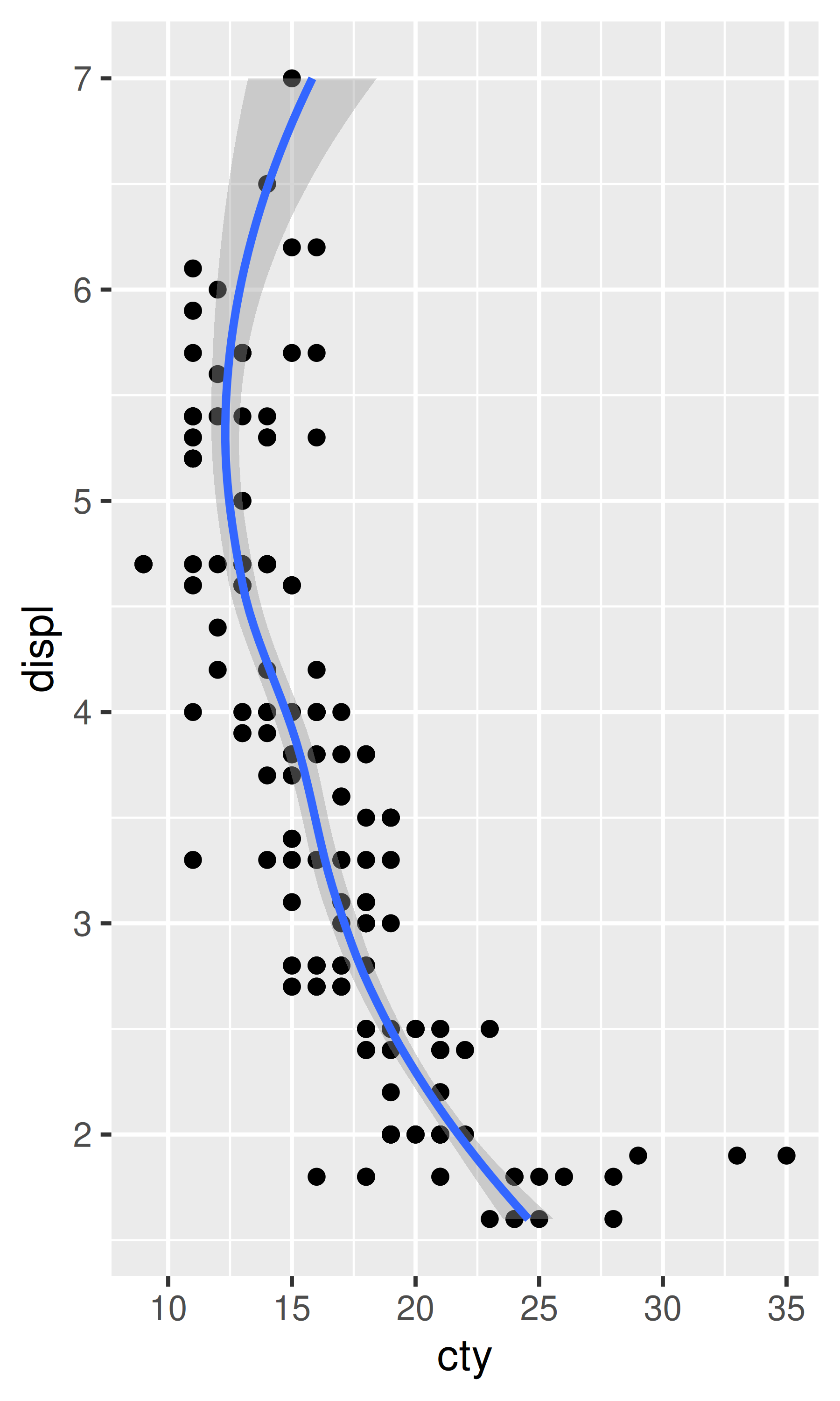ggplot(mpg, aes(cty, displ)) +