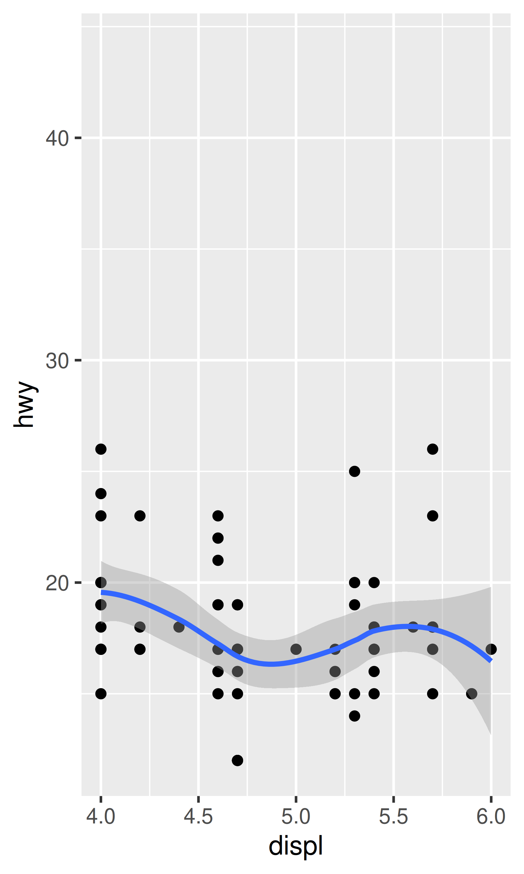 base <- ggplot(mpg, aes(displ, hwy)) +