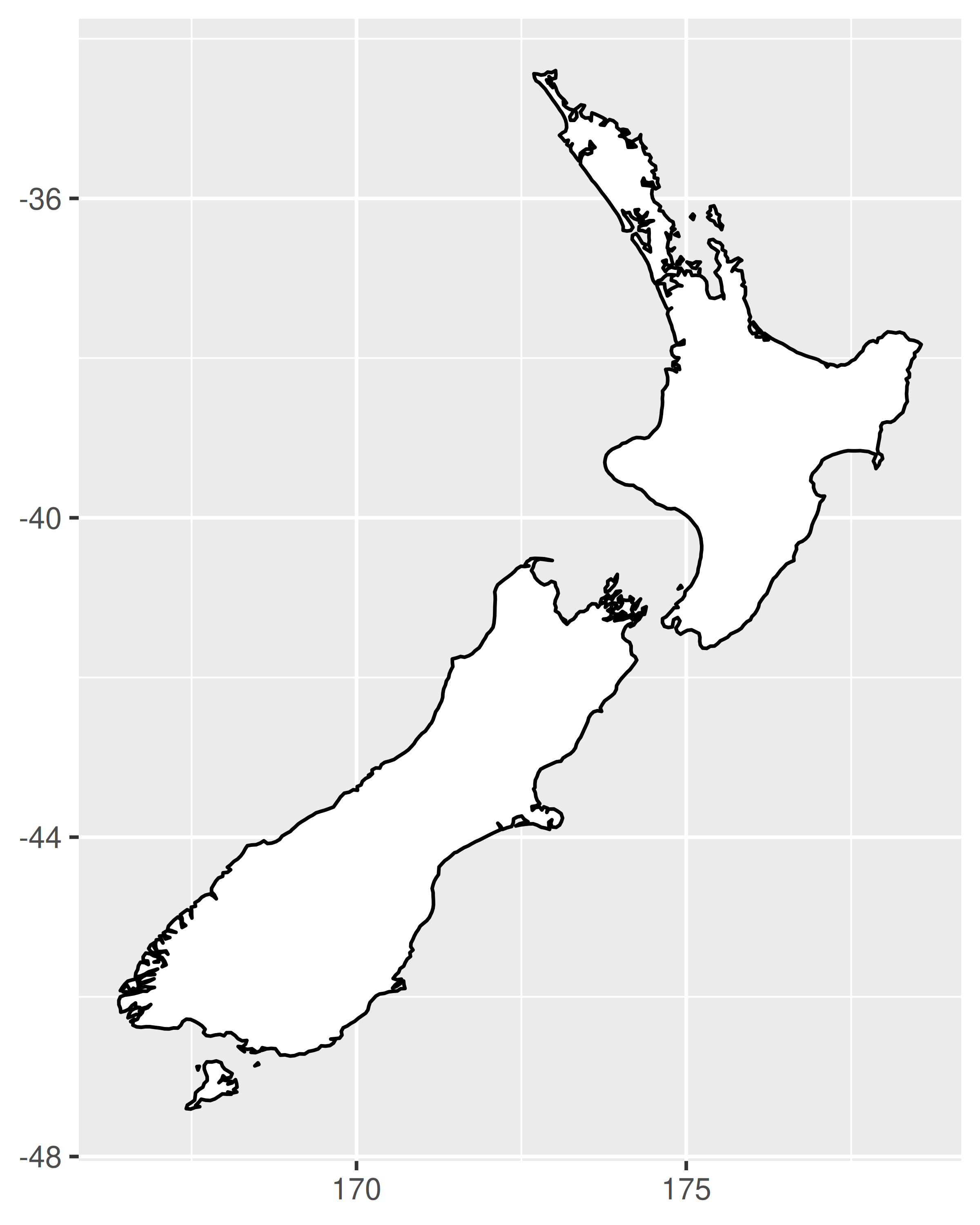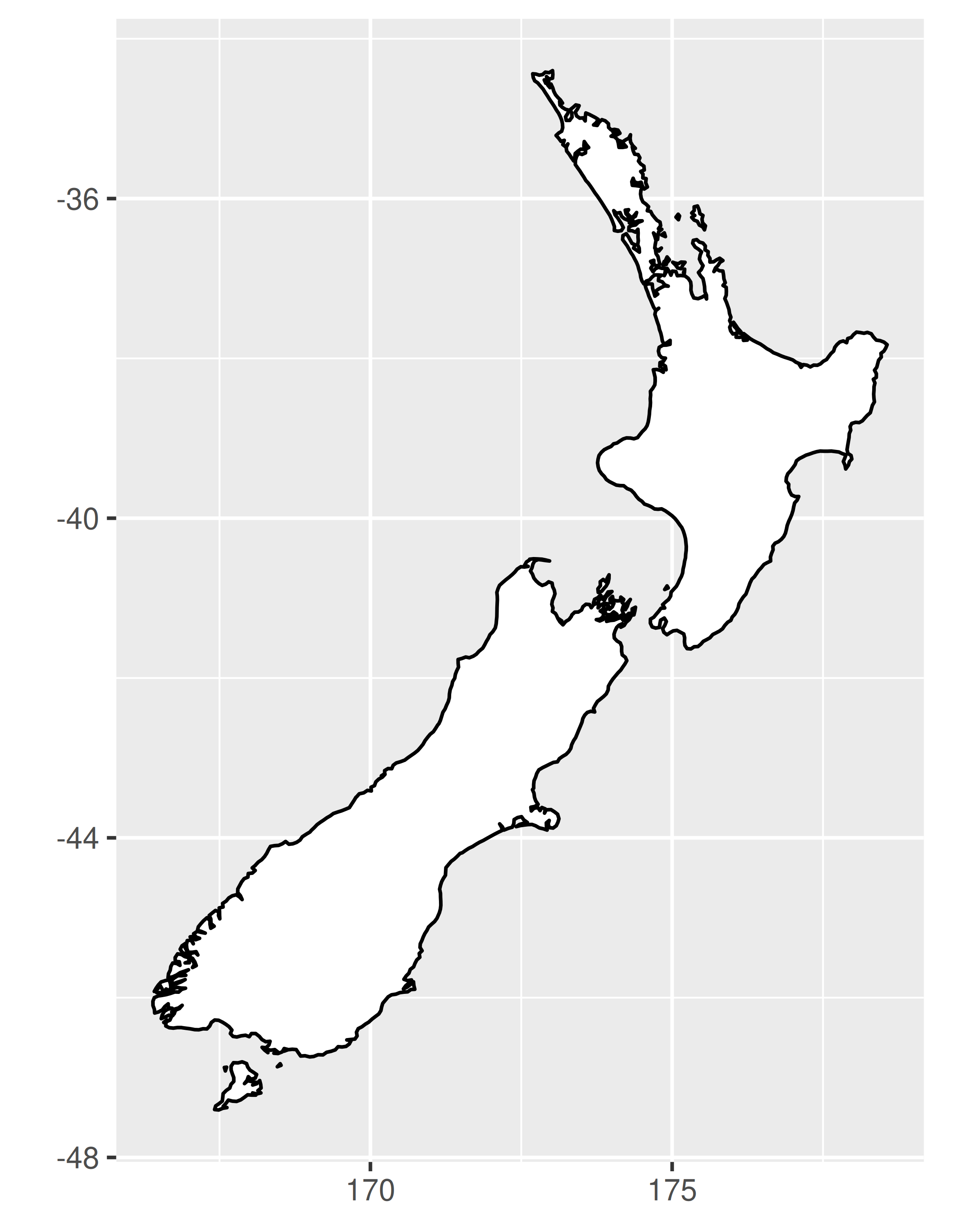 nzmap <- ggplot(map_data("nz"), aes(long, lat, group = group)) +