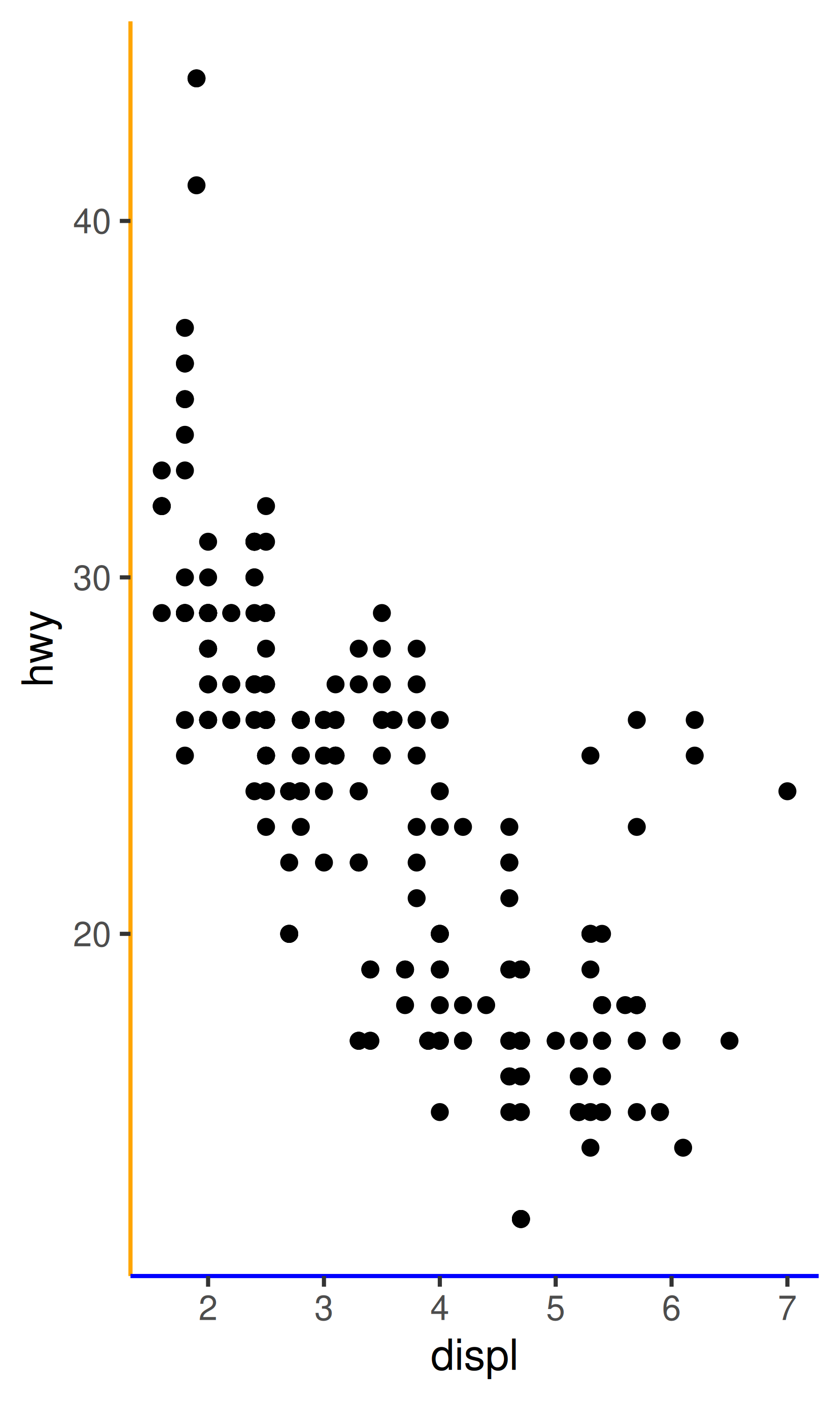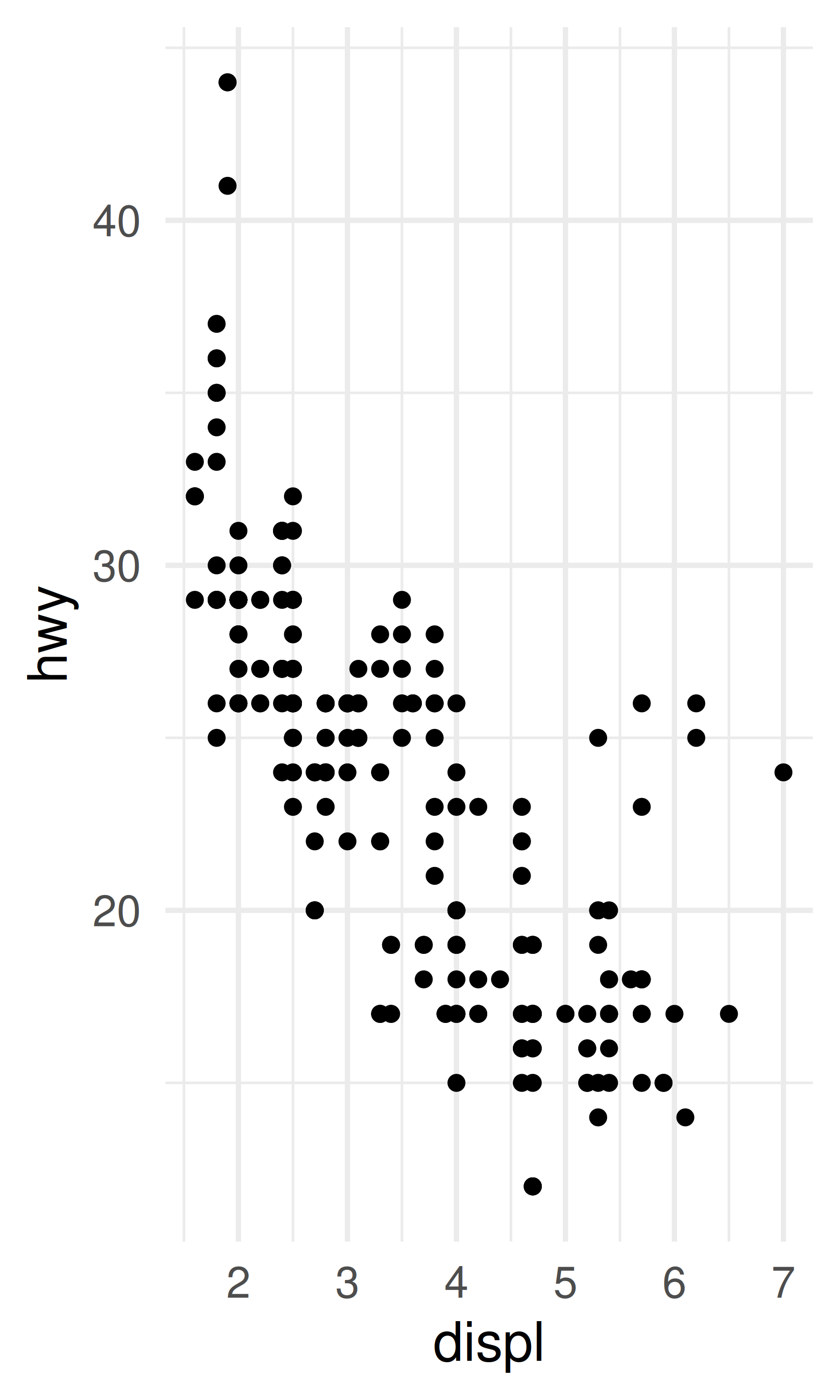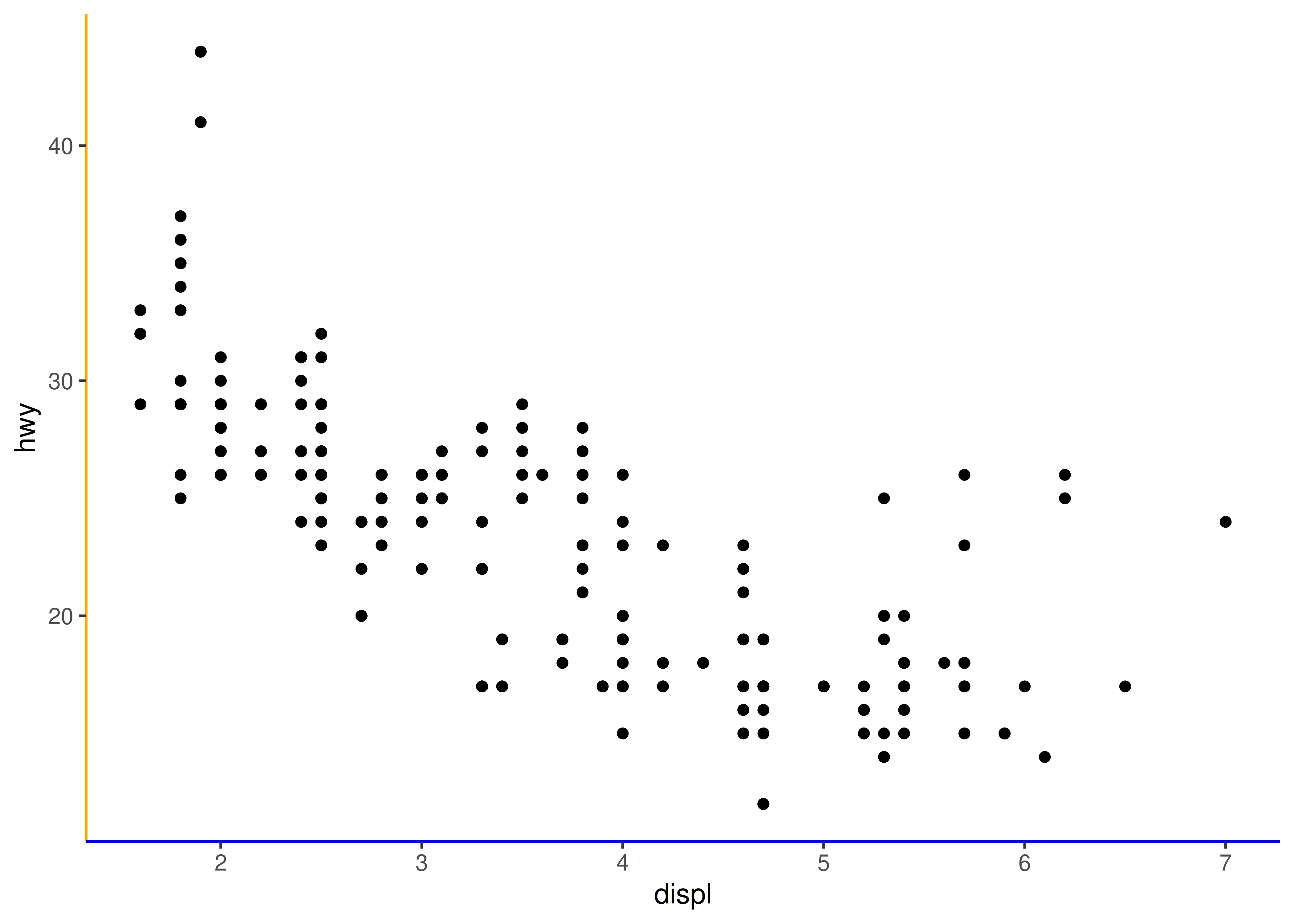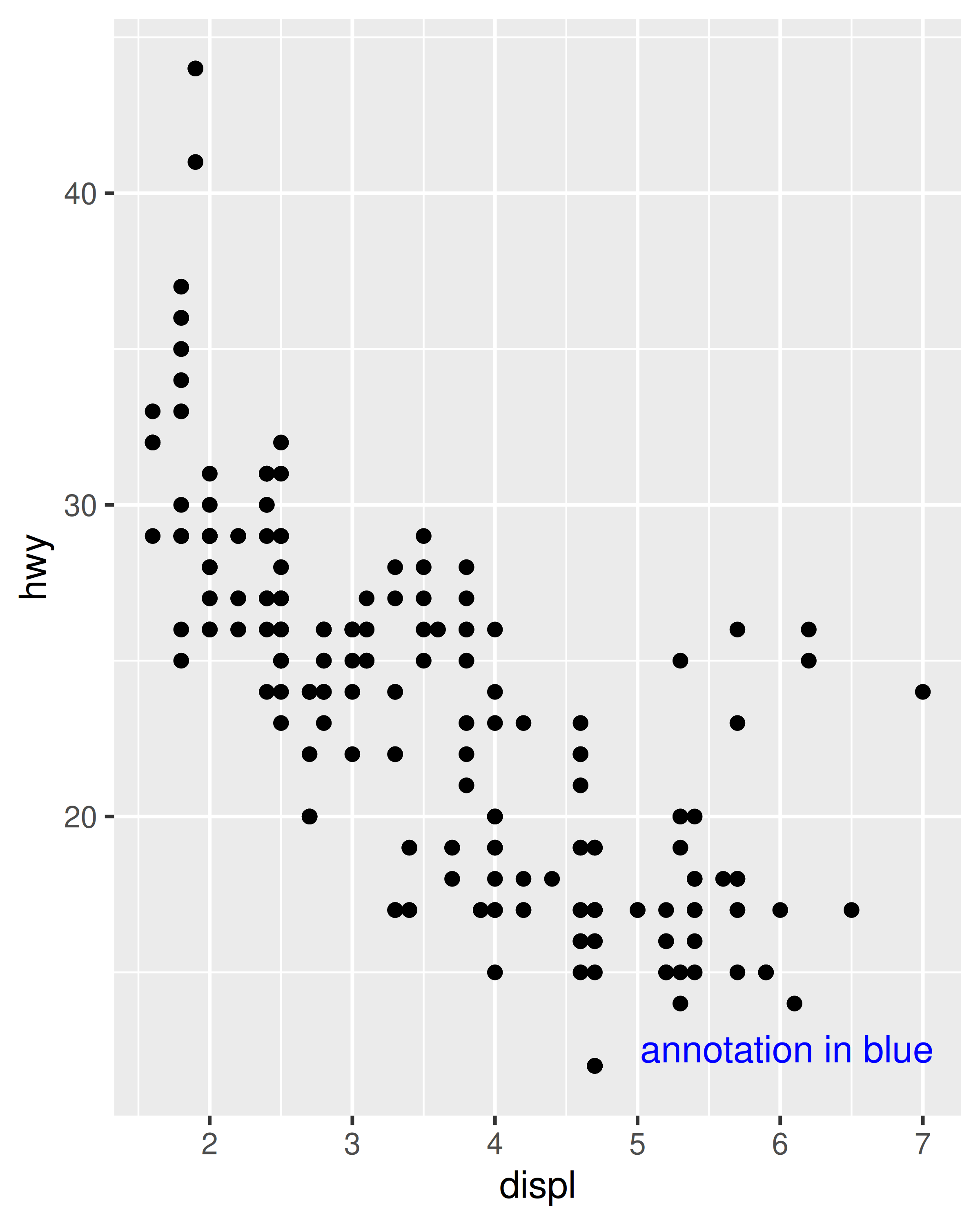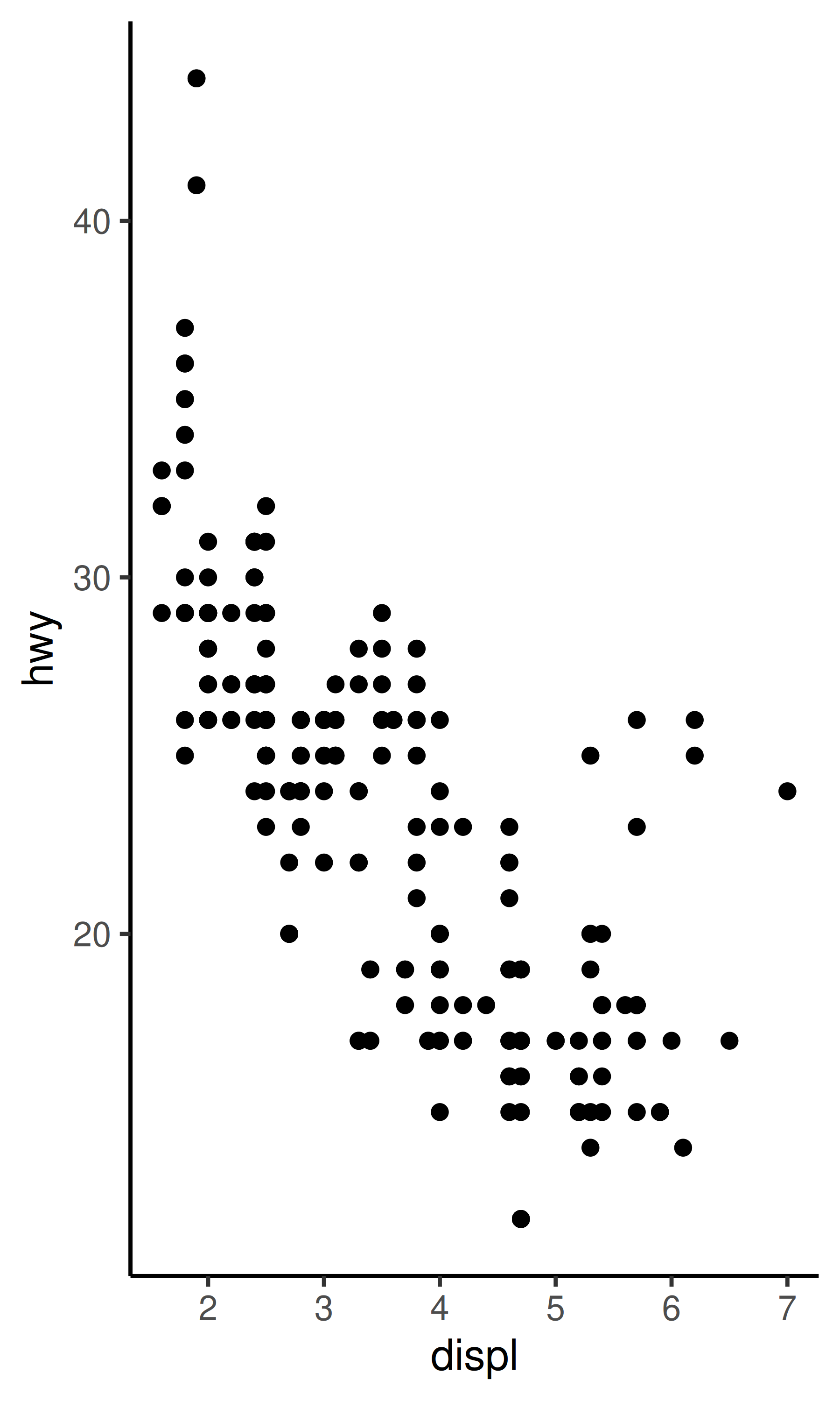 base <- ggplot(mpg, aes(displ, hwy)) + geom_point()