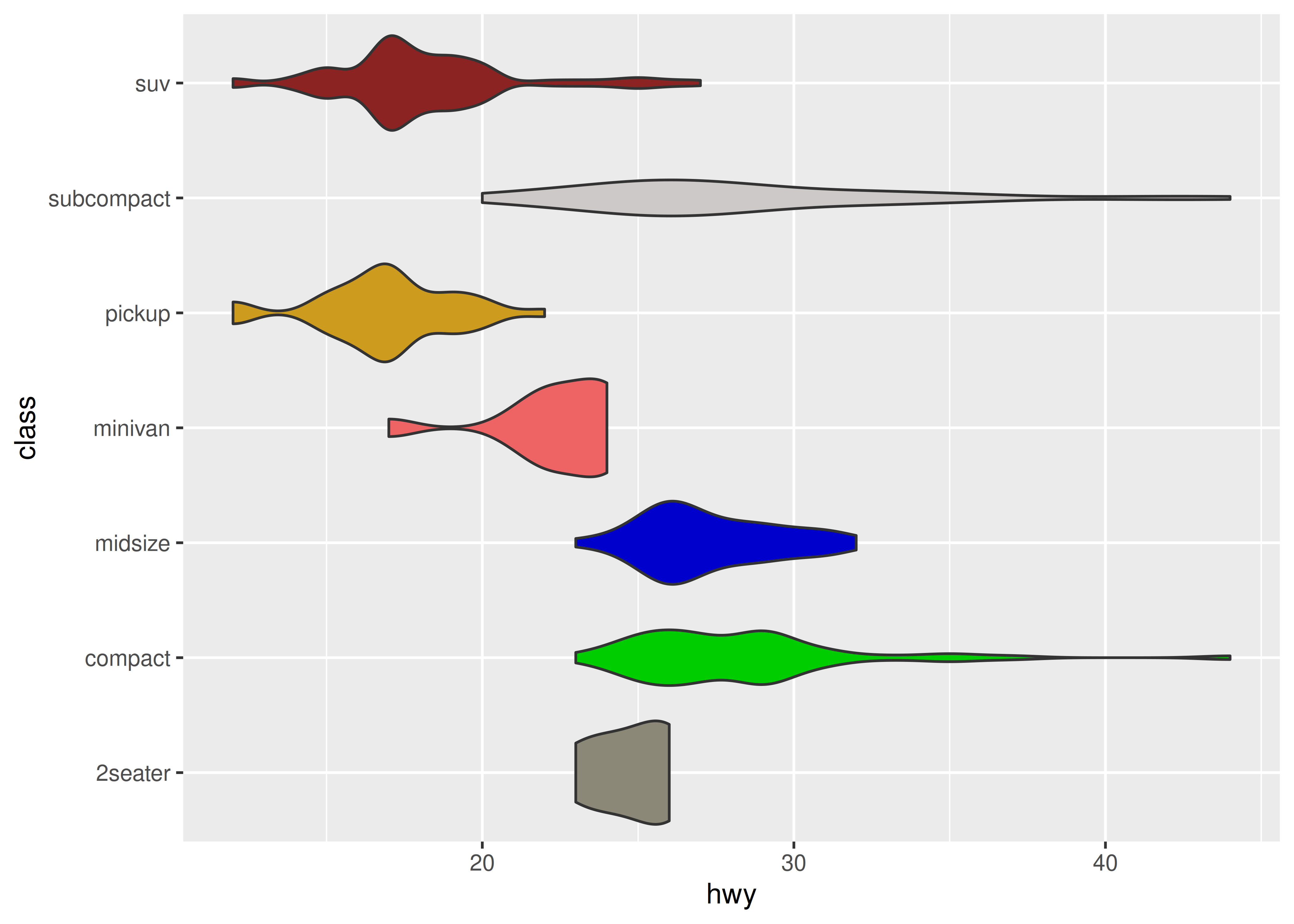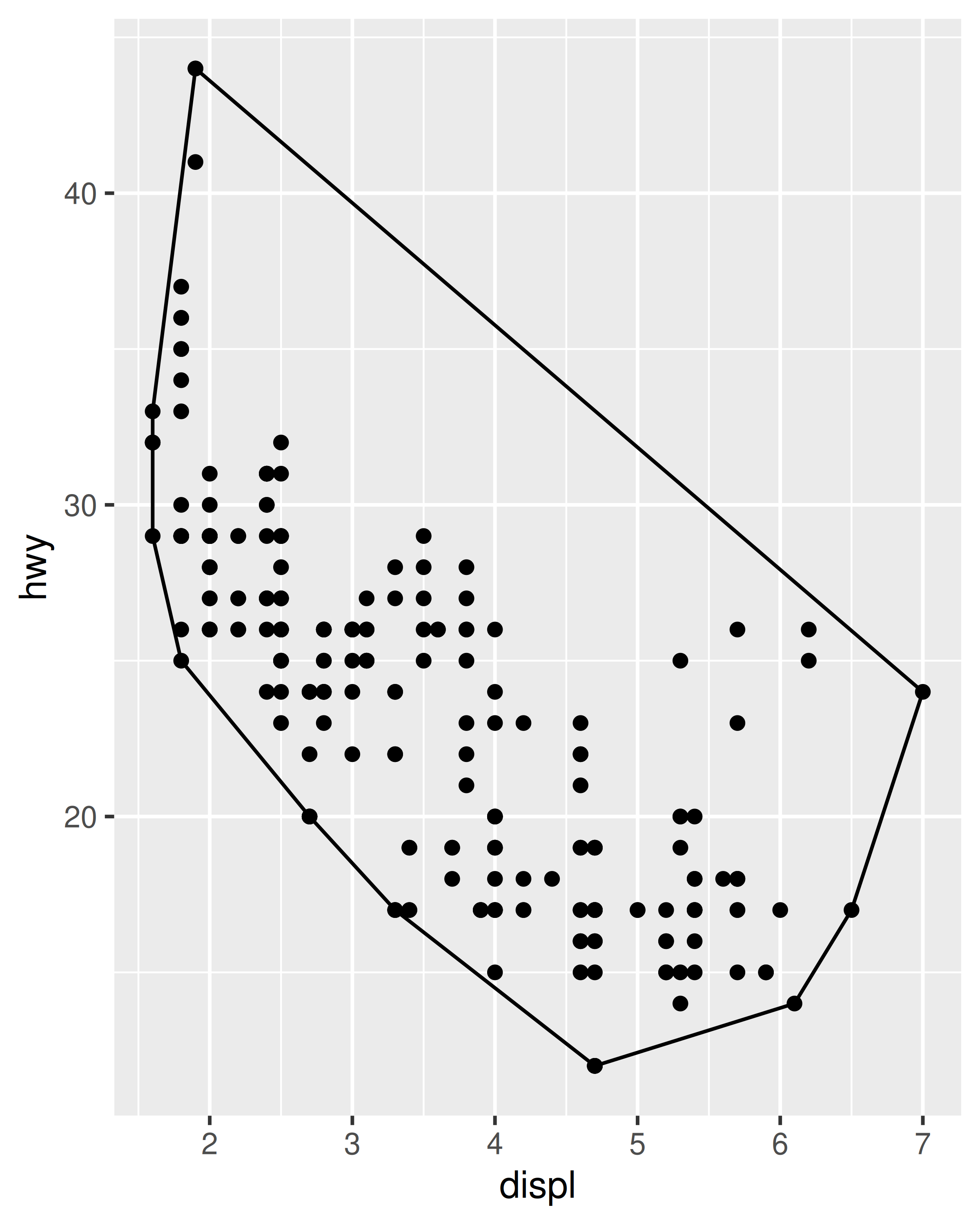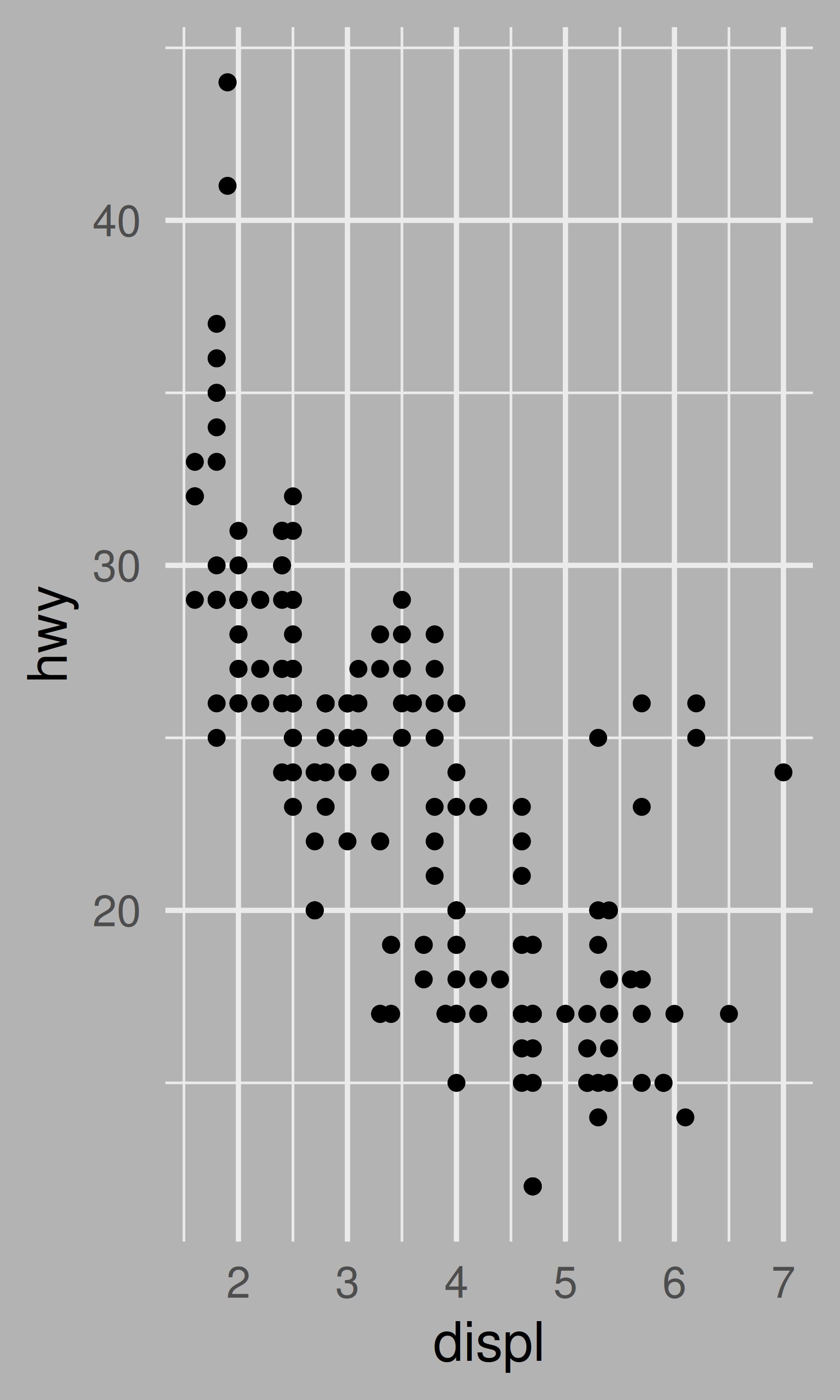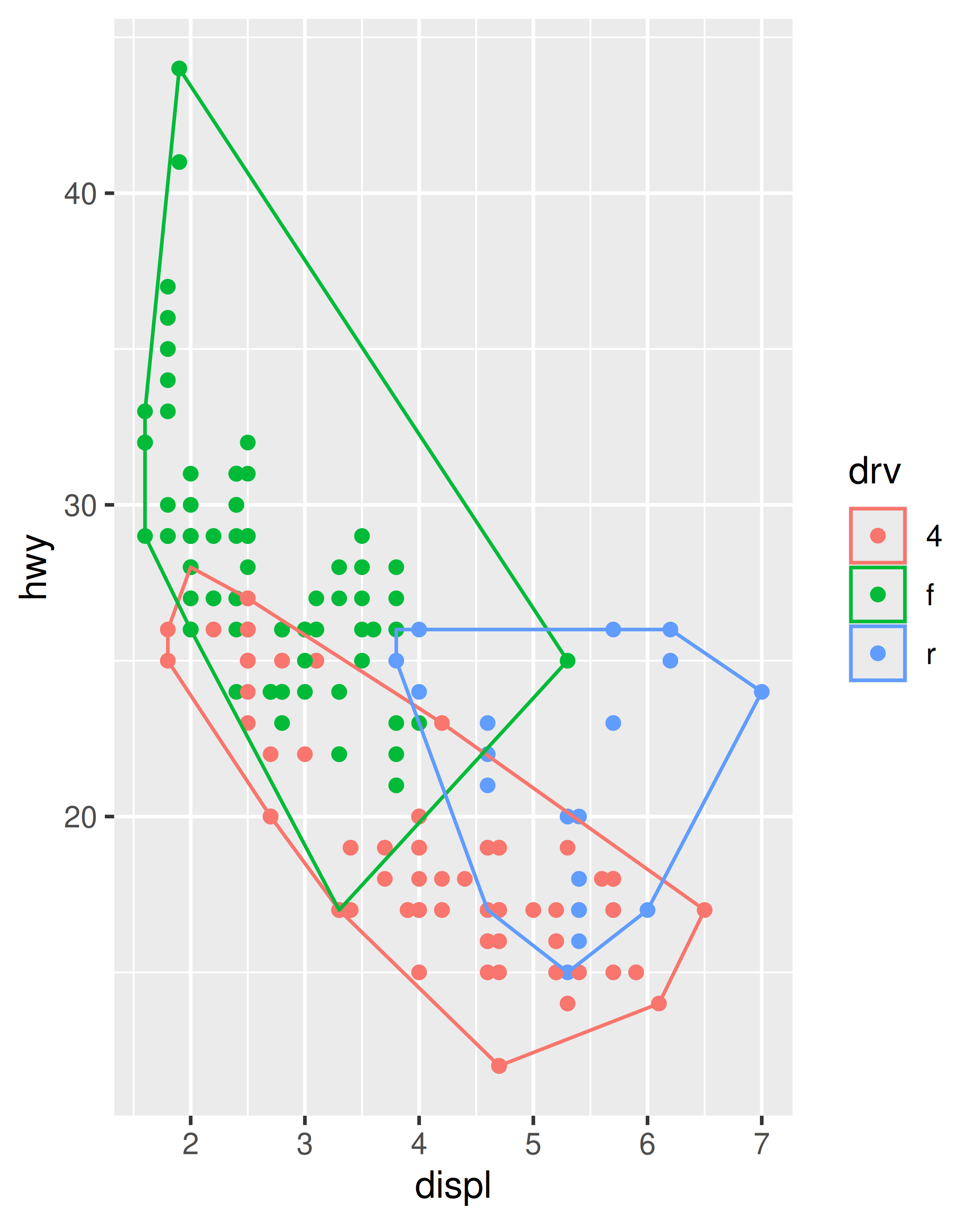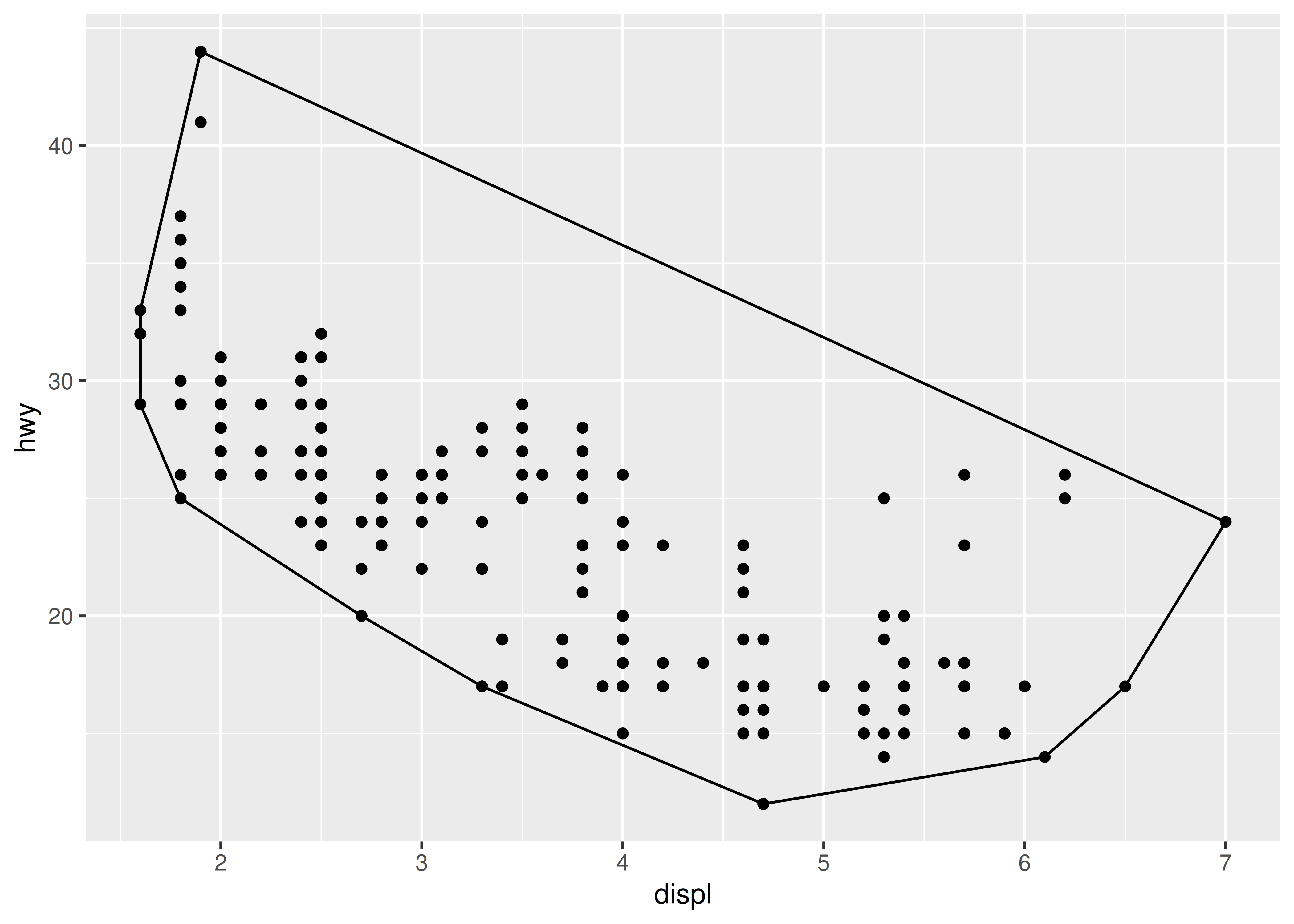 base <- ggplot(mpg, aes(displ, hwy)) + geom_point()