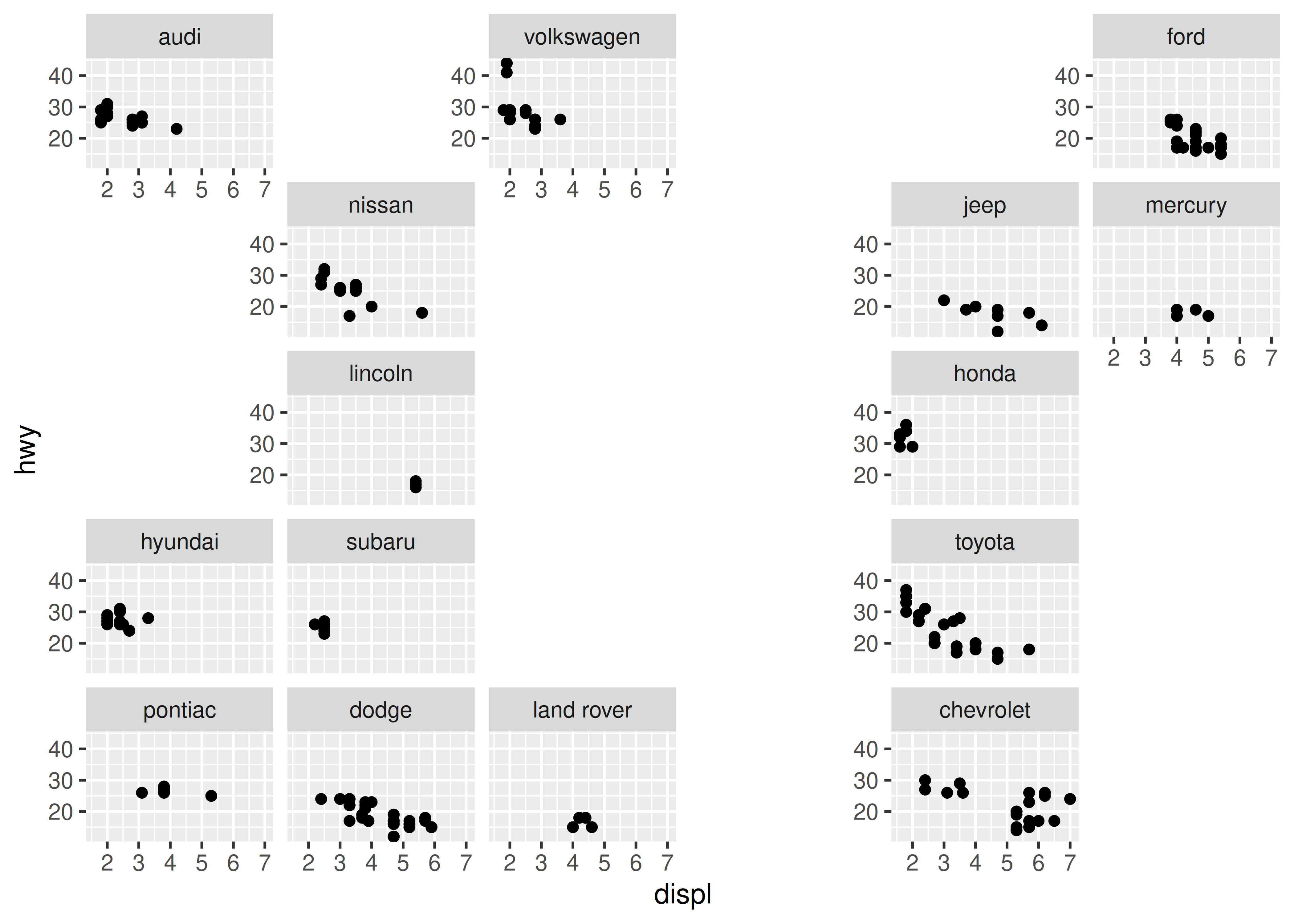 facet_scatter(vars(manufacturer), nrow = 5, ncol = 6)