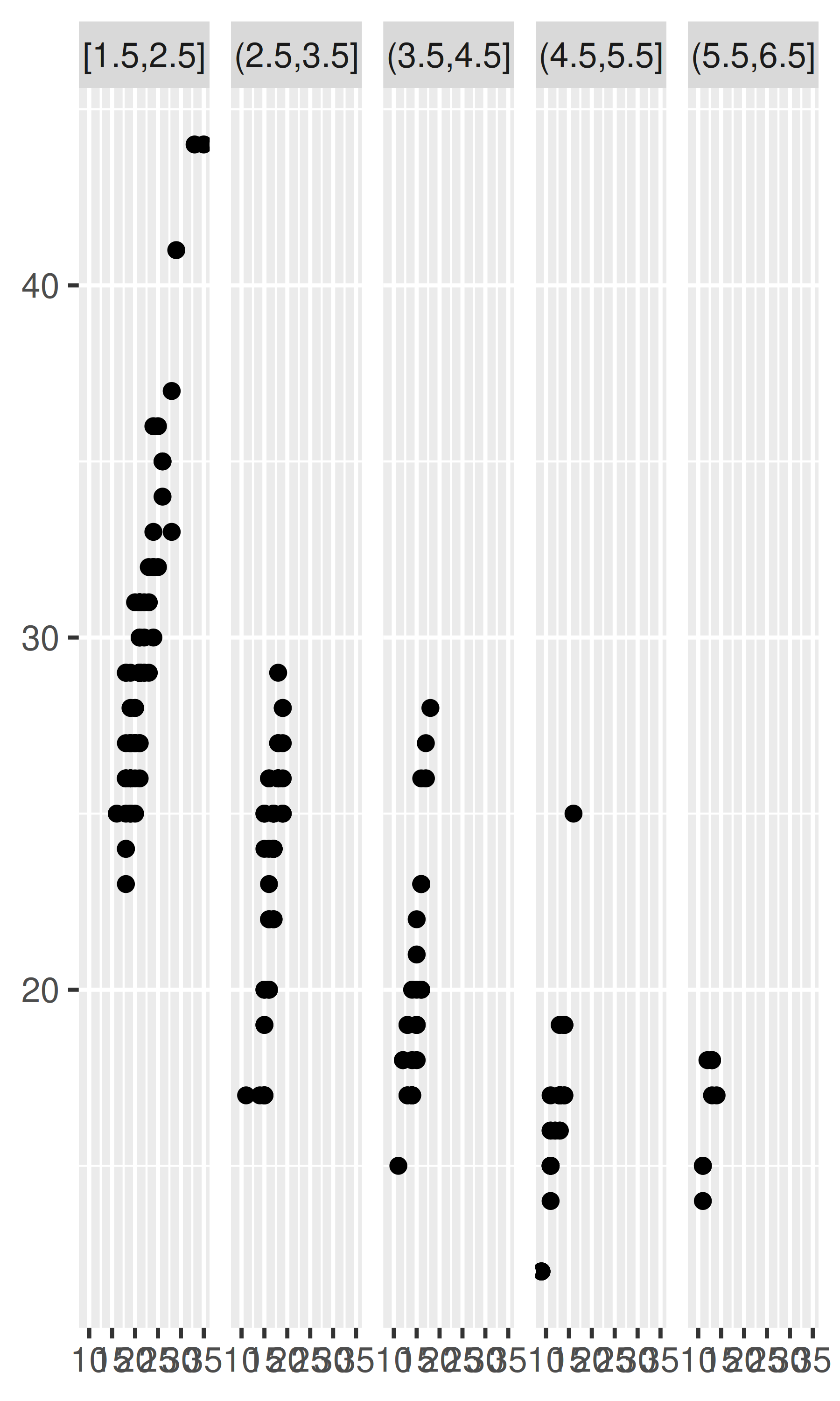 Tenga en cuenta que la fórmula de facetado no evalúa funciones, por lo que primero debe crear una nueva variable que contenga los datos discretizados.