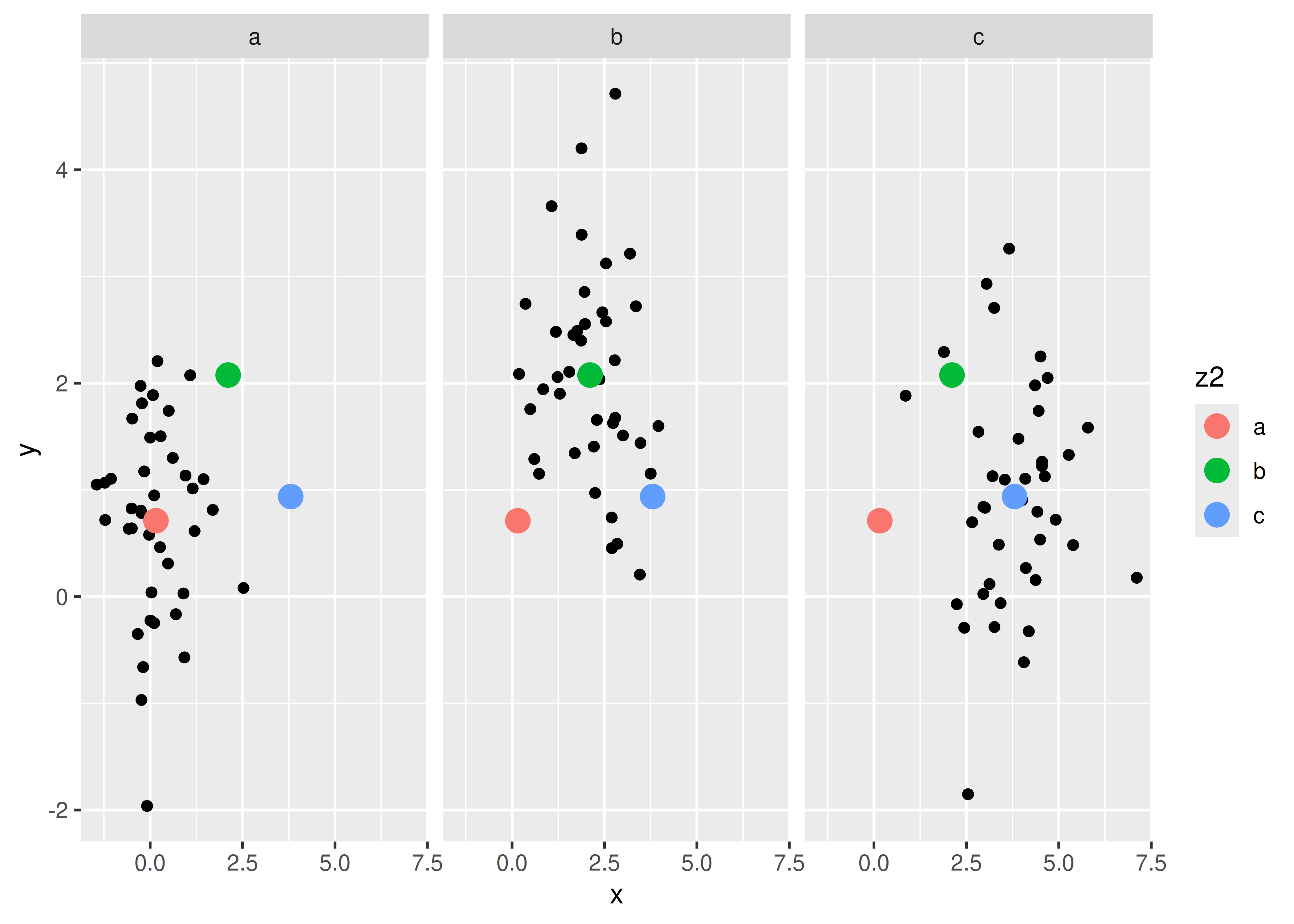 Las comparaciones entre facetas a menudo se benefician de alguna anotación reflexiva. Por ejemplo, en este caso podríamos mostrar la media de cada grupo en cada panel. Para ello, agrupamos y resumimos los datos utilizando el paquete dplyr, que se trata en R para ciencia de datos en https://r4ds.had.co.nz. Tenga en cuenta que necesitamos dos variables “z”: una para las facetas y otra para los colores.