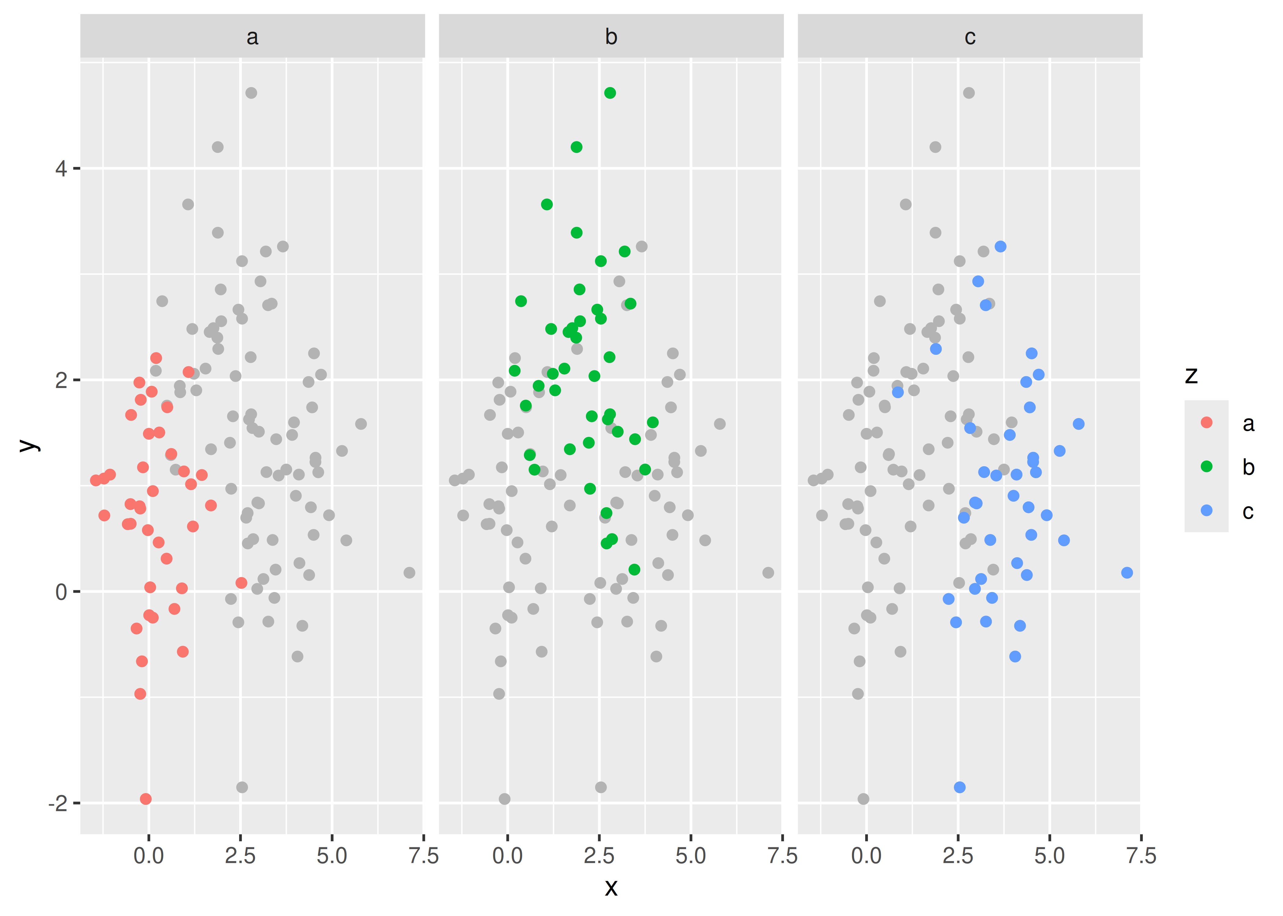 El facetado es una alternativa al uso de la estética (como el color, la forma o el tamaño) para diferenciar grupos. Ambas técnicas tienen fortalezas y debilidades, basadas en las posiciones relativas de los subconjuntos. Con el facetado, cada grupo está bastante alejado en su propio panel y no hay superposición entre los grupos. Esto es bueno si los grupos se superponen mucho, pero hace que las pequeñas diferencias sean más difíciles de ver. Cuando se utiliza la estética para diferenciar grupos, los grupos están muy juntos y pueden superponerse, pero las pequeñas diferencias son más fáciles de ver.