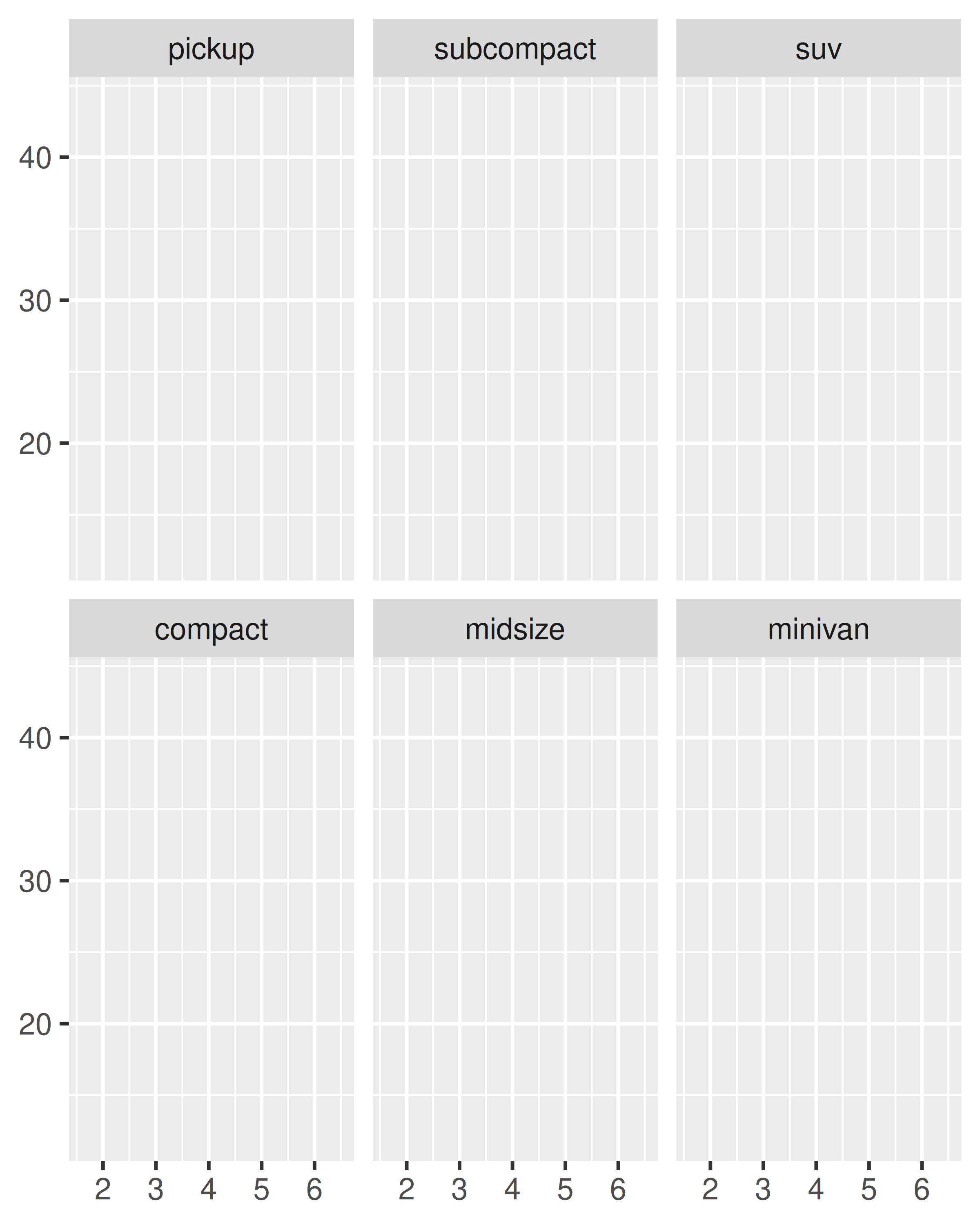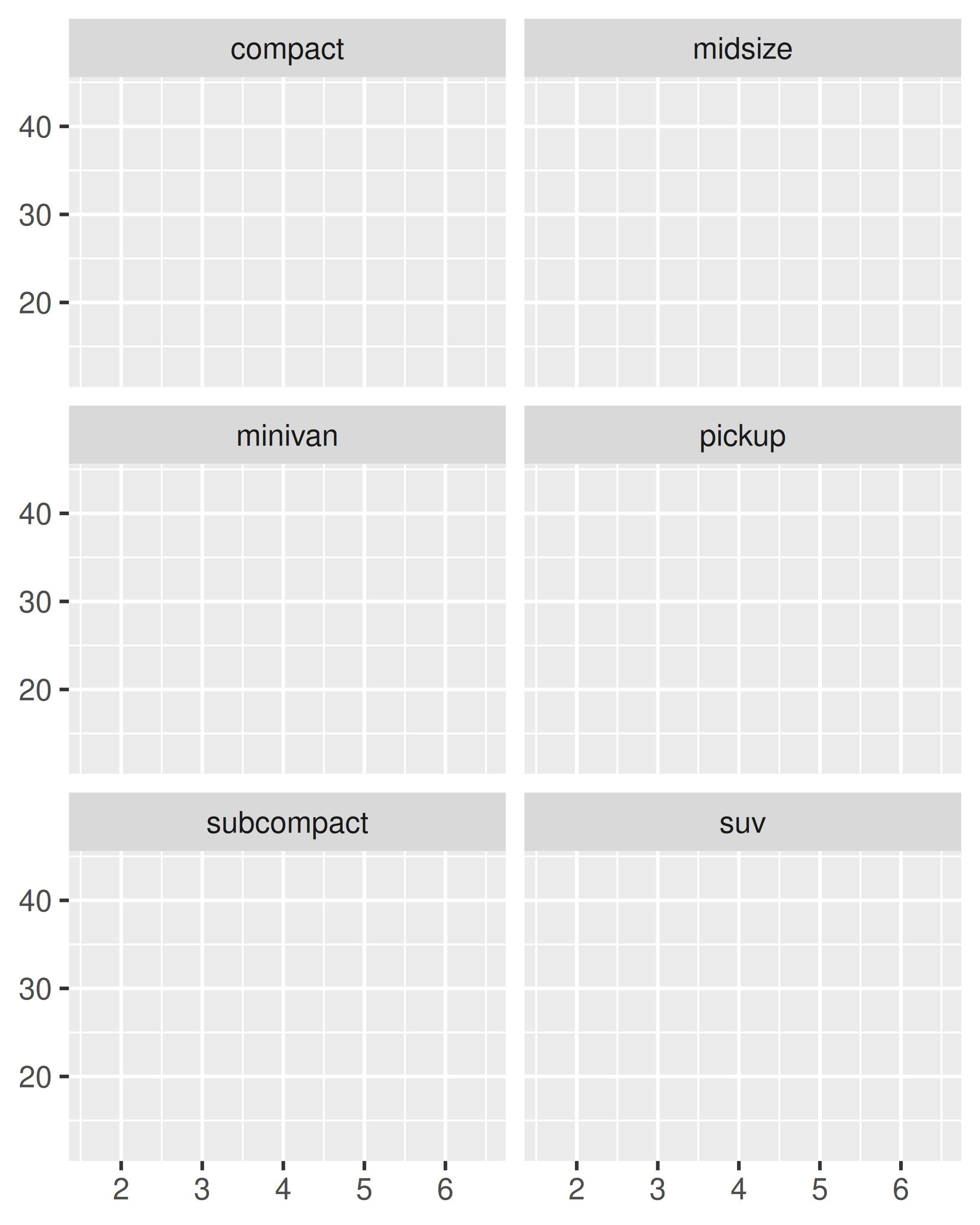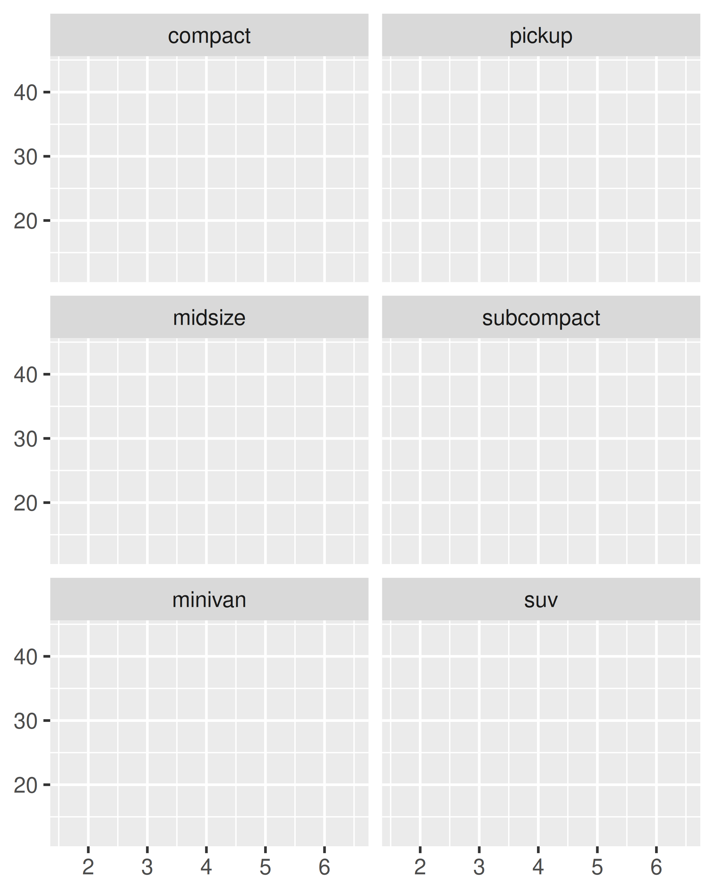 facet_grid() (izquierda) es fundamentalmente 2d y se compone de dos componentes independientes. facet_wrap() (derecha) es 1d, pero está envuelto en 2d para ahorrar espacio.Los gráficos facetados tienen la capacidad de llenar una gran cantidad de espacio, por lo que para este capítulo usaremos un subconjunto del conjunto de datos de mpg que tiene una cantidad manejable de niveles: tres cilindros (4, 6, 8), dos tipos de tren motriz ( 4 y f), y seis clases.