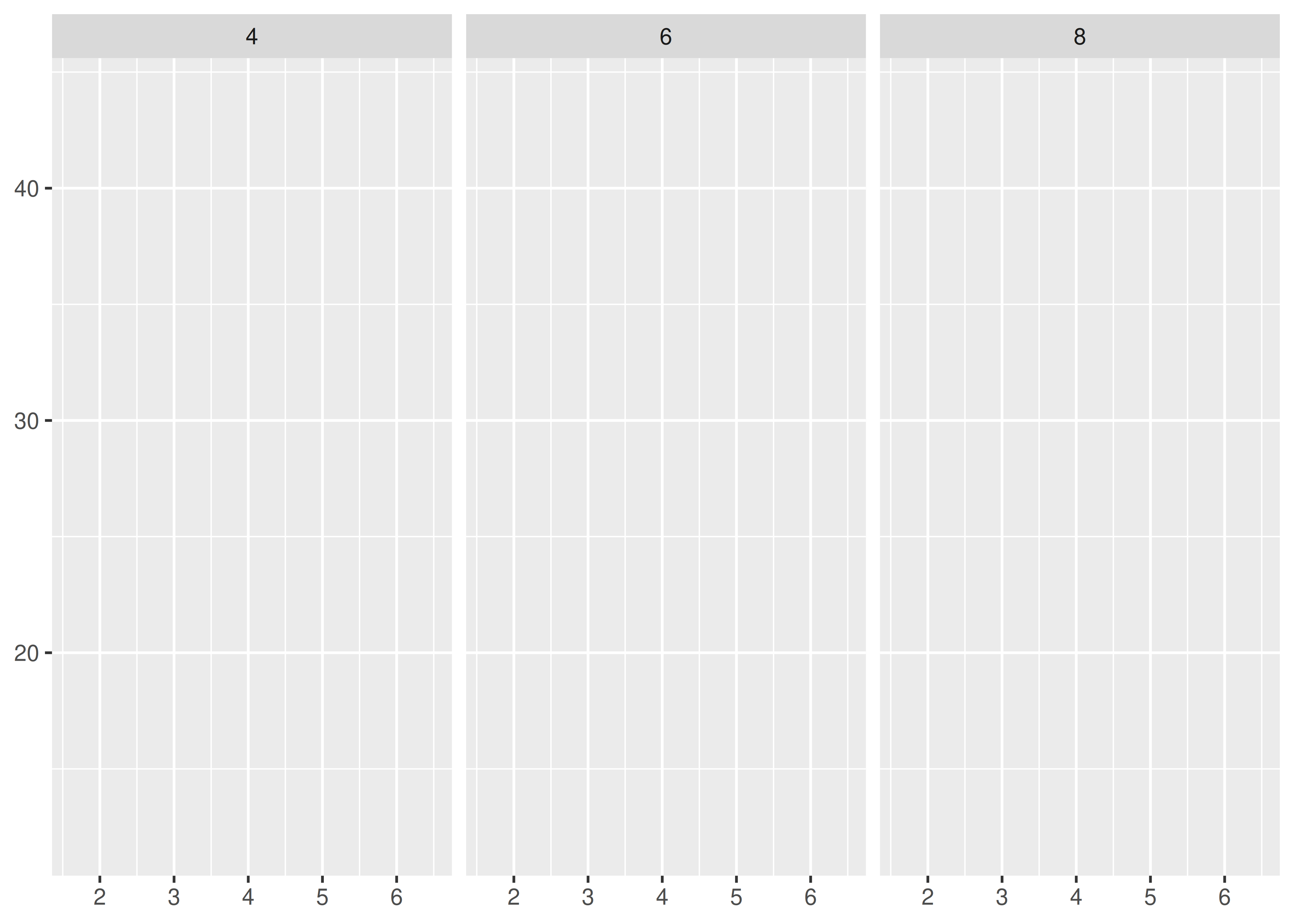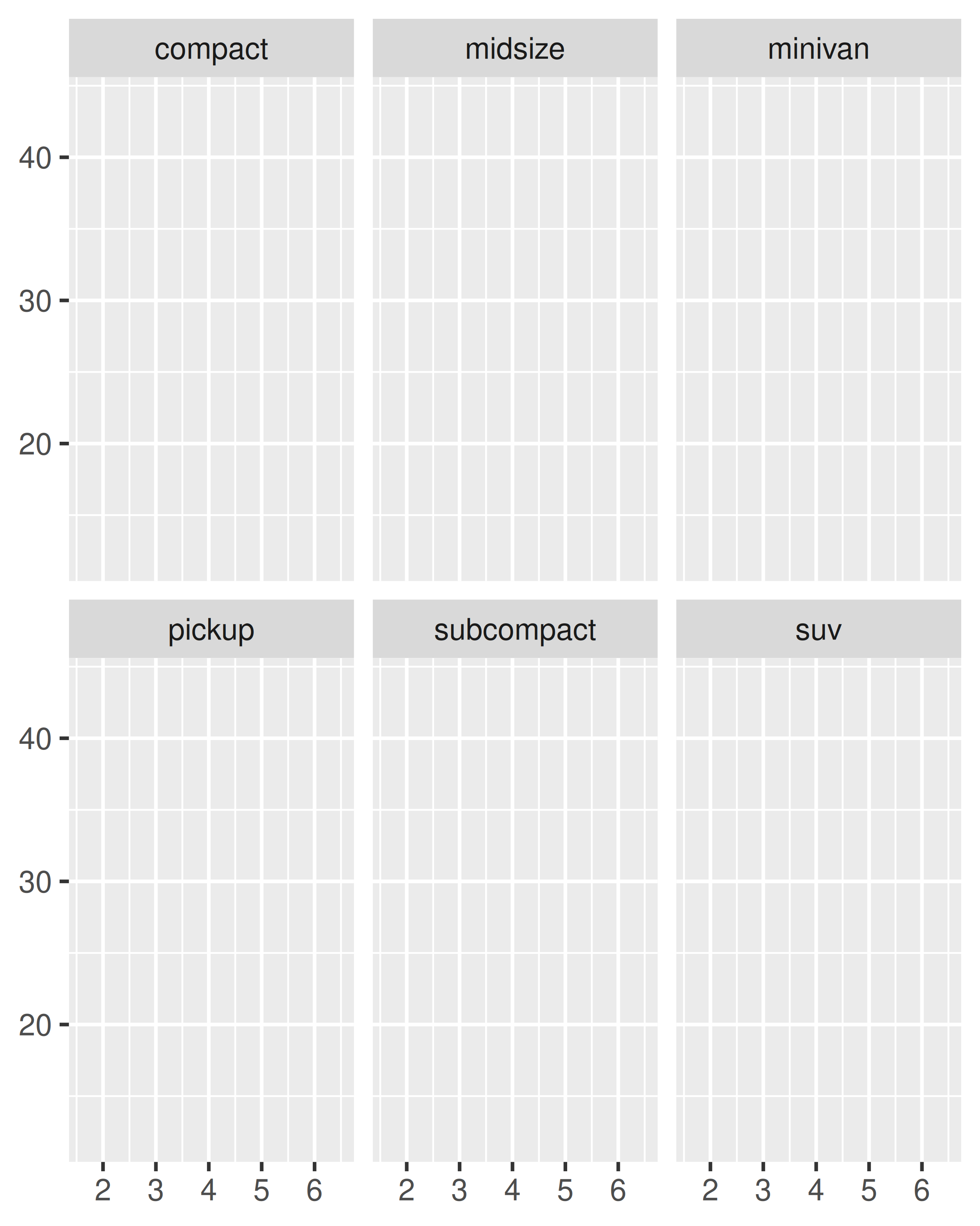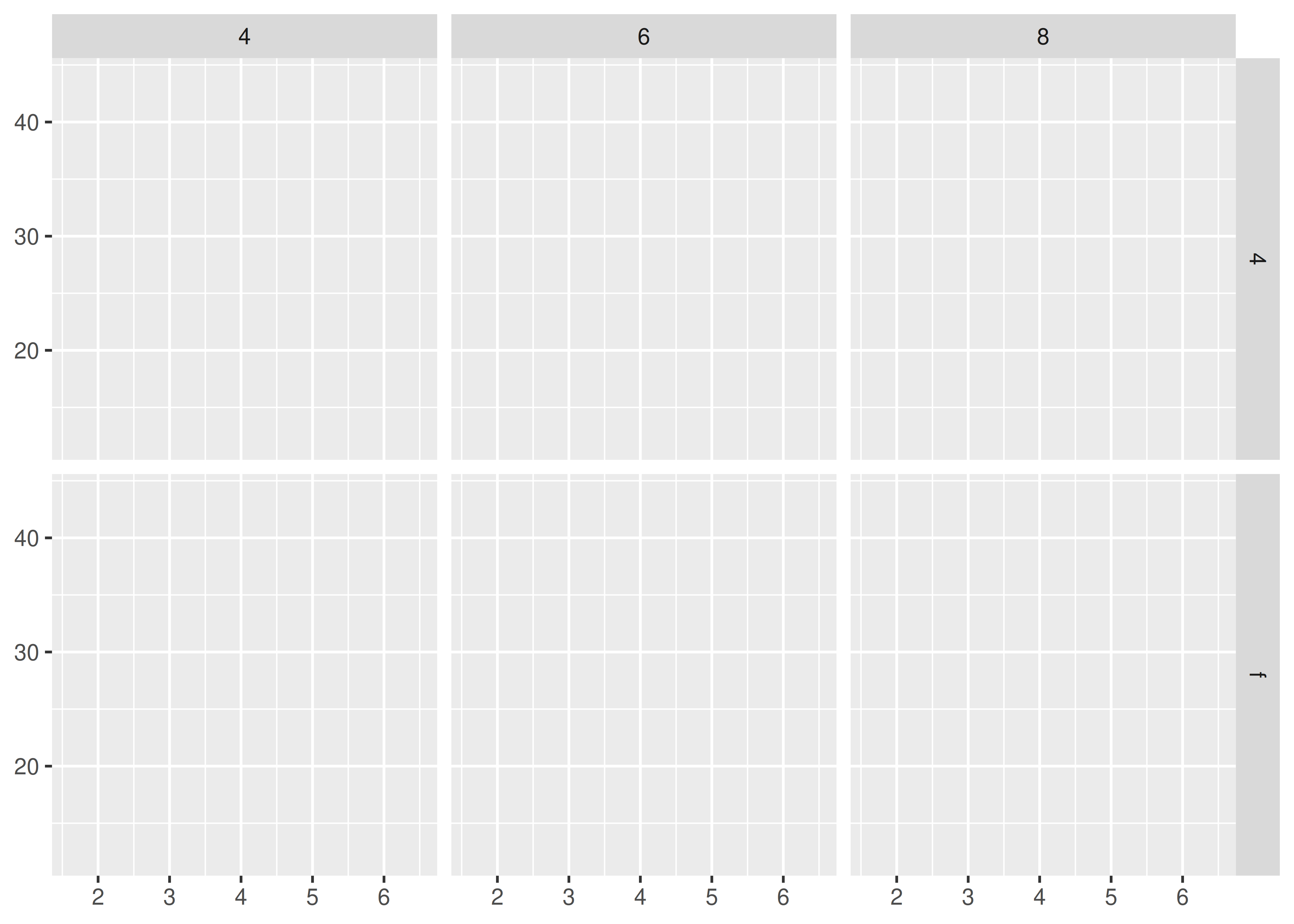 facet_grid() (izquierda) es fundamentalmente 2d y se compone de dos componentes independientes. facet_wrap() (derecha) es 1d, pero está envuelto en 2d para ahorrar espacio.Los gráficos facetados tienen la capacidad de llenar una gran cantidad de espacio, por lo que para este capítulo usaremos un subconjunto del conjunto de datos de mpg que tiene una cantidad manejable de niveles: tres cilindros (4, 6, 8), dos tipos de tren motriz ( 4 y f), y seis clases.