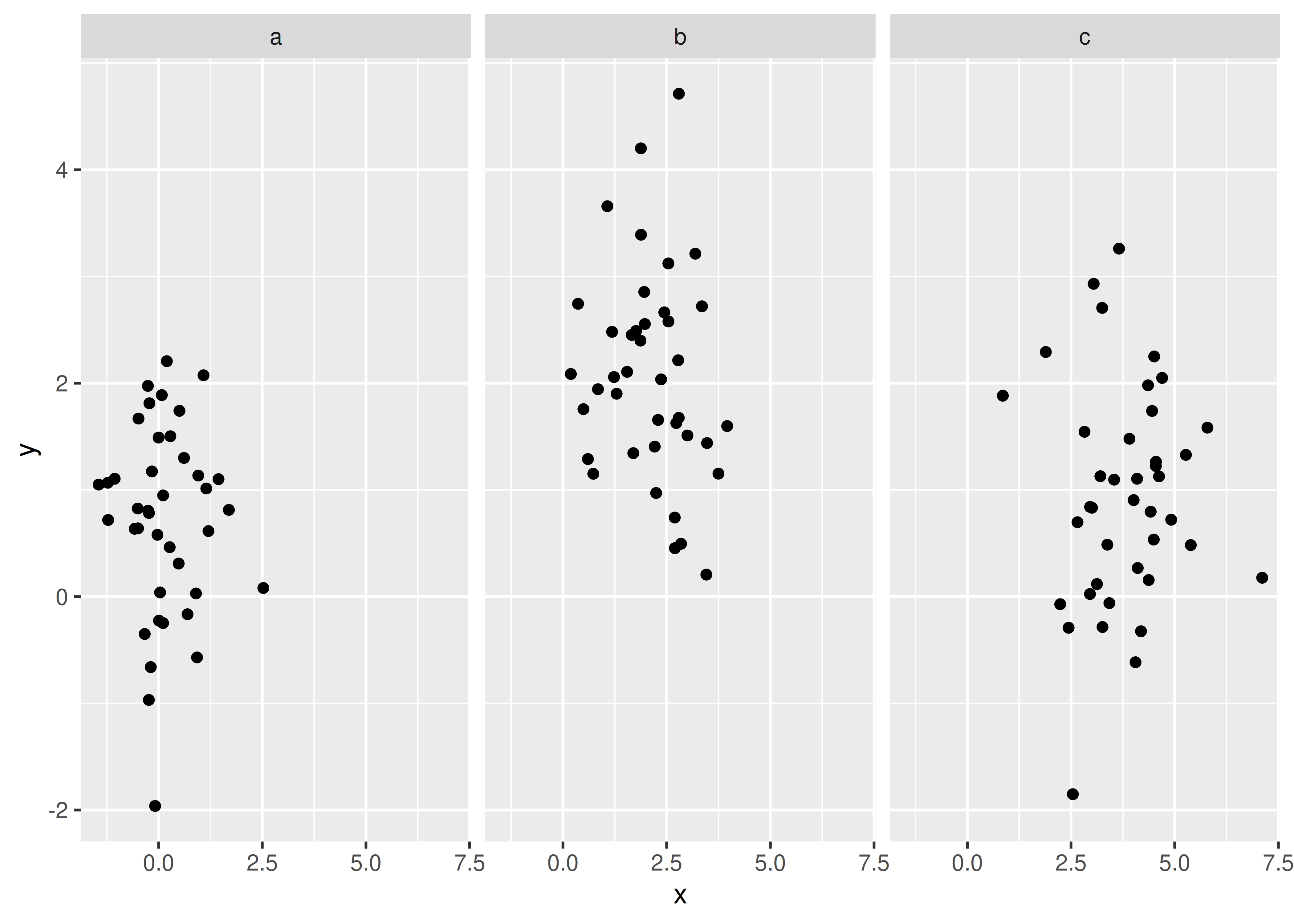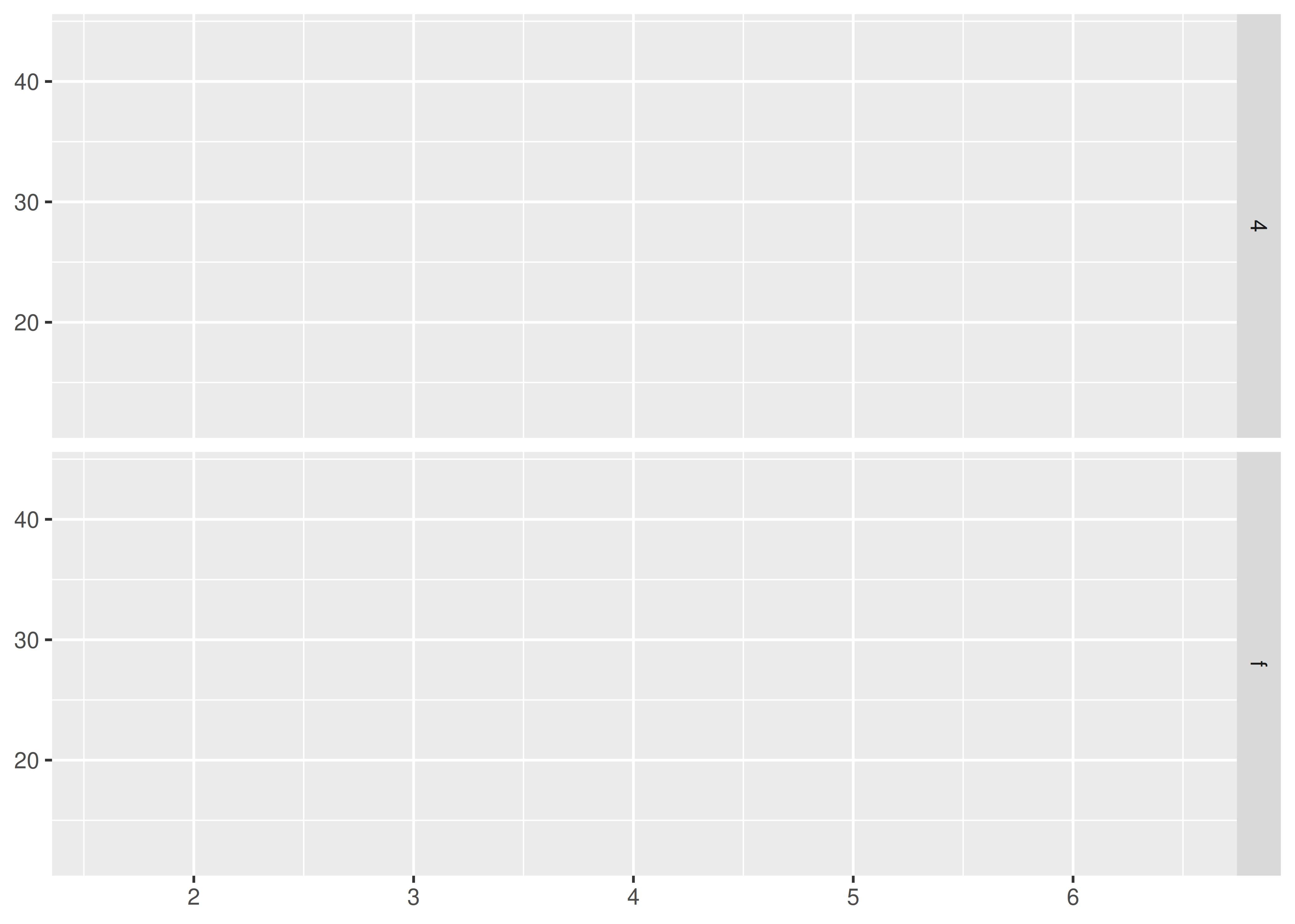 Puede utilizar varias variables en las filas o columnas, “sumándolas”, p. a + b ~ c + d. Las variables que aparecen juntas en las filas o columnas están anidadas en el sentido de que solo las combinaciones que aparecen en los datos aparecerán en el gráfico. Las variables que se especifican en filas y columnas se cruzarán: se mostrarán todas las combinaciones, incluidas aquellas que no aparecieron en el conjunto de datos original: esto puede dar como resultado paneles vacíos.