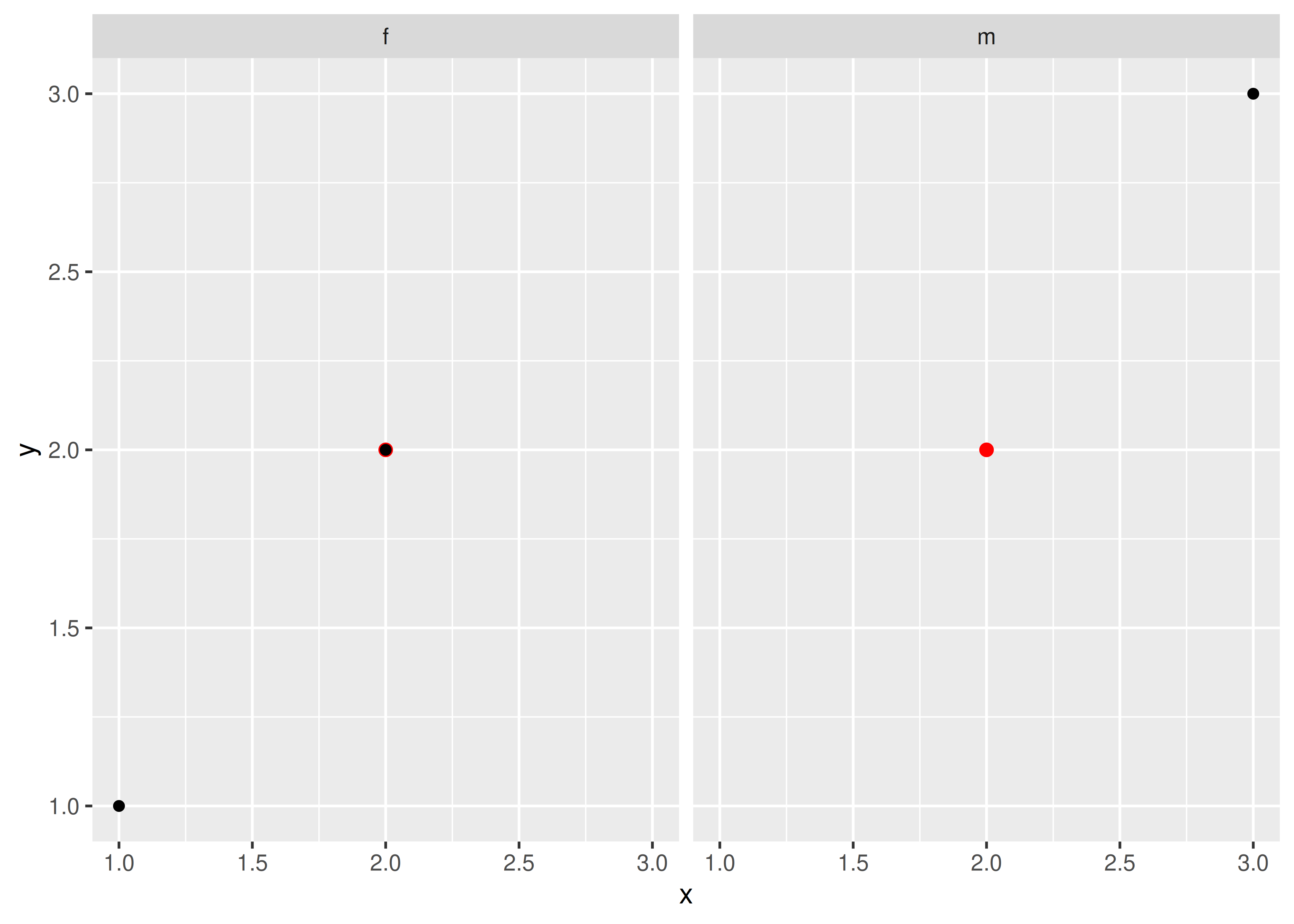 He aquí un ejemplo sencillo. Observe cómo aparece el único punto rojo de df2 en ambos paneles.