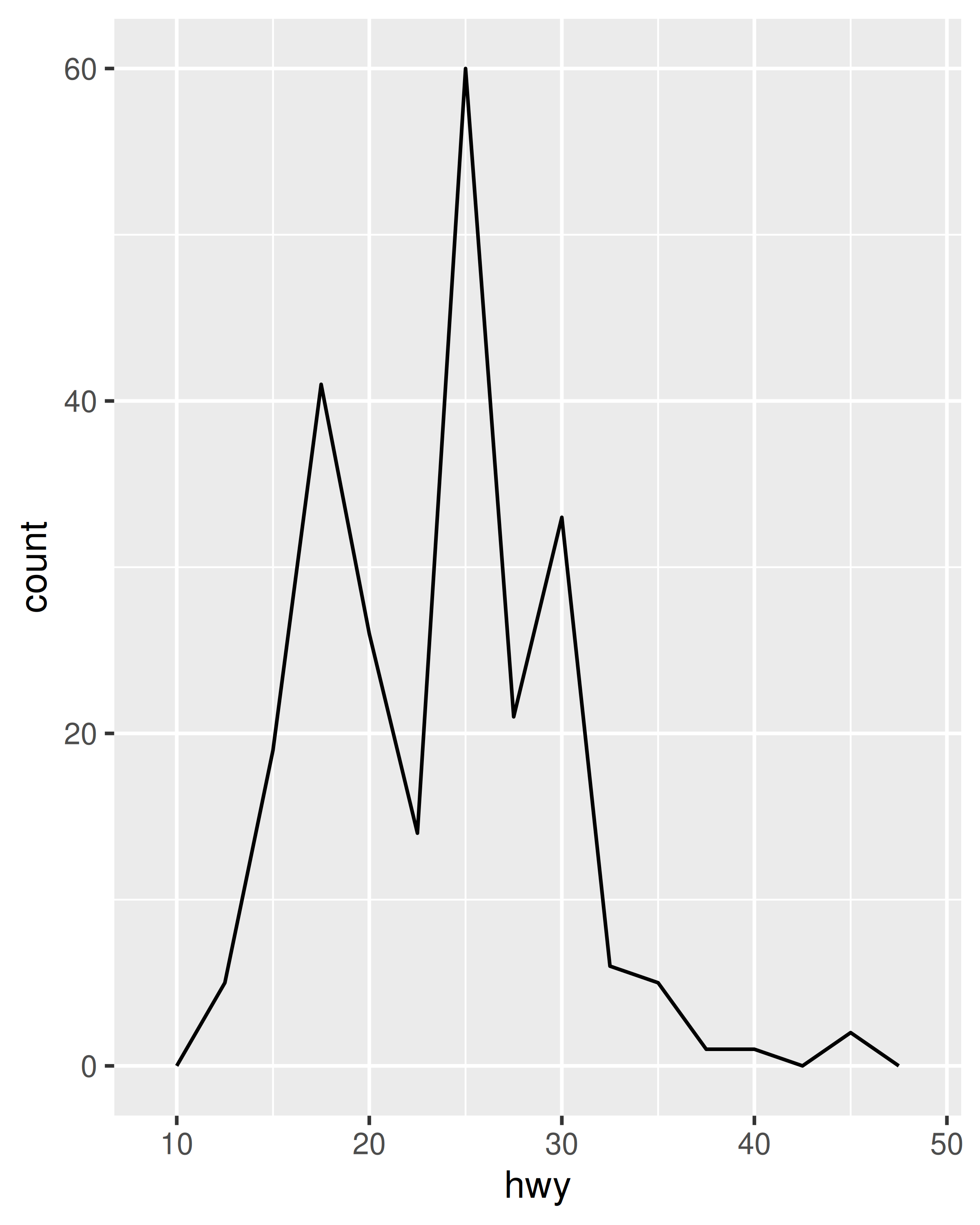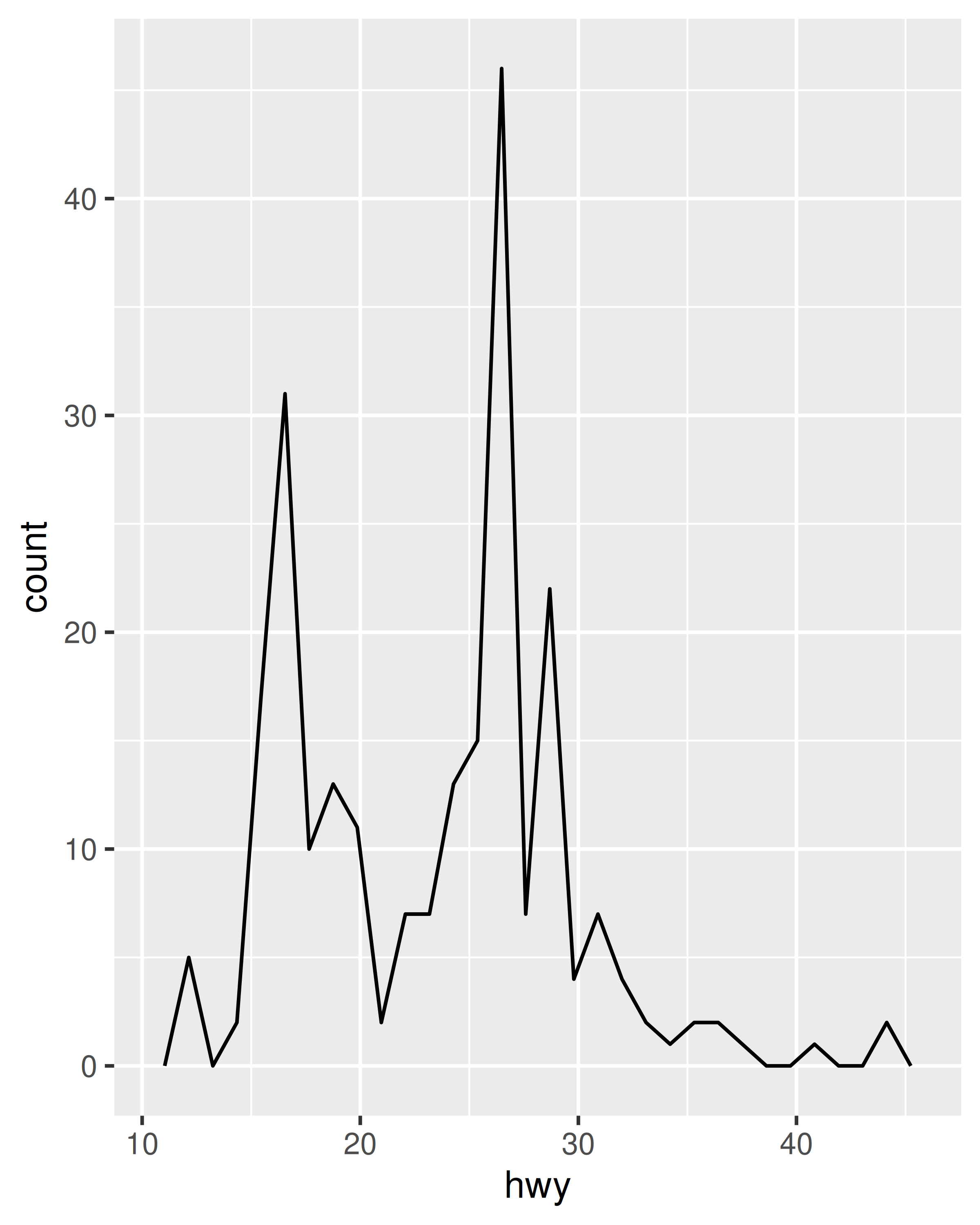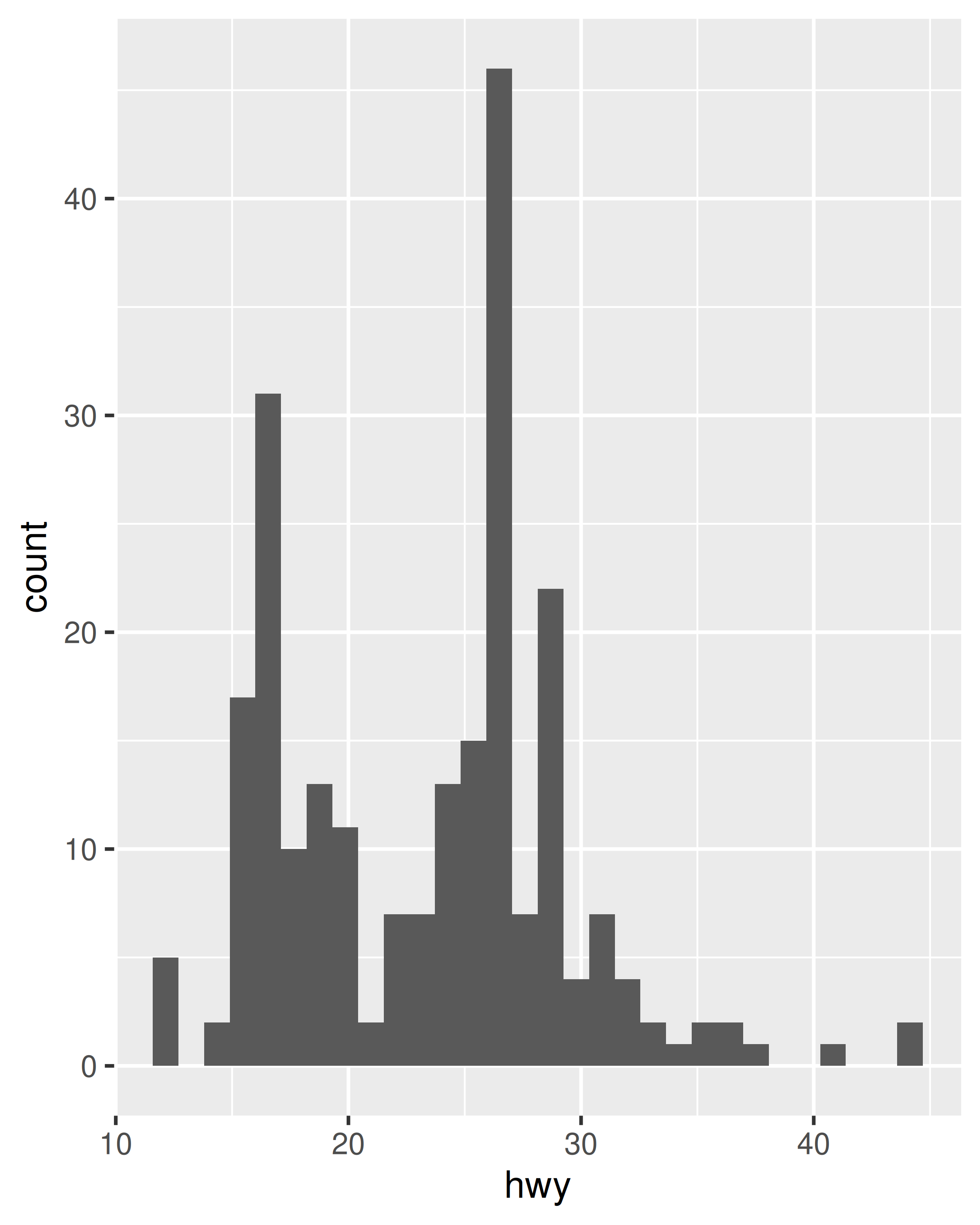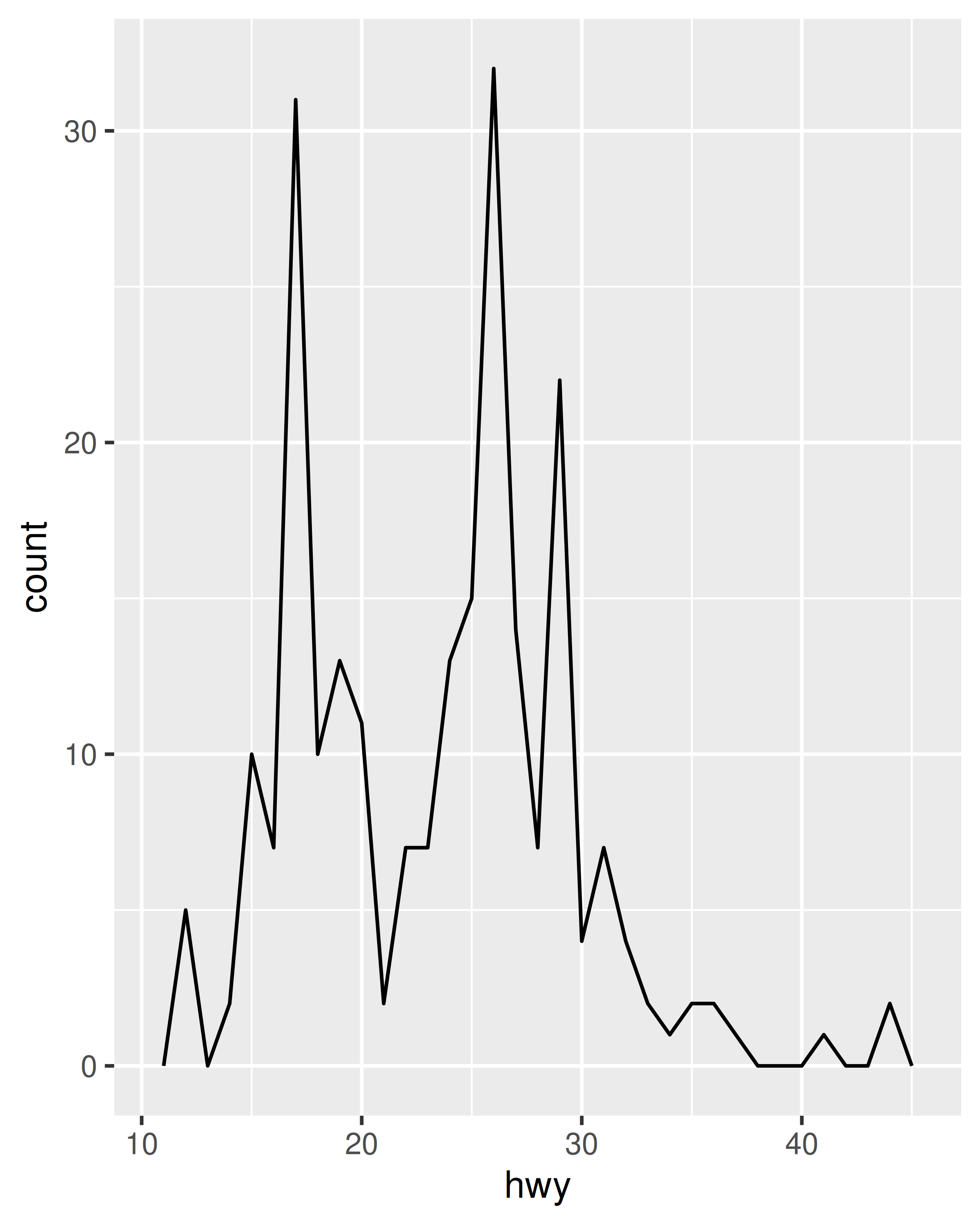 ggplot(mpg, aes(hwy)) +