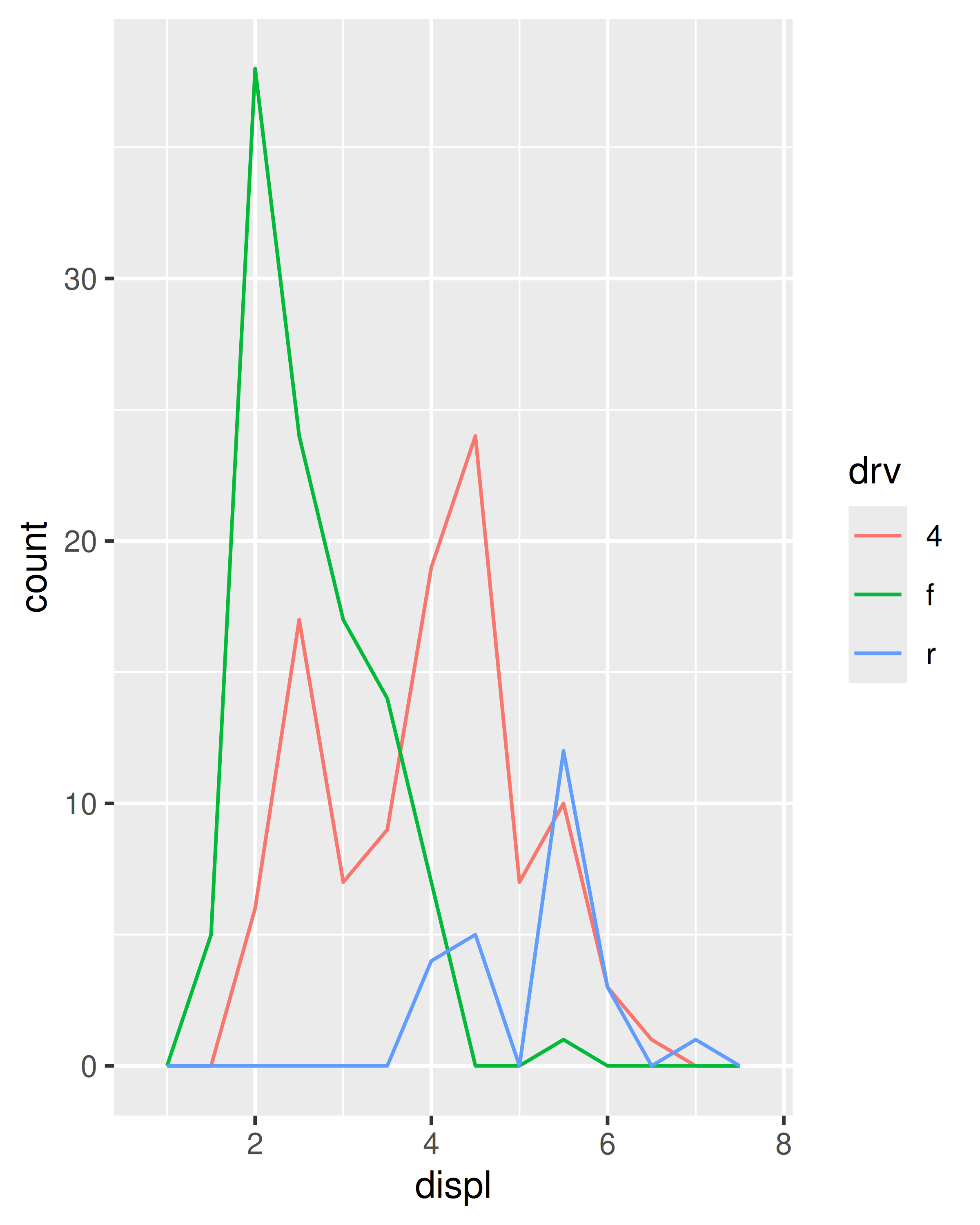 ggplot(mpg, aes(displ, colour = drv)) +
