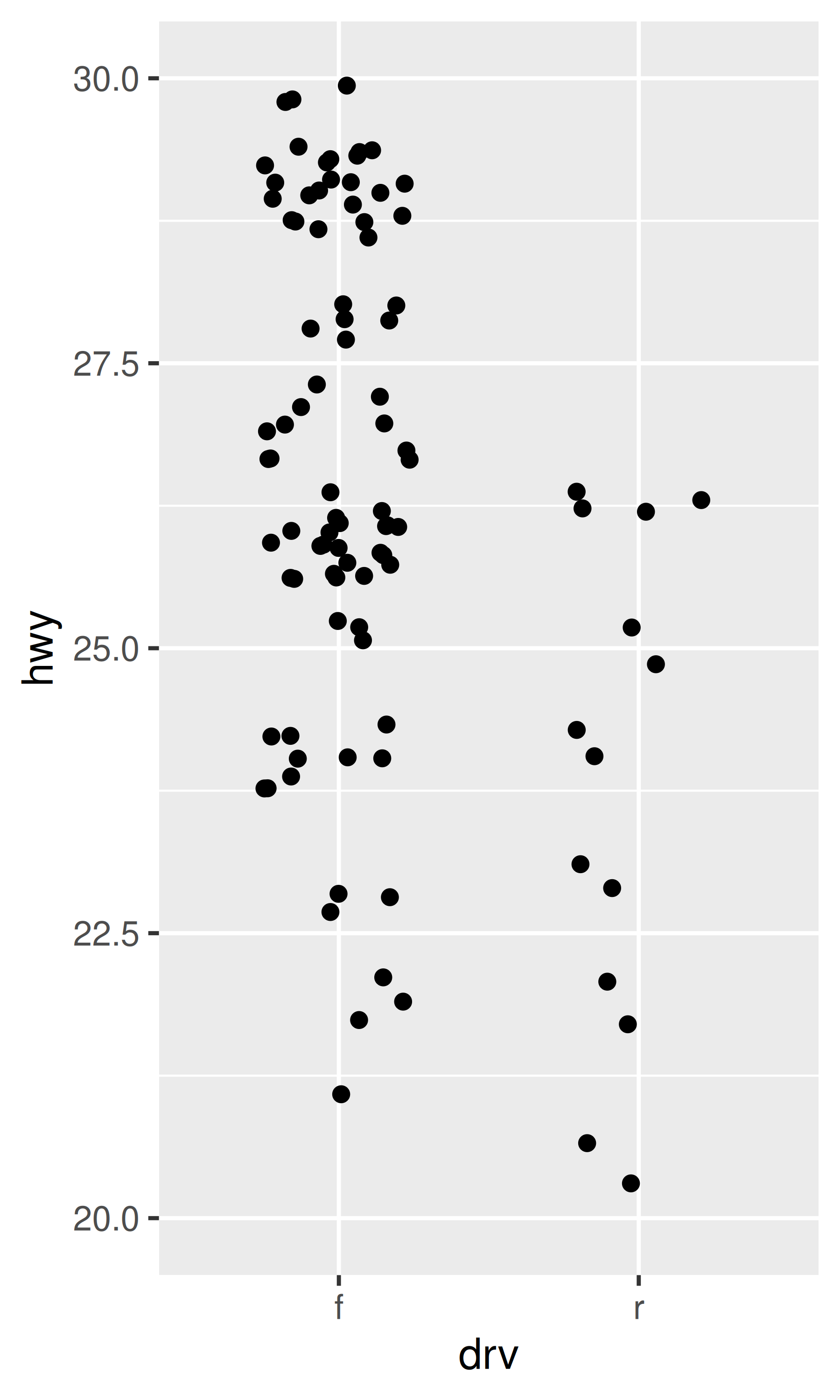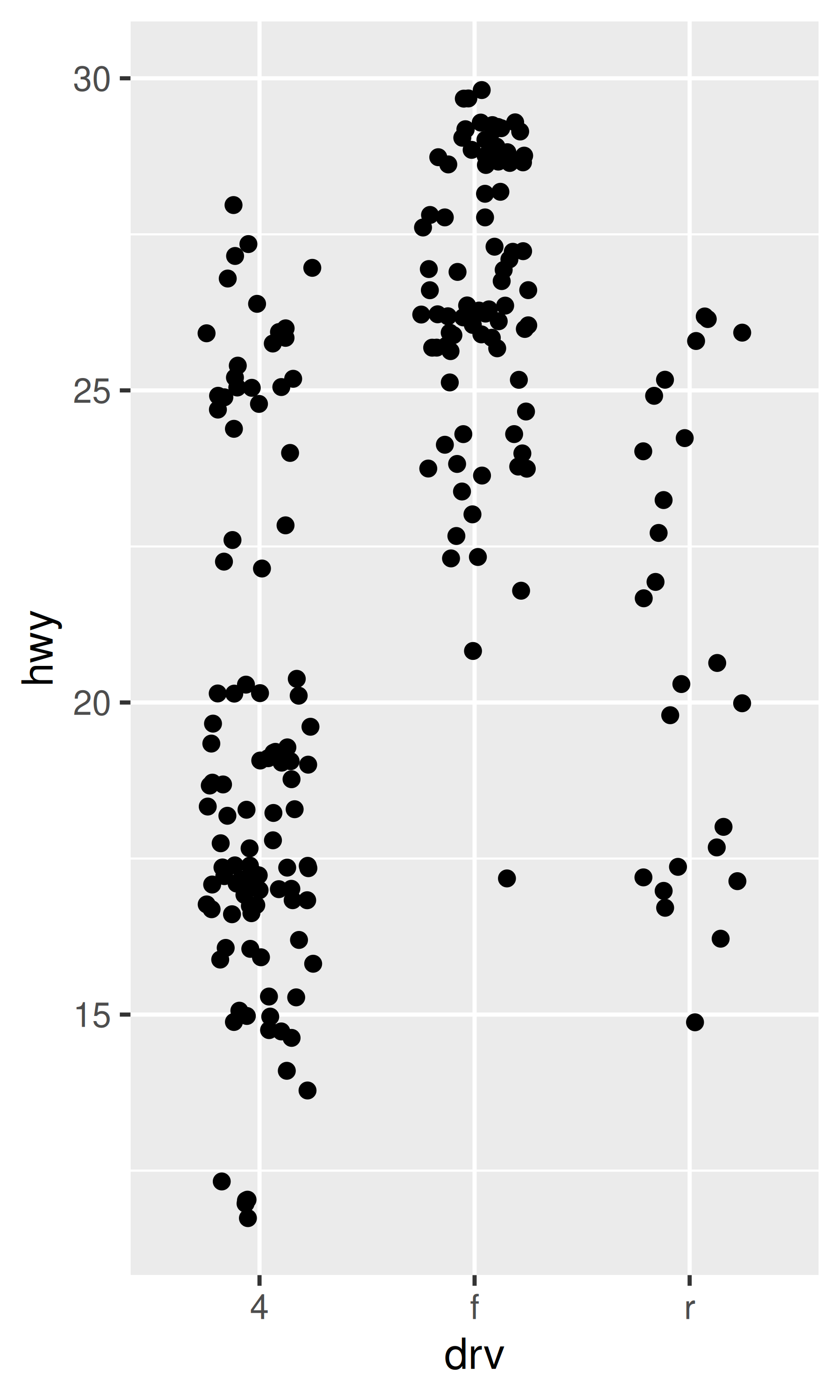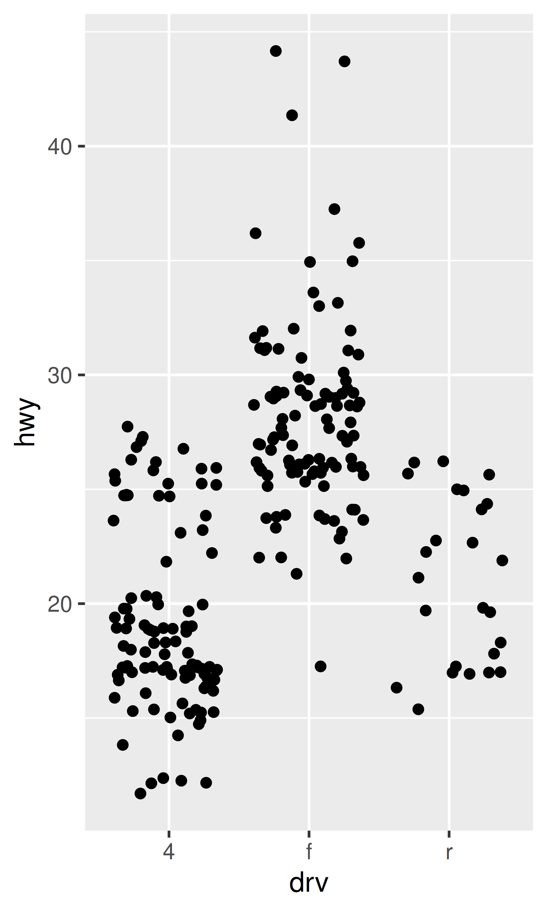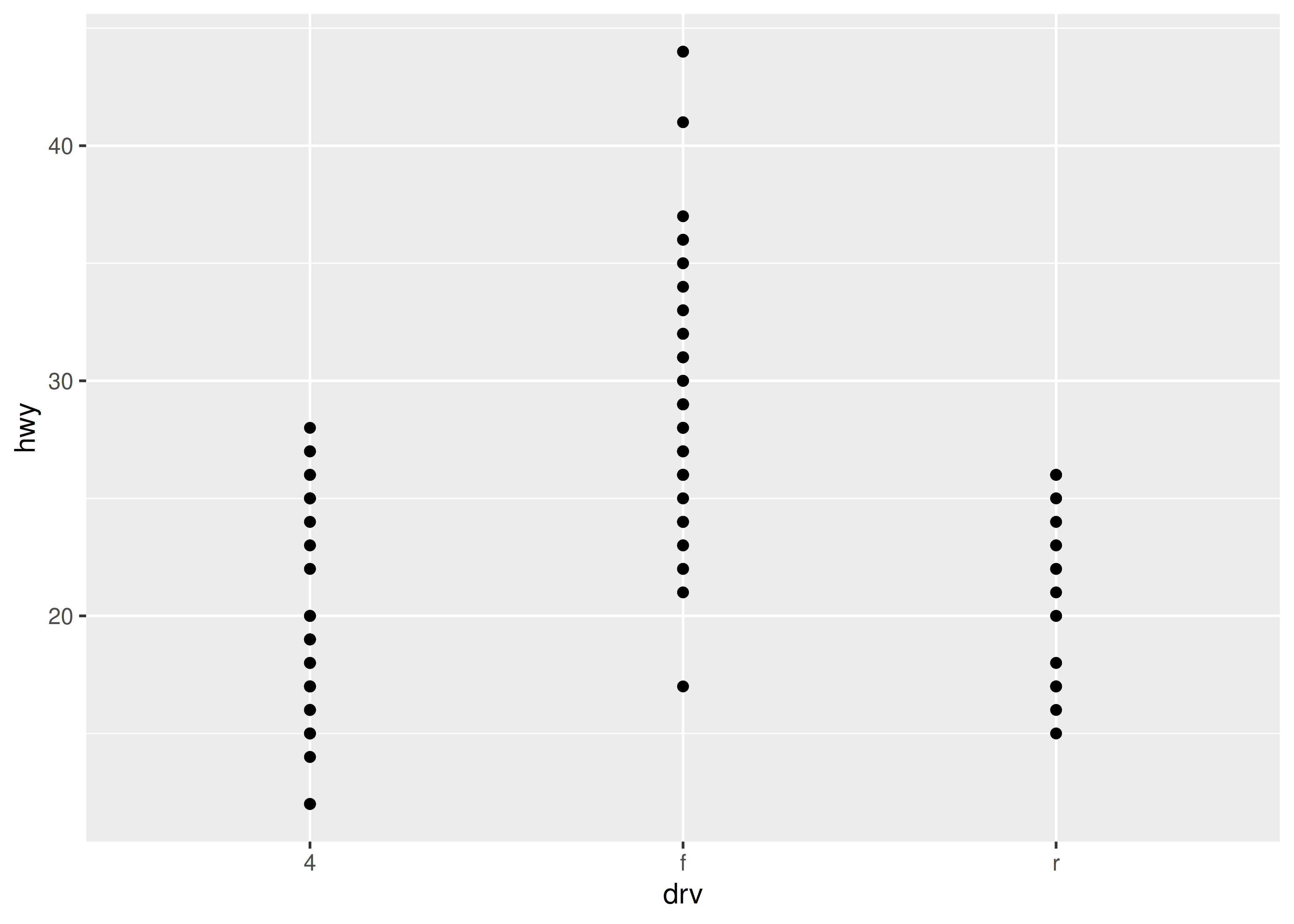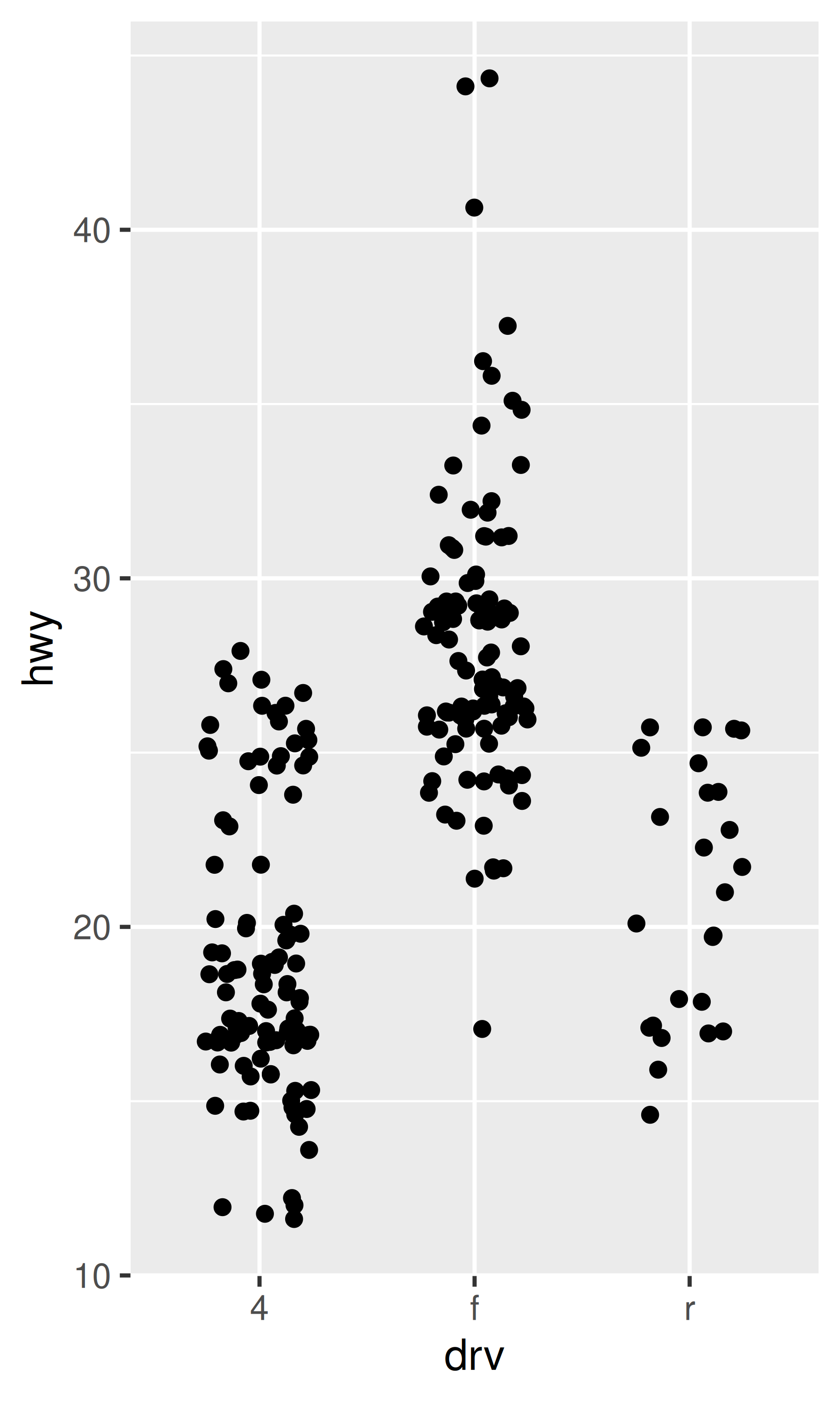 ggplot(mpg, aes(drv, hwy)) +