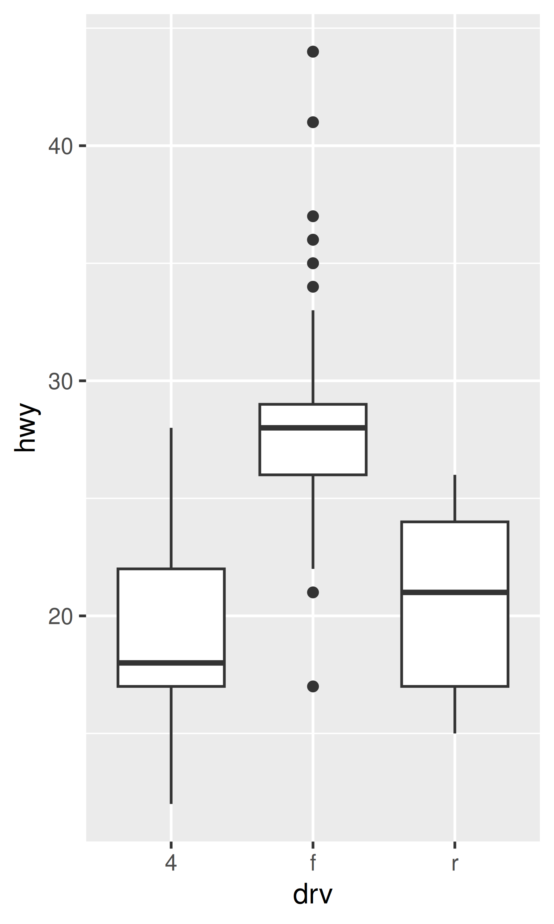 ggplot(mpg, aes(drv, hwy)) + geom_boxplot()