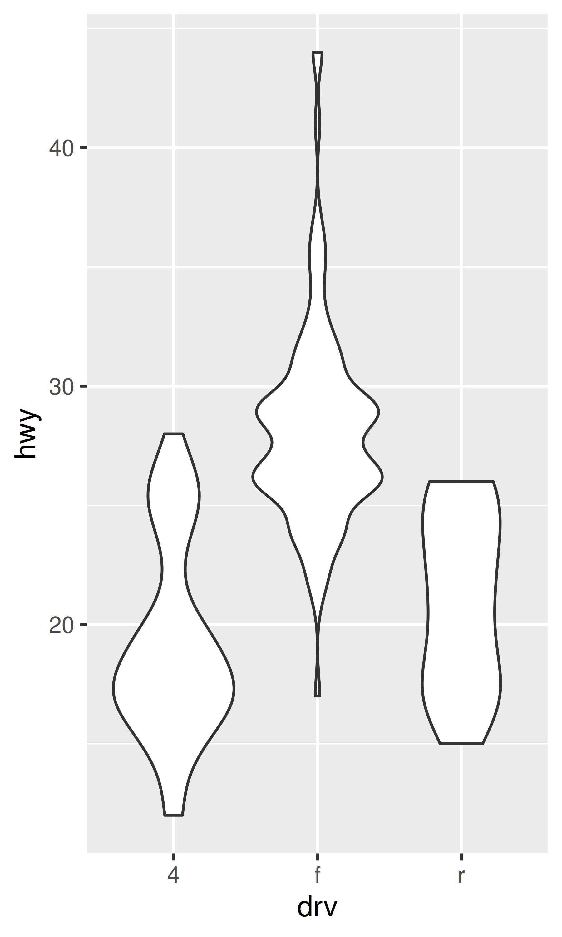 ggplot(mpg, aes(drv, hwy)) + geom_violin()