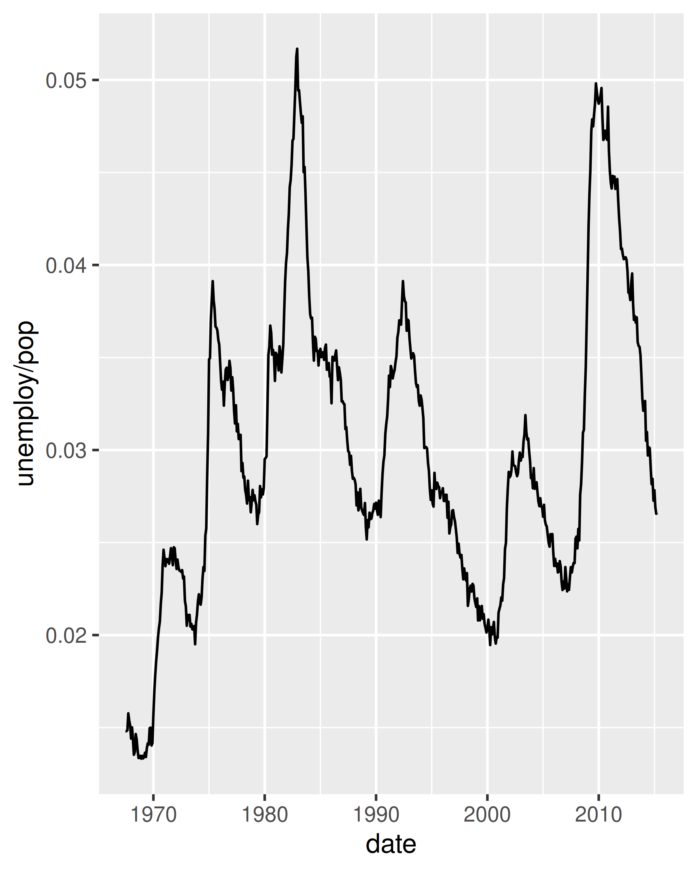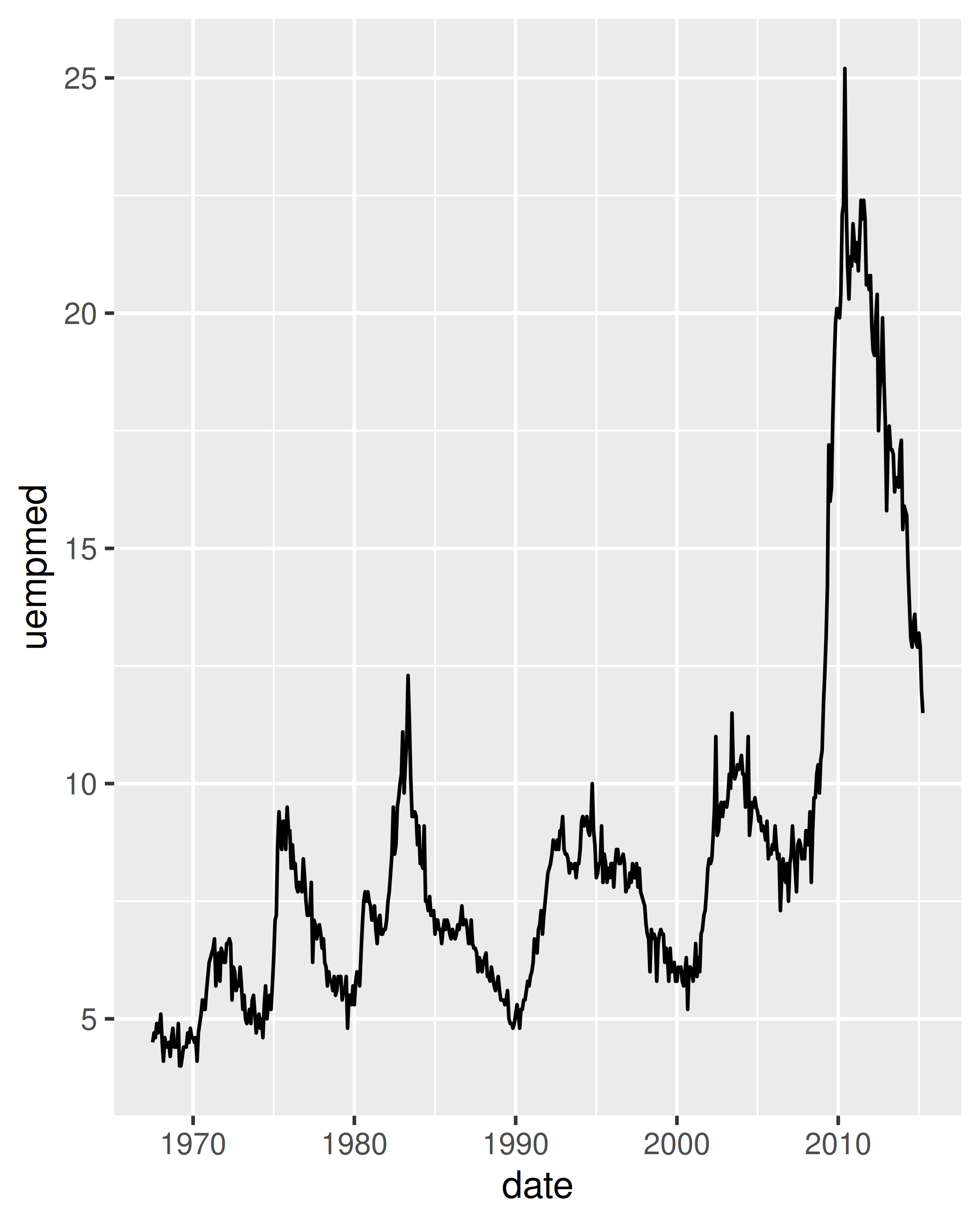Debido a que la variable año en el conjunto de datos mpg solo tiene dos valores, mostraremos algunos gráficos de series temporales utilizando el conjunto de datos economics, que contiene datos económicos sobre los EE. UU. medidos durante los últimos 40 años. La siguiente figura muestra dos gráficos de desempleo a lo largo del tiempo, ambos producidos usando geom_line(). El primero muestra la tasa de desempleo mientras que el segundo muestra la mediana del número de semanas desempleadas. Ya podemos ver algunas diferencias en estas dos variables, particularmente en el último pico, donde el porcentaje de desempleo es menor que en los picos anteriores, pero la duración del desempleo es alta.
