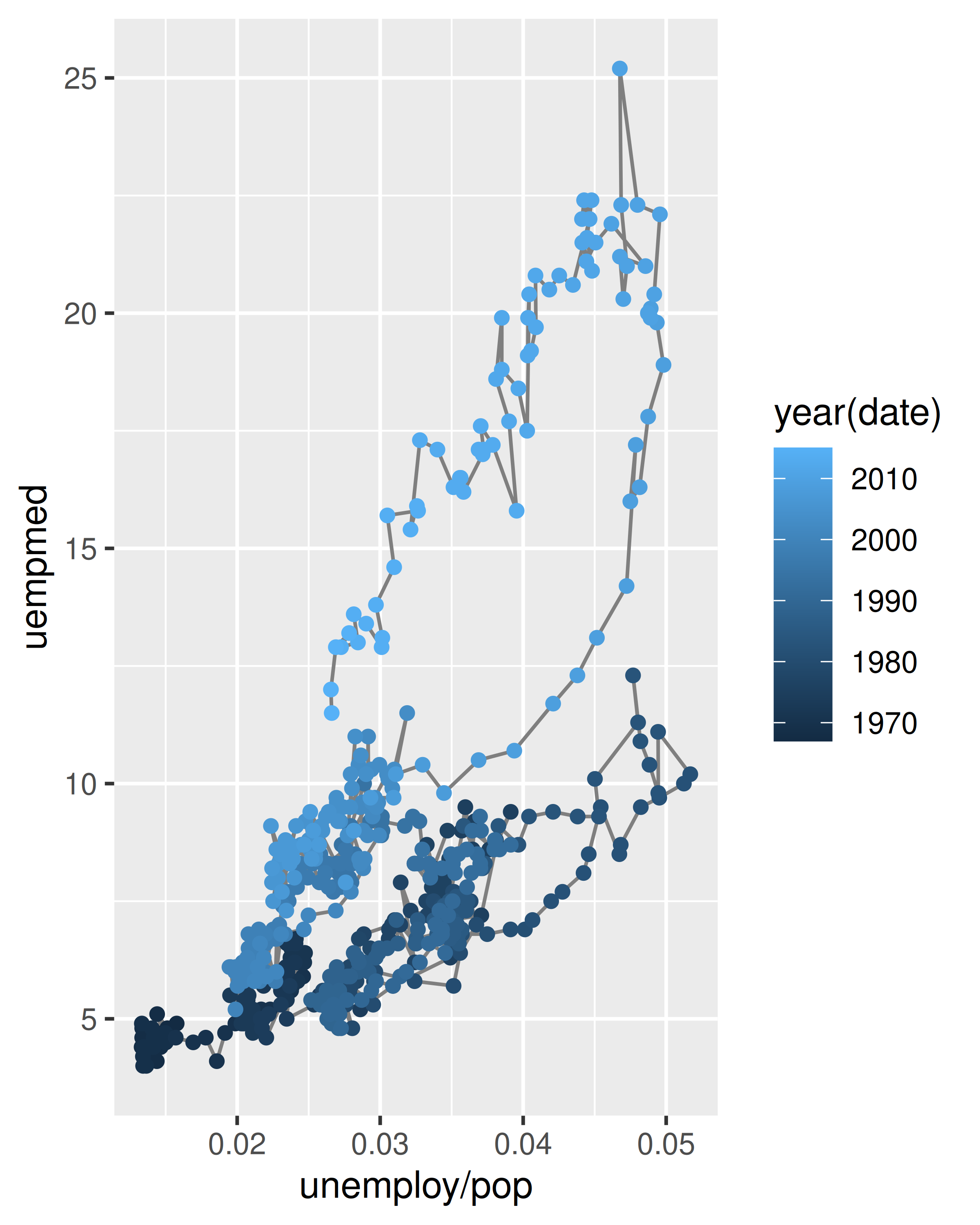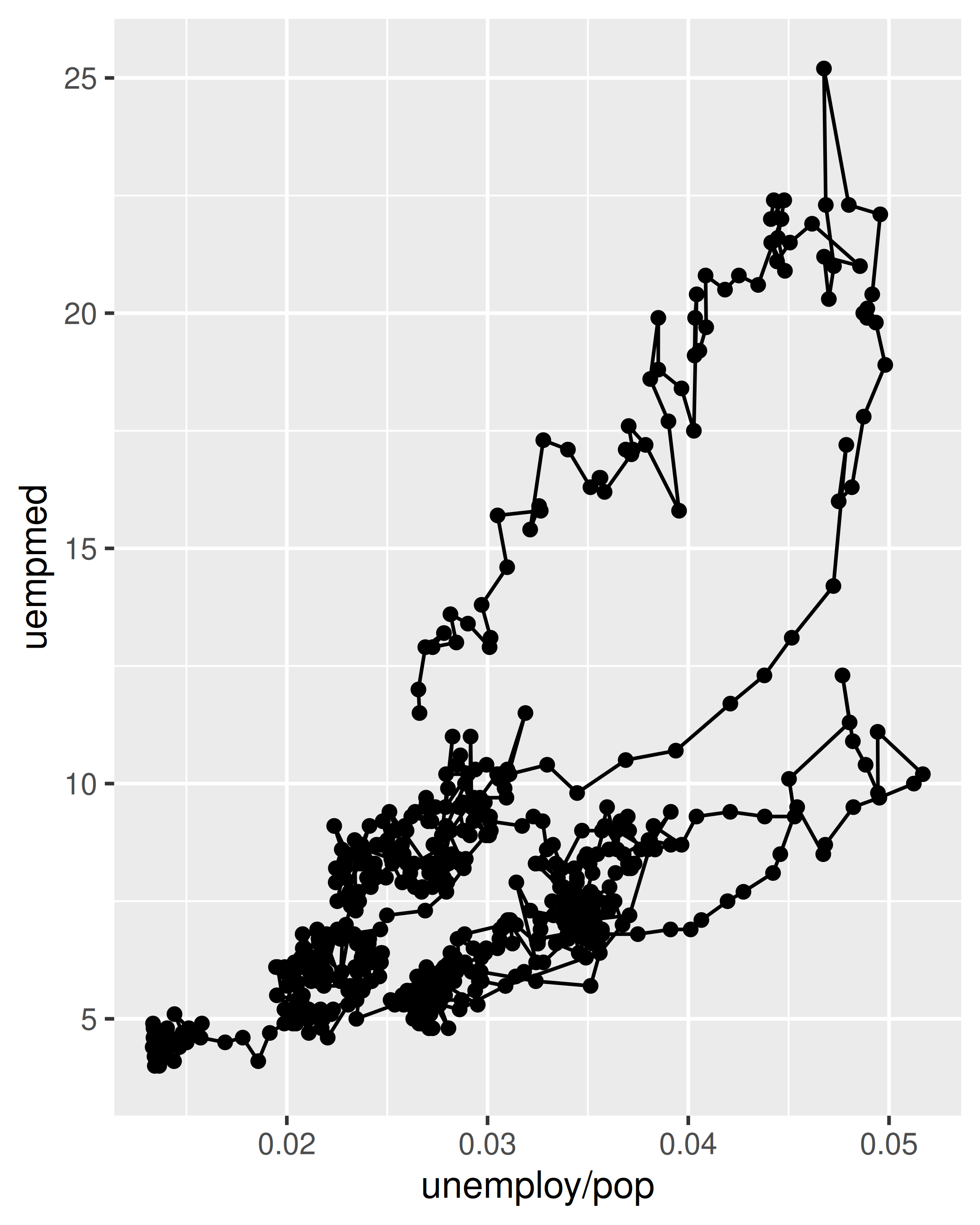 Para examinar esta relación con mayor detalle, nos gustaría dibujar ambas series de tiempo en la misma gráfica. Podríamos dibujar un diagrama de dispersión de la tasa de desempleo versus la duración del desempleo, pero entonces ya no podríamos ver la evolución en el tiempo. La solución es unir puntos adyacentes en el tiempo con segmentos de línea, formando un trazado de ruta.