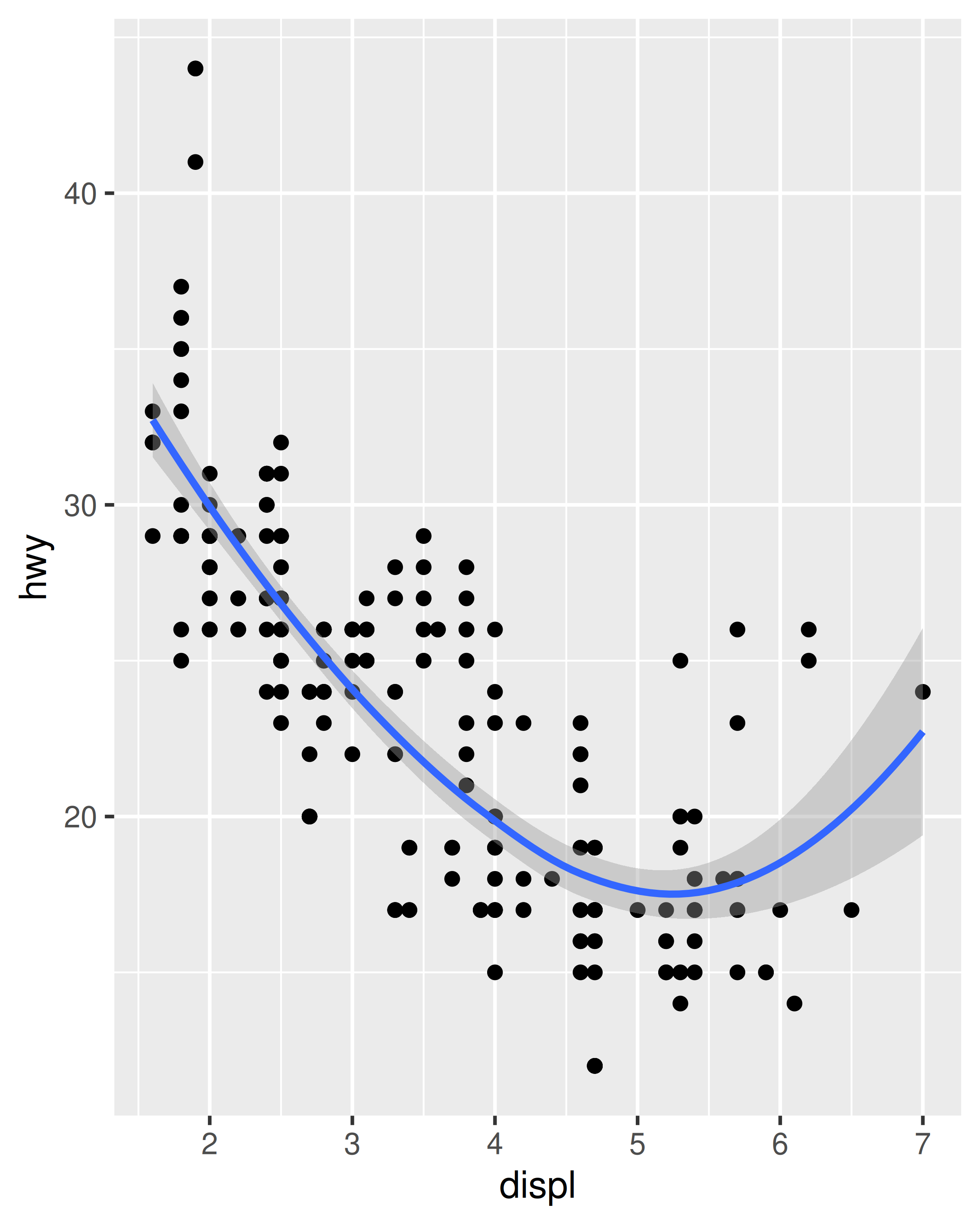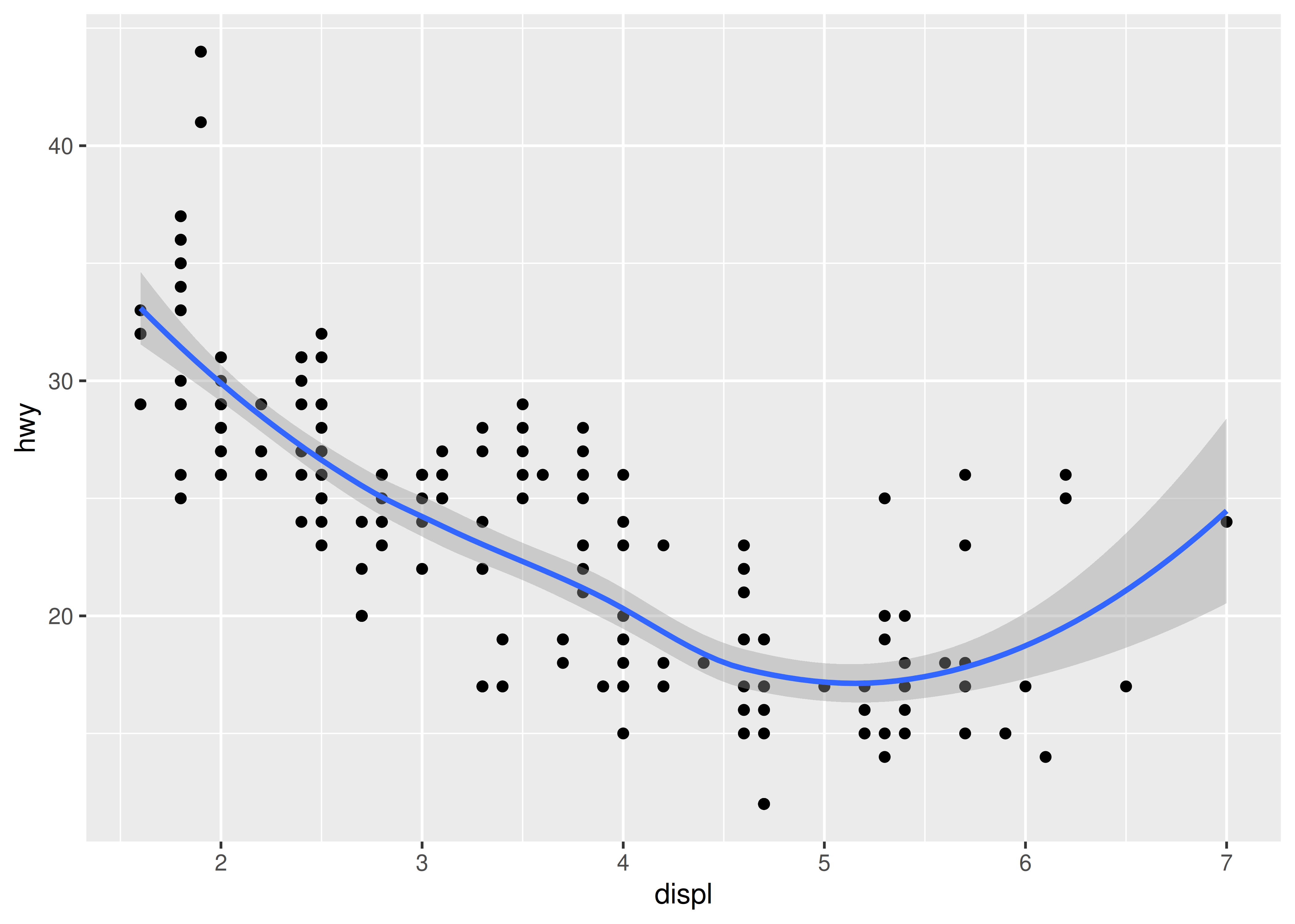 Esto superpone el diagrama de dispersión con una curva suave, que incluye una evaluación de la incertidumbre en forma de intervalos de confianza puntuales que se muestran en gris. Si no está interesado en el intervalo de confianza, desactívelo con geom_smooth(se = FALSE).