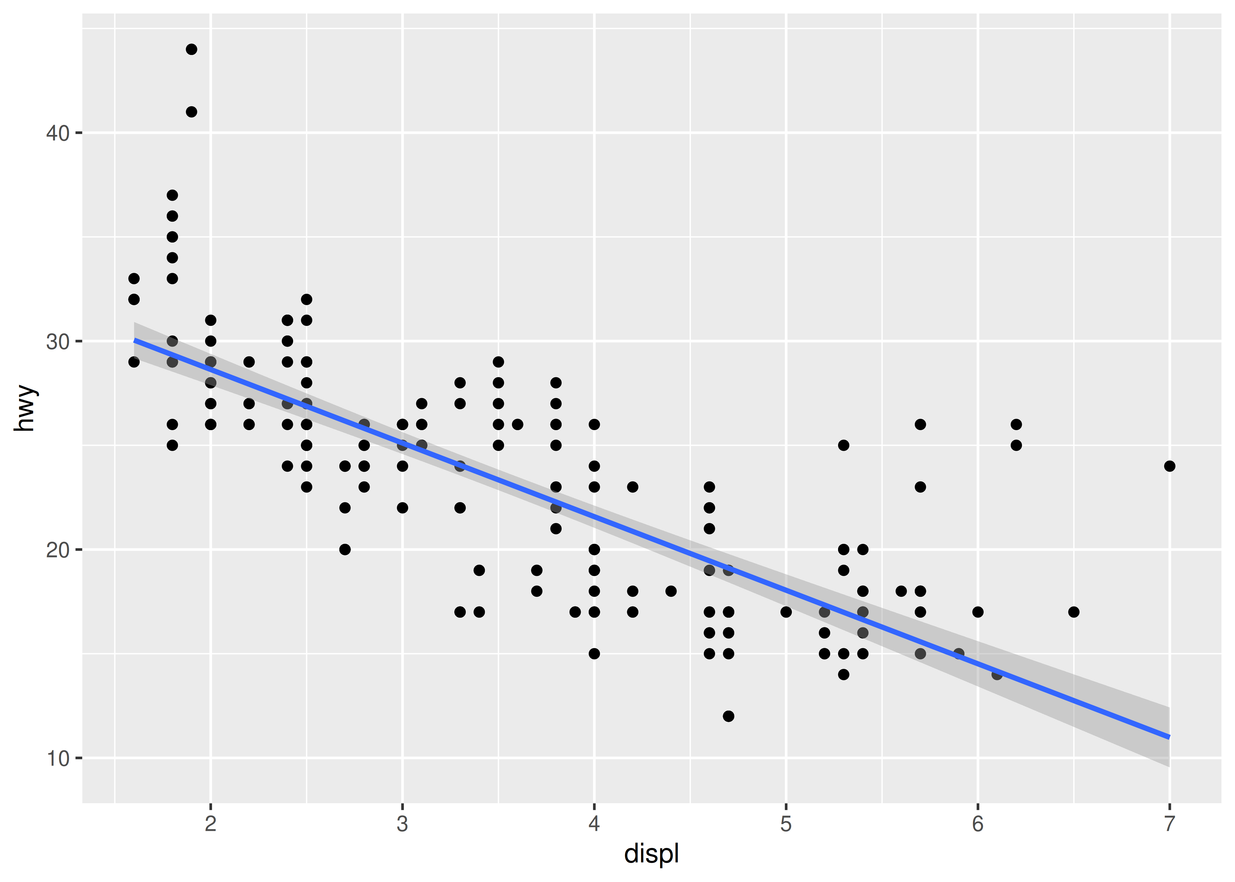 method = "lm"Se ajusta a un modelo lineal, dando la línea de mejor ajuste.ggplot(mpg, aes(displ, hwy)) + geom_point() + geom_smooth(method = "lm") #> `geom_smooth()` using formula = 'y ~ x'