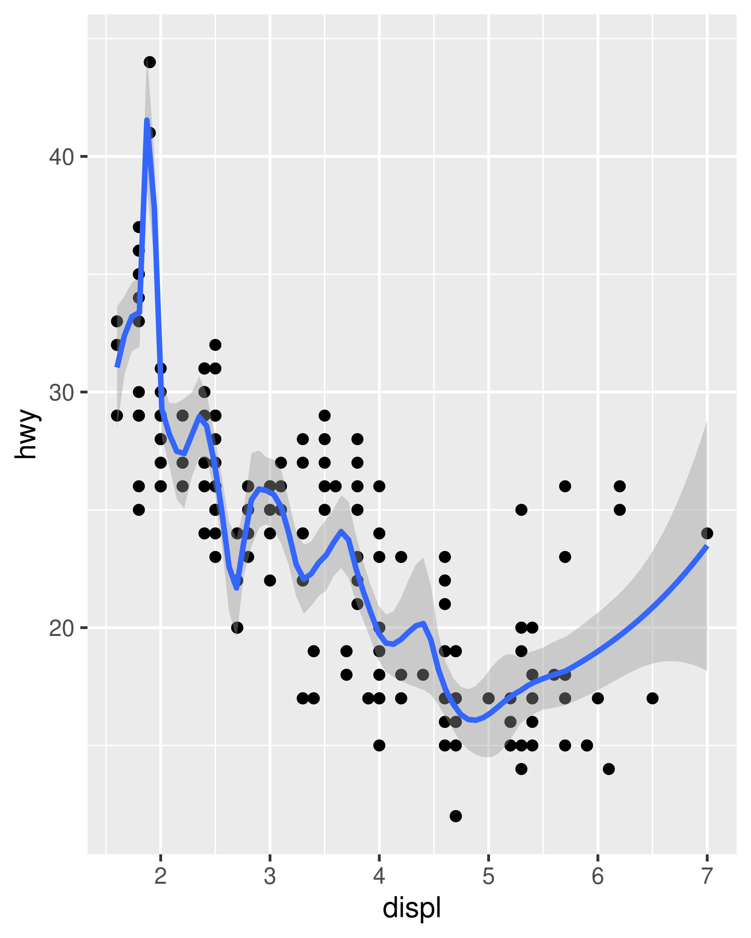 method = "gam"Se ajusta a un modelo aditivo generalizado proporcionado por el paquete mgcv. Primero debe cargar mgcv, luego usar una fórmula comofórmula = y ~ s(x)oy ~ s(x, bs = "cs")(para datos grandes). Esto es lo que usa ggplot2 cuando hay más de 1000 puntos.library(mgcv) ggplot(mpg, aes(displ, hwy)) + geom_point() + geom_smooth(method = "gam", formula = y ~ s(x))
