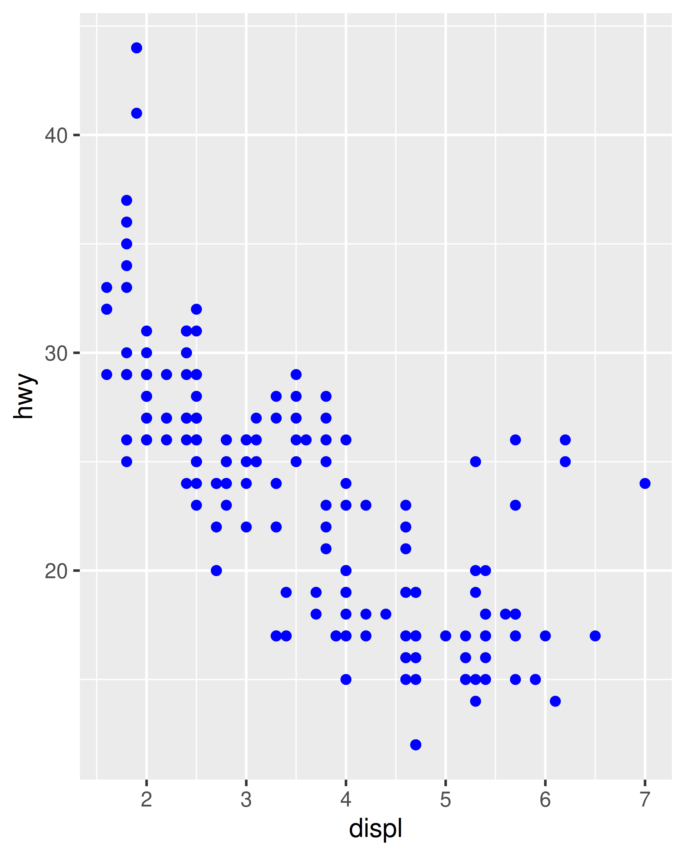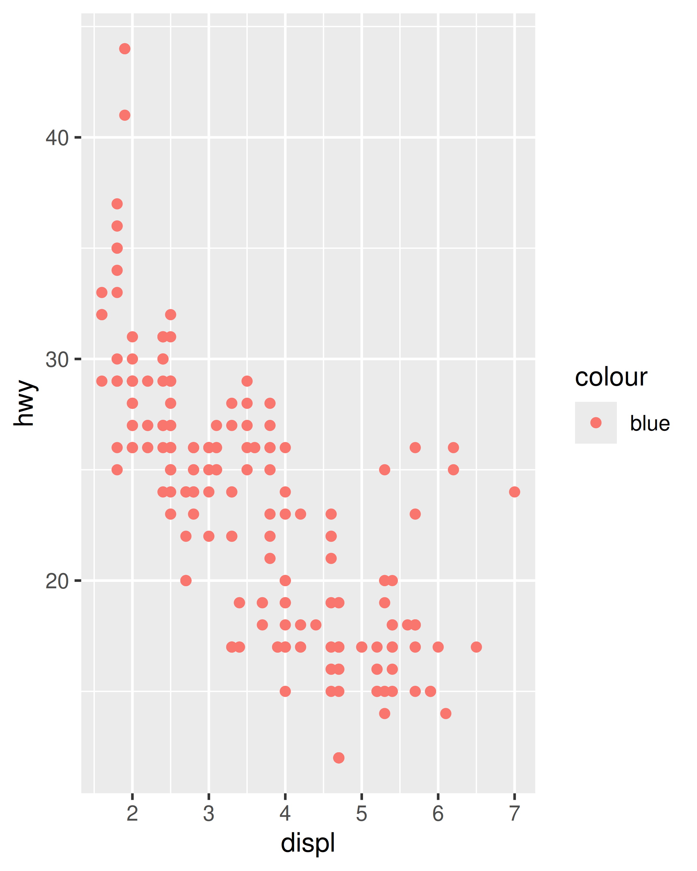 ggplot(mpg, aes(displ, hwy)) + geom_point(colour = "blue")