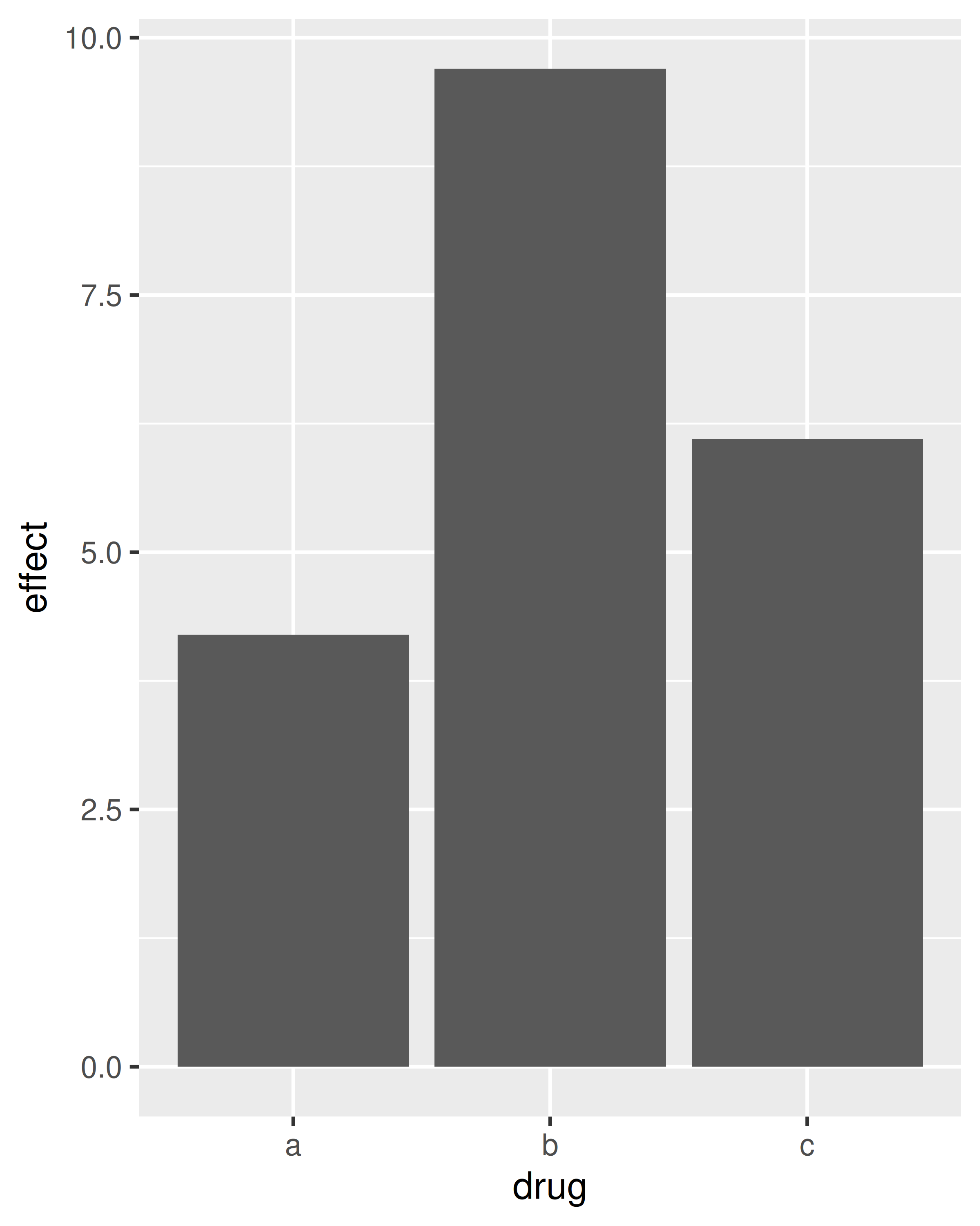 Los gráficos de barras pueden resultar confusos porque hay dos gráficos bastante diferentes que comúnmente se denominan gráficos de barras. El formulario anterior espera que tenga datos no resumidos y cada observación contribuye con una unidad a la altura de cada barra. La otra forma de gráfico de barras se utiliza para datos presumidos. Por ejemplo, es posible que tenga tres medicamentos con su efecto promedio: