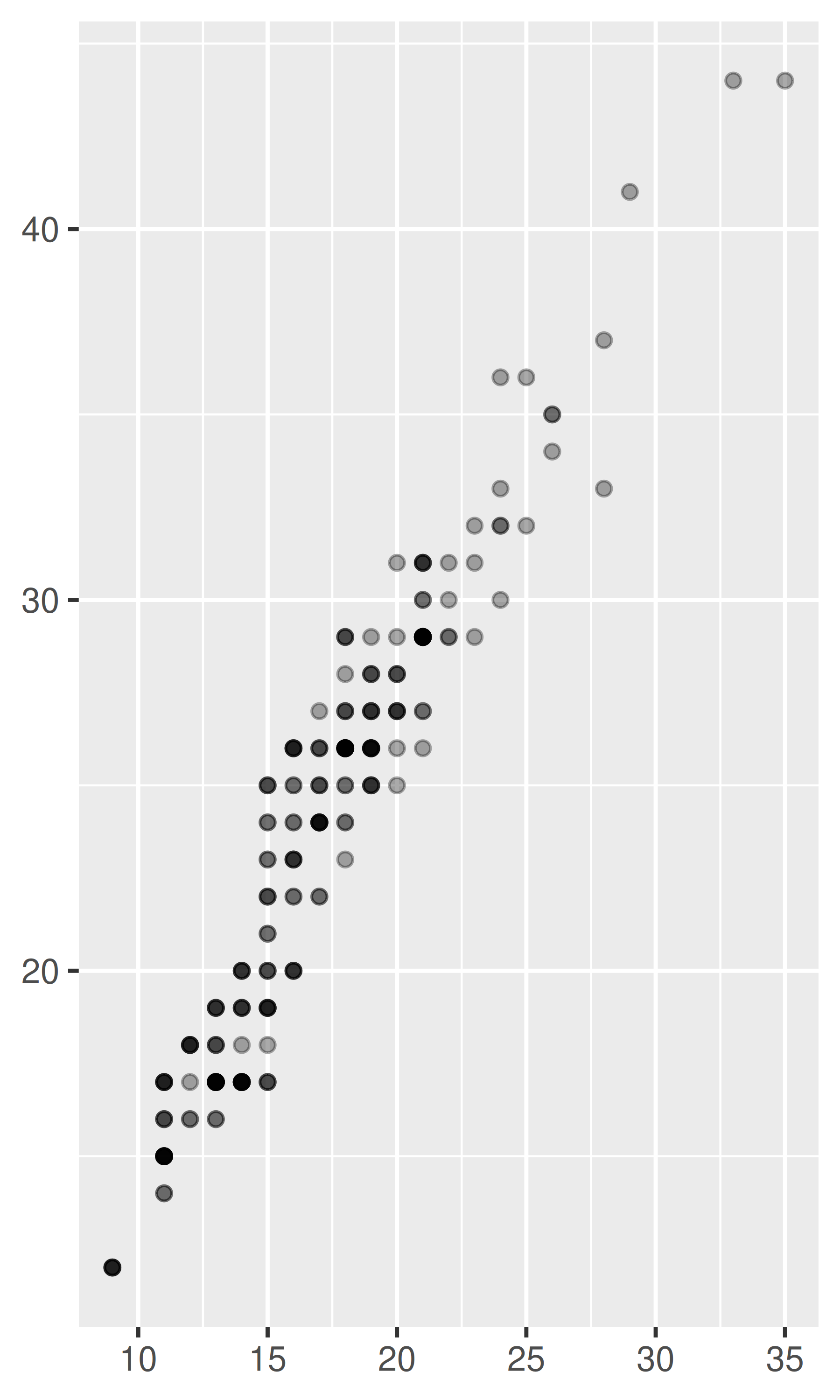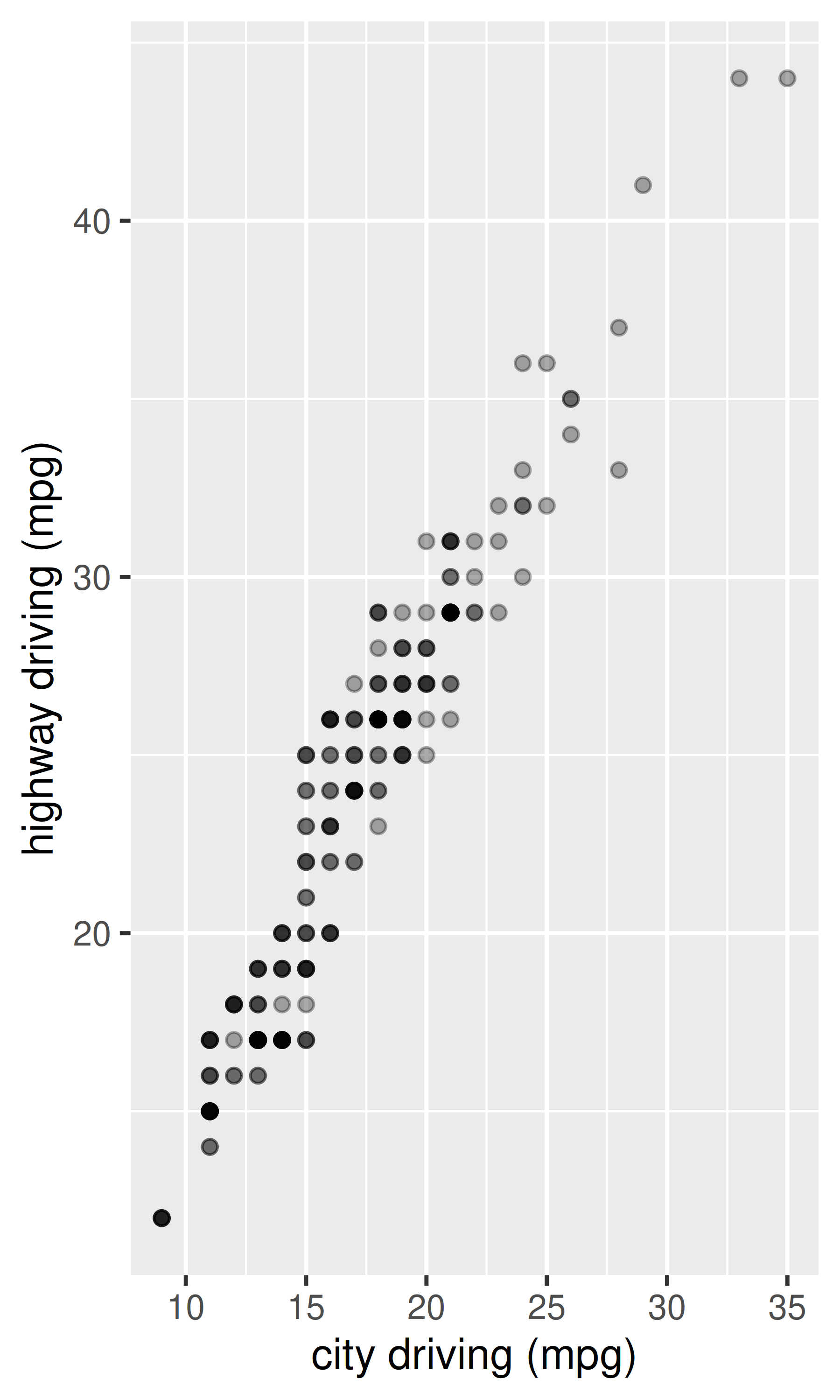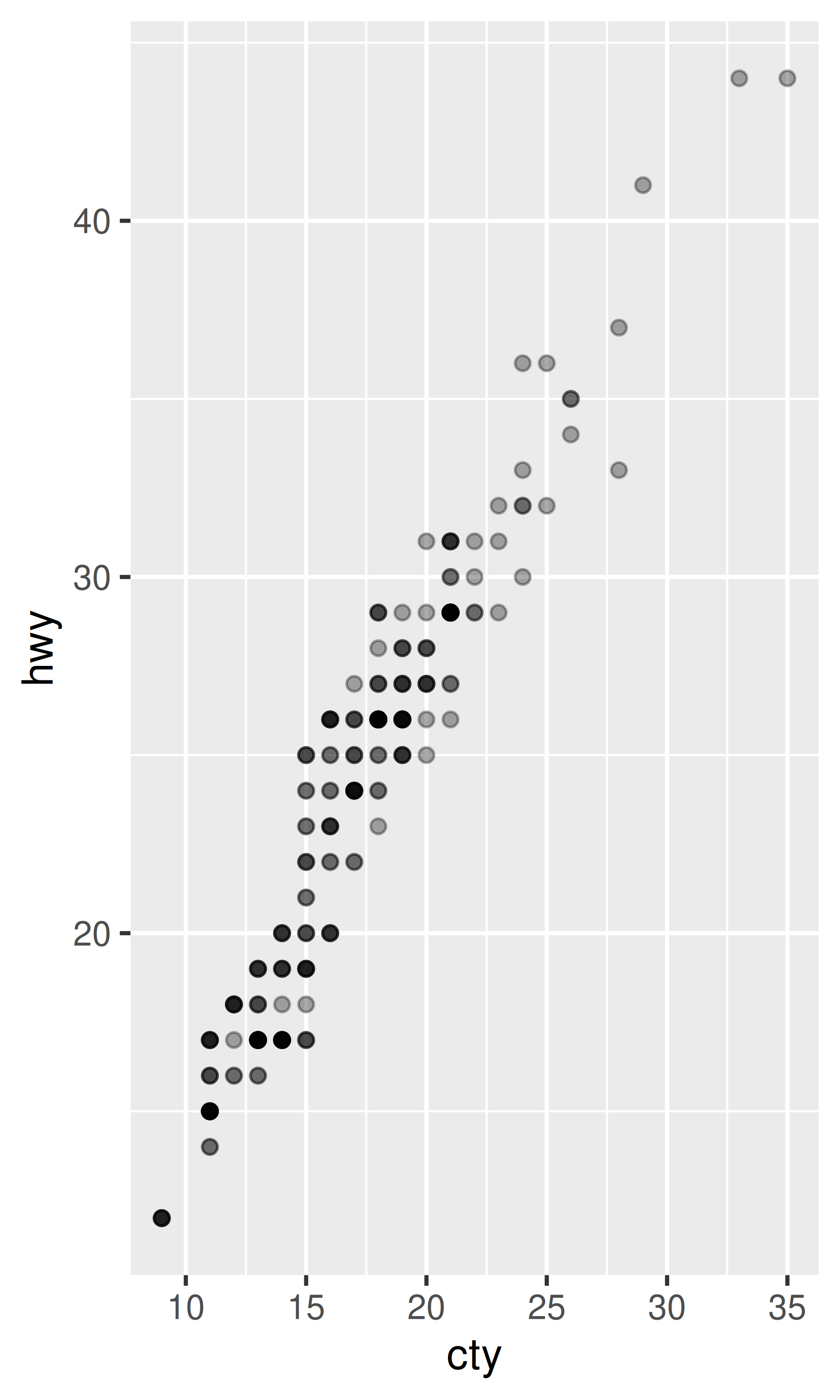 Debido a que hay pocos valores únicos tanto para drv como para hwy, hay mucho trazado excesivo. Muchos puntos están trazados en la misma ubicación y es difícil ver la distribución. Hay tres técnicas útiles que ayudan a aliviar el problema: