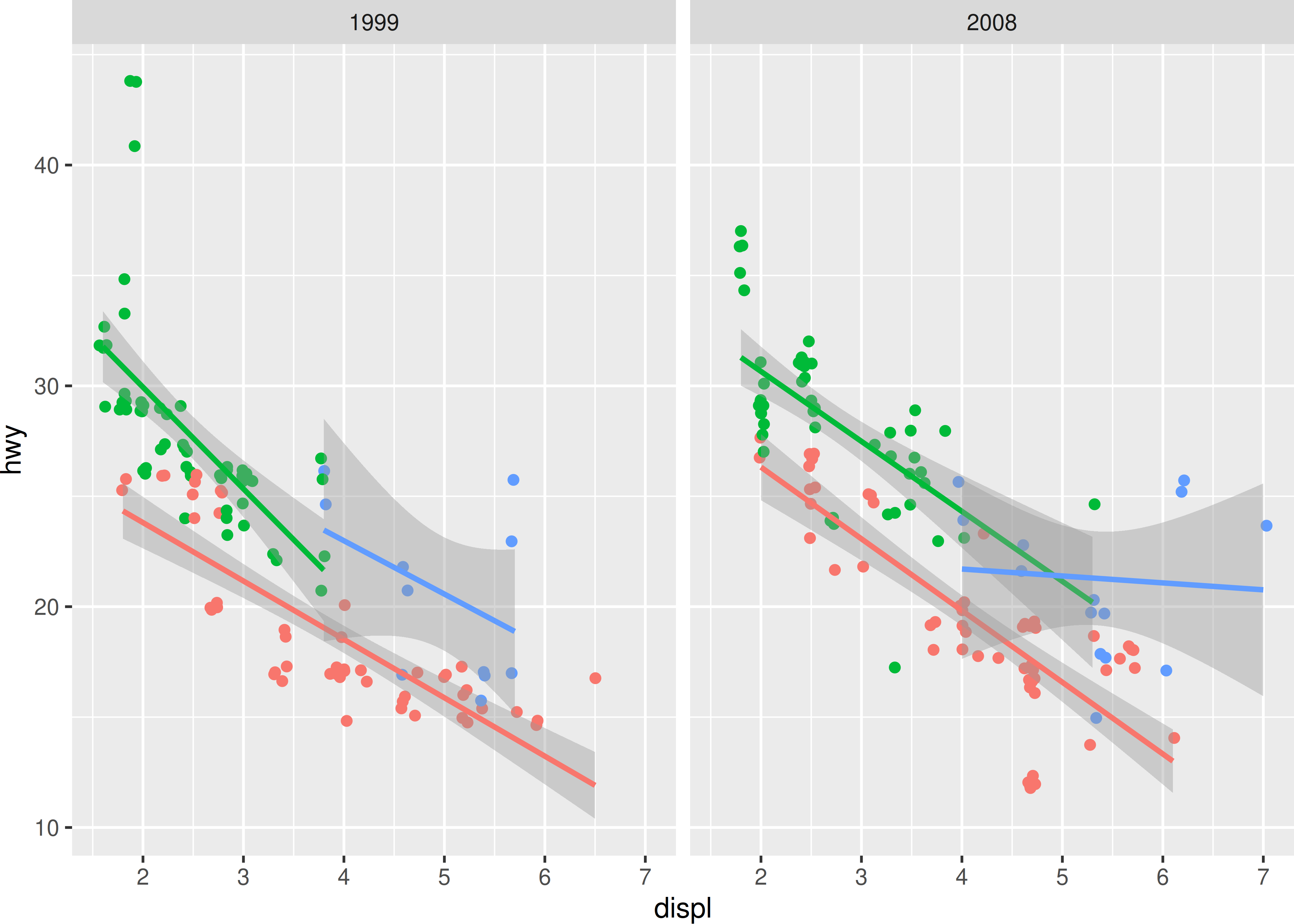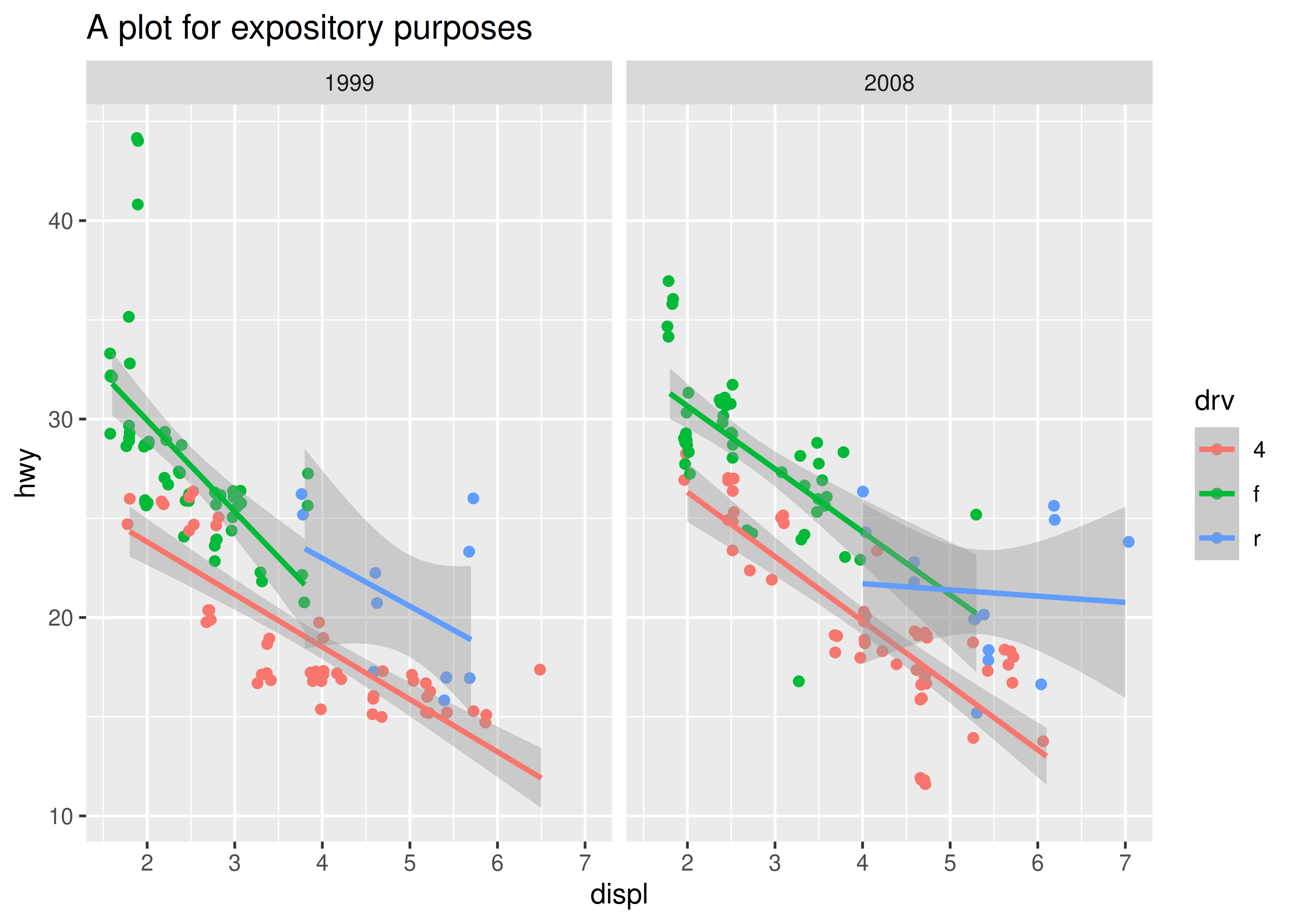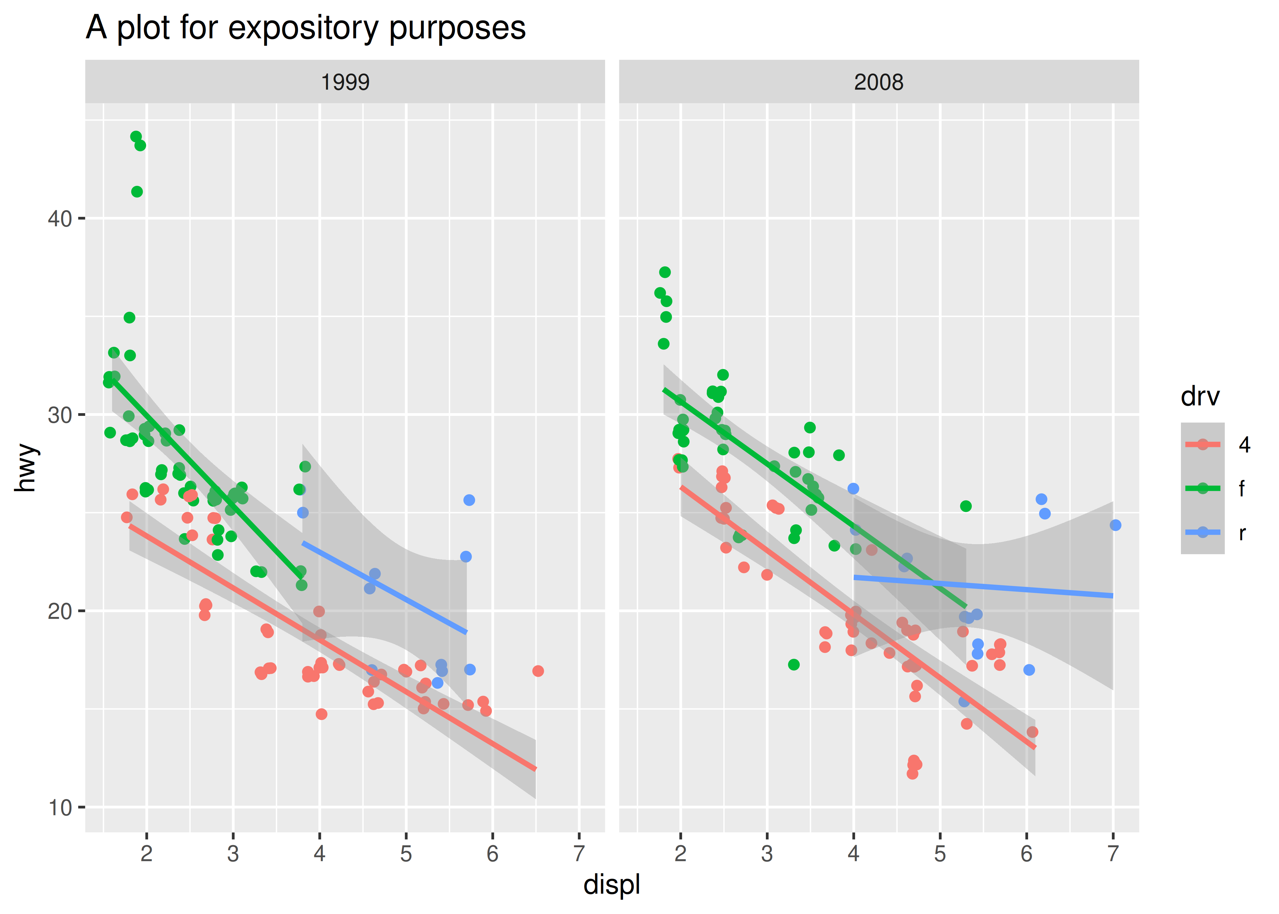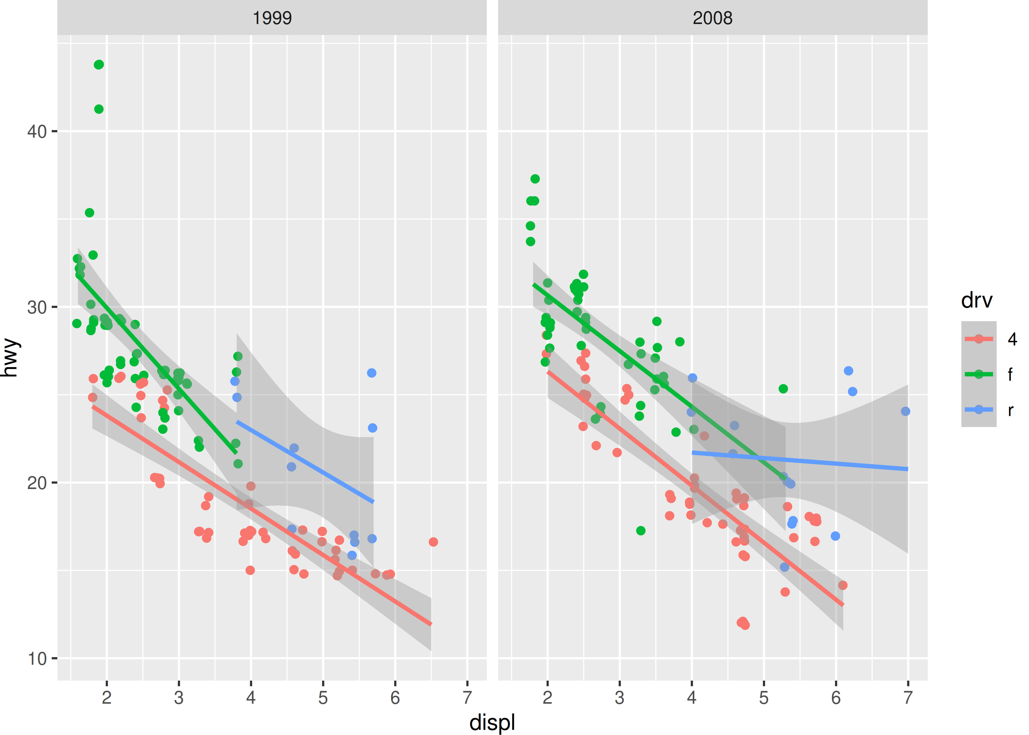 p <- ggplot(mpg, aes(displ, hwy, color = drv)) +