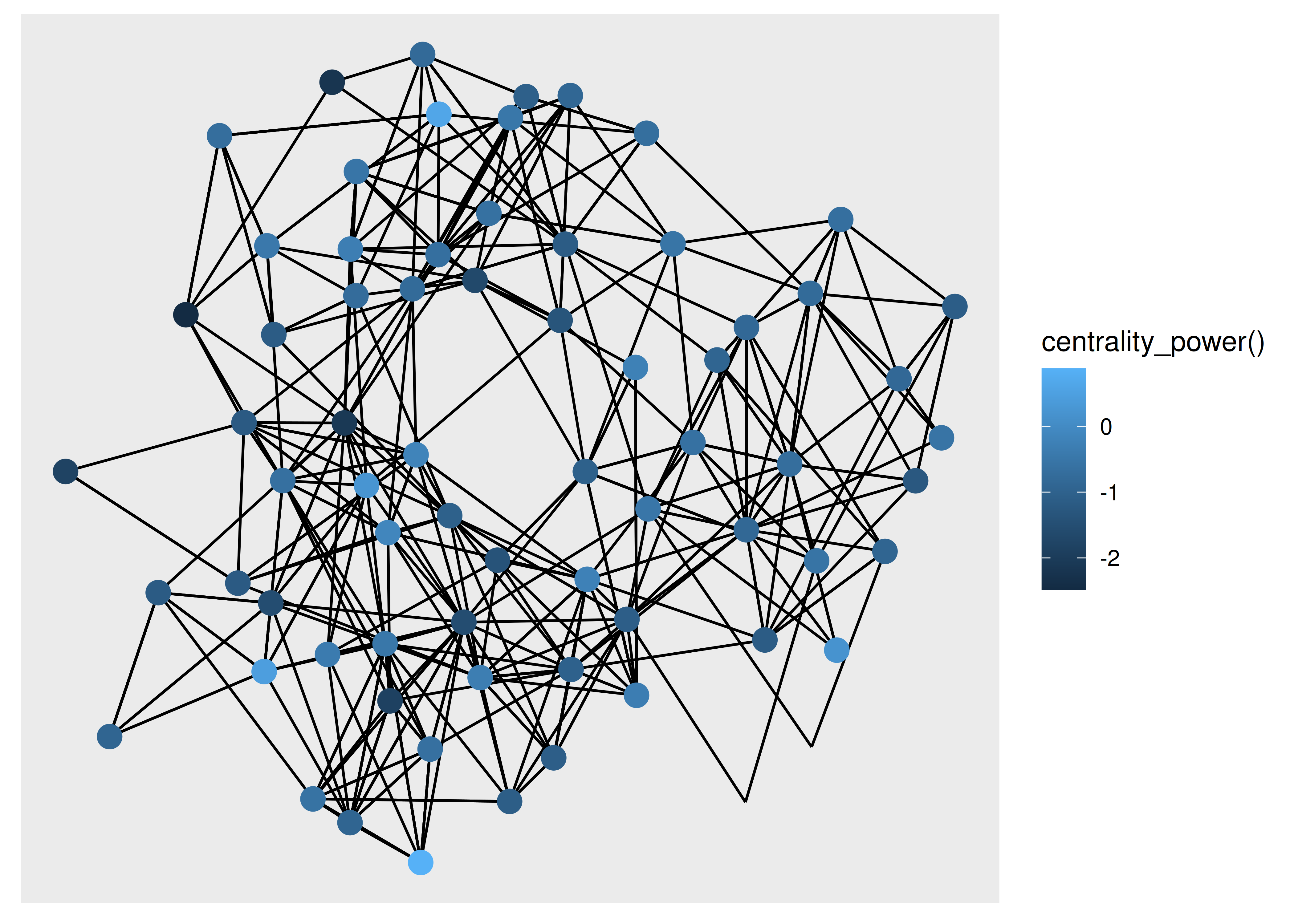 De los dos tipos de datos almacenados en un gráfico, los nodos son, con diferencia, los que más se parecen a lo que estamos acostumbrados a representar. Después de todo, a menudo se muestran como puntos de forma muy parecida a como se muestran las observaciones en un diagrama de dispersión. Si bien conceptualmente es simple, todavía no cubriremos todo lo que hay que saber sobre los nodos, por lo que, al igual que con los diseños, el lector interesado debe consultar la Guía de introducción a los nodos para aprender más. Todas las geoms de dibujo de nodos en ggraph tienen el prefijo geom_node_ y el que es más probable que uses con más frecuencia es geom_node_point(). Si bien superficialmente puede parecerse mucho geom_point() tiene algunas características adicionales que comparte con todas las geomas de nodos y bordes. Primero, no es necesario especificar la estética x e y. Estos vienen dados por el diseño y su mapeo está implícito. En segundo lugar, tienes acceso a una estética de filter que te permite desactivar el dibujo de nodos específicos. En tercer lugar, puede utilizar cualquier algoritmo de tidygraph dentro de aes() y se evaluarán en el gráfico que se visualiza. Para ver esto en acción, trazamos nuestro gráfico de secundaria nuevamente, pero esta vez solo muestra los nodos con más de 2 conexiones y coloreados según su centralidad de poder: