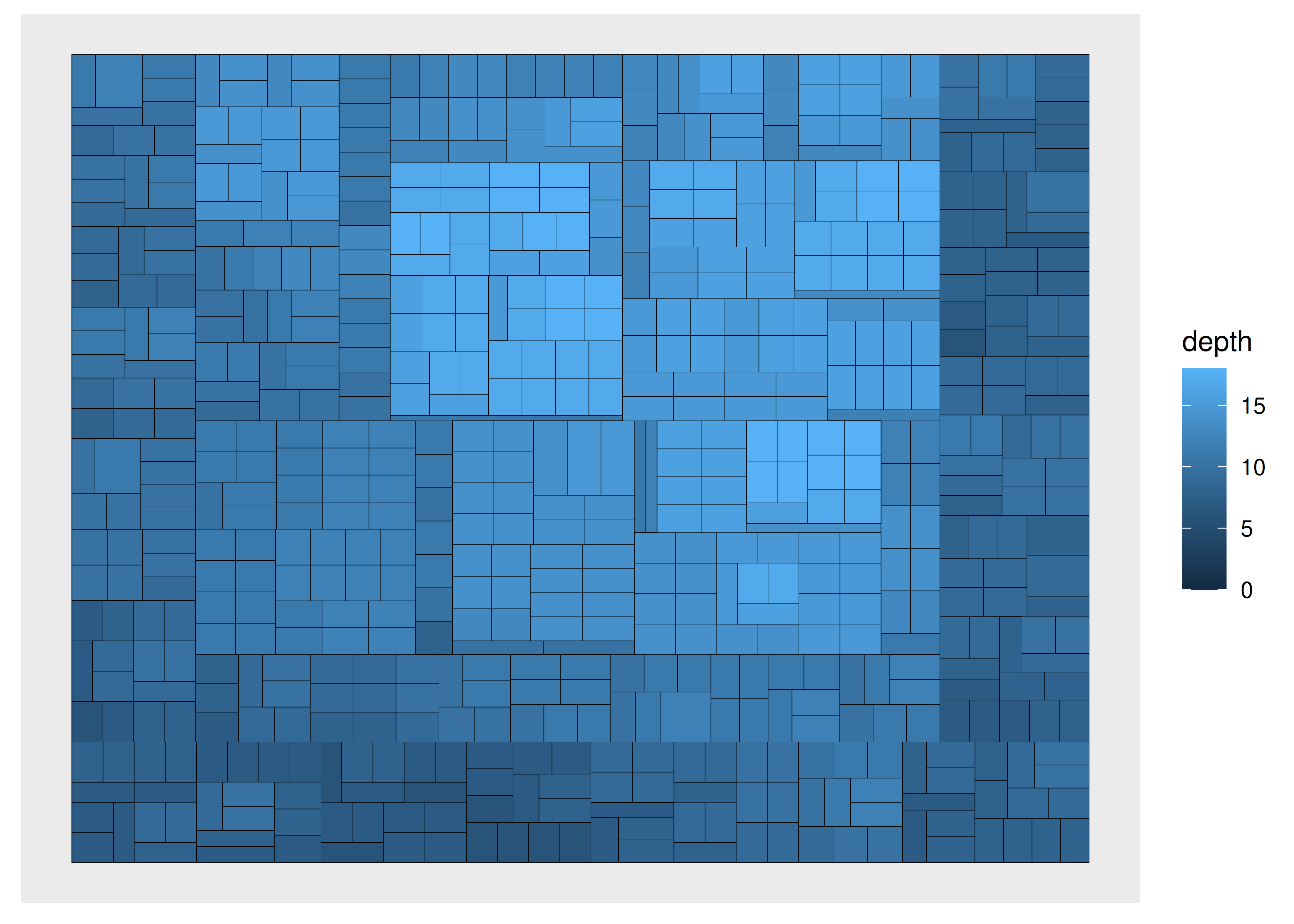 Aparte de los puntos, hay geoms más especializados, muchos de ellos vinculados a un tipo específico de diseño. Si uno desea dibujar un mapa de árbol, se necesita geom_node_tile():