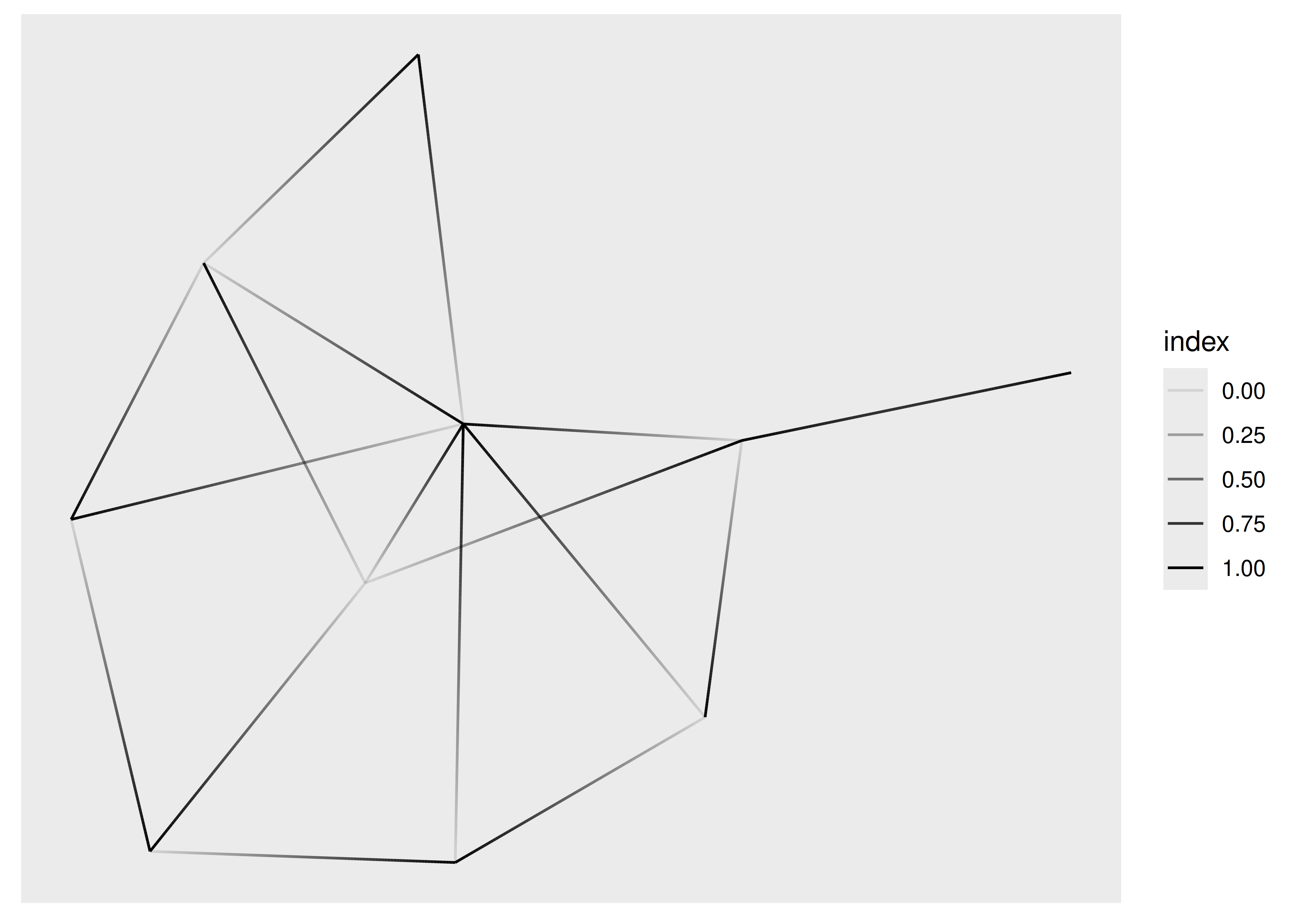 Si está dibujando muchos bordes, esta expansión puede consumir mucho tiempo y ggraph proporciona una versión con el sufijo 0 que lo dibuja como una geom simple (y no le permite dibujar gradientes). Además, para el caso especial en el que desea interpolar entre dos valores en los puntos finales (por ejemplo, variables en los nodos), también existe una versión con el sufijo 2: