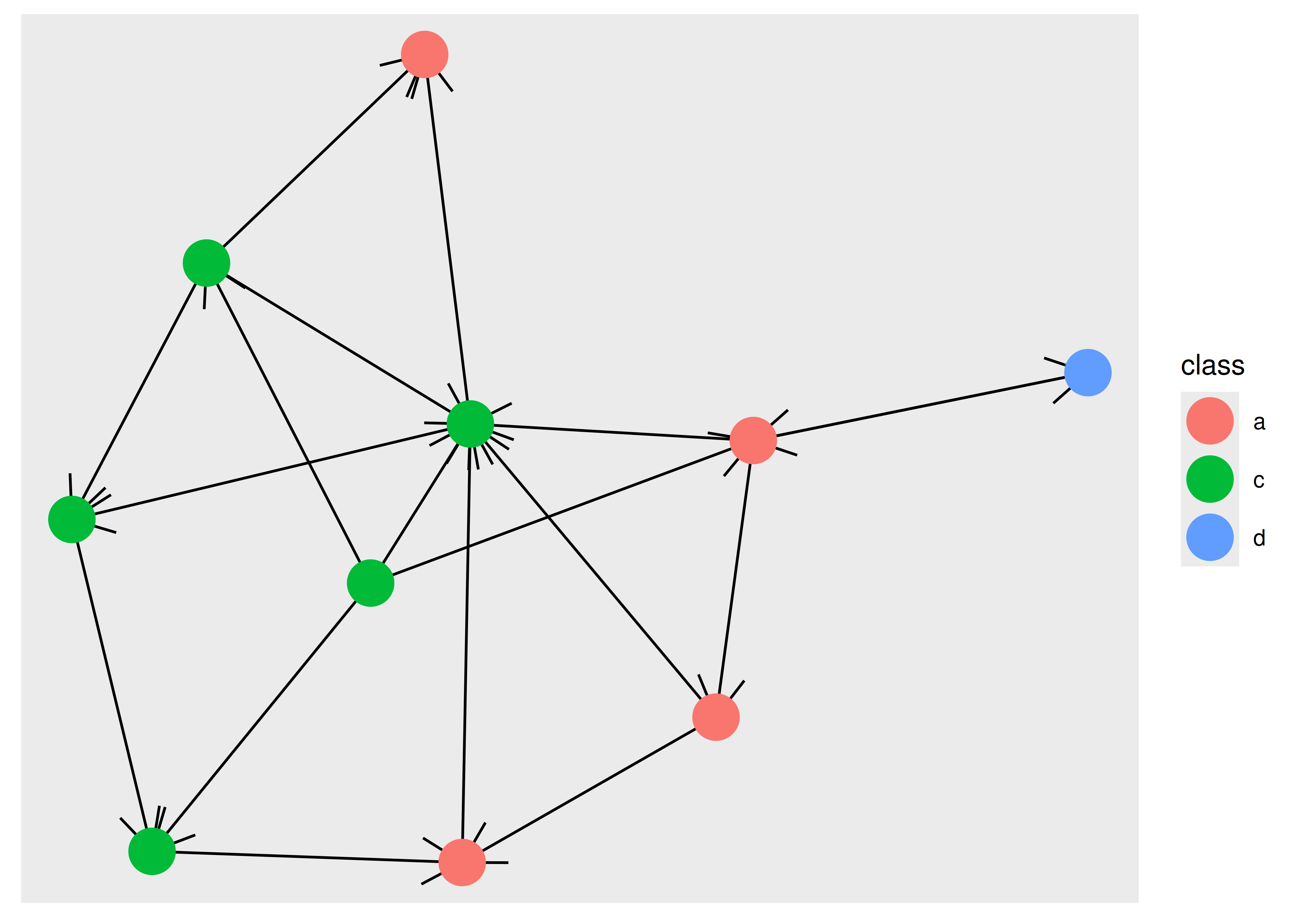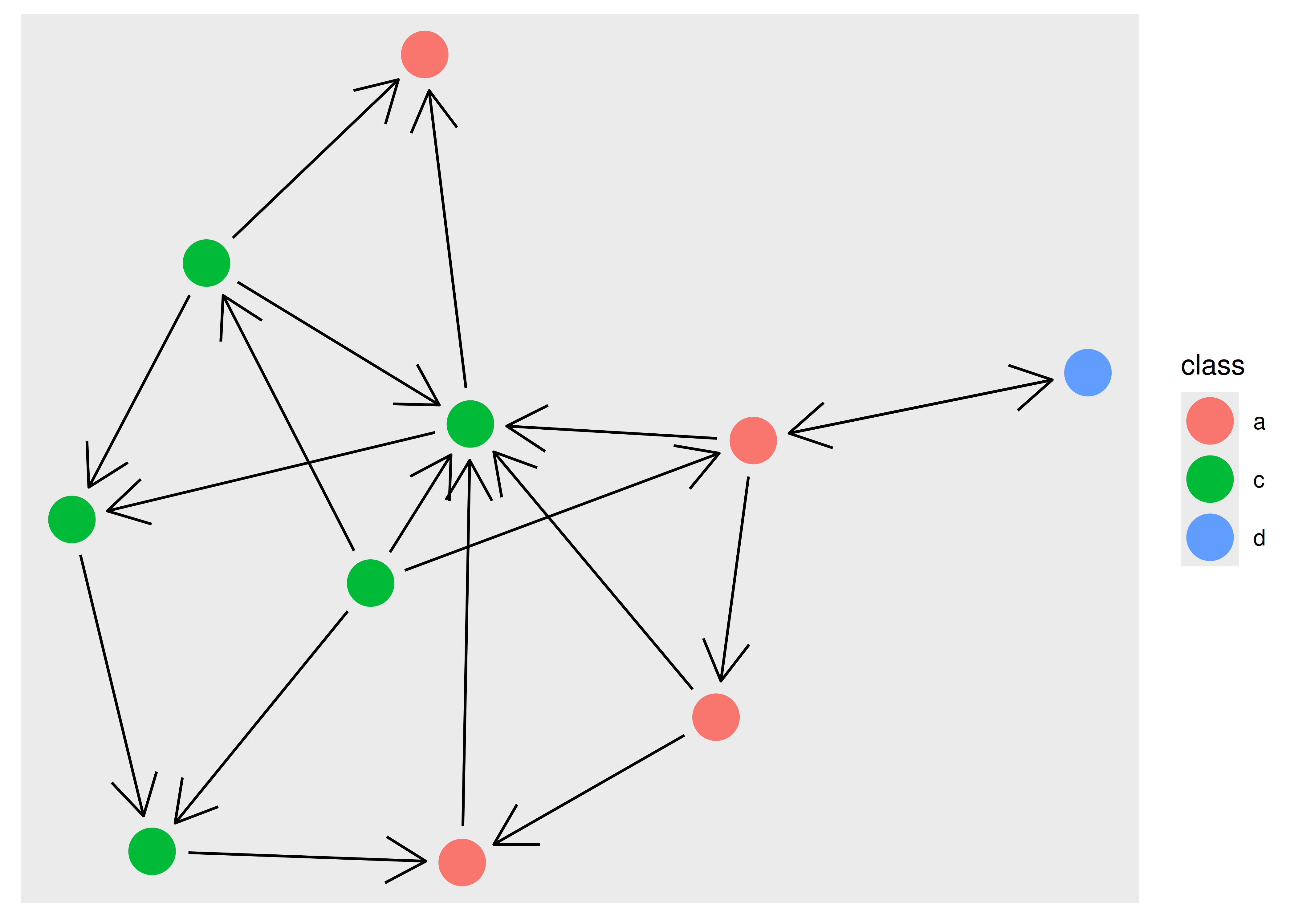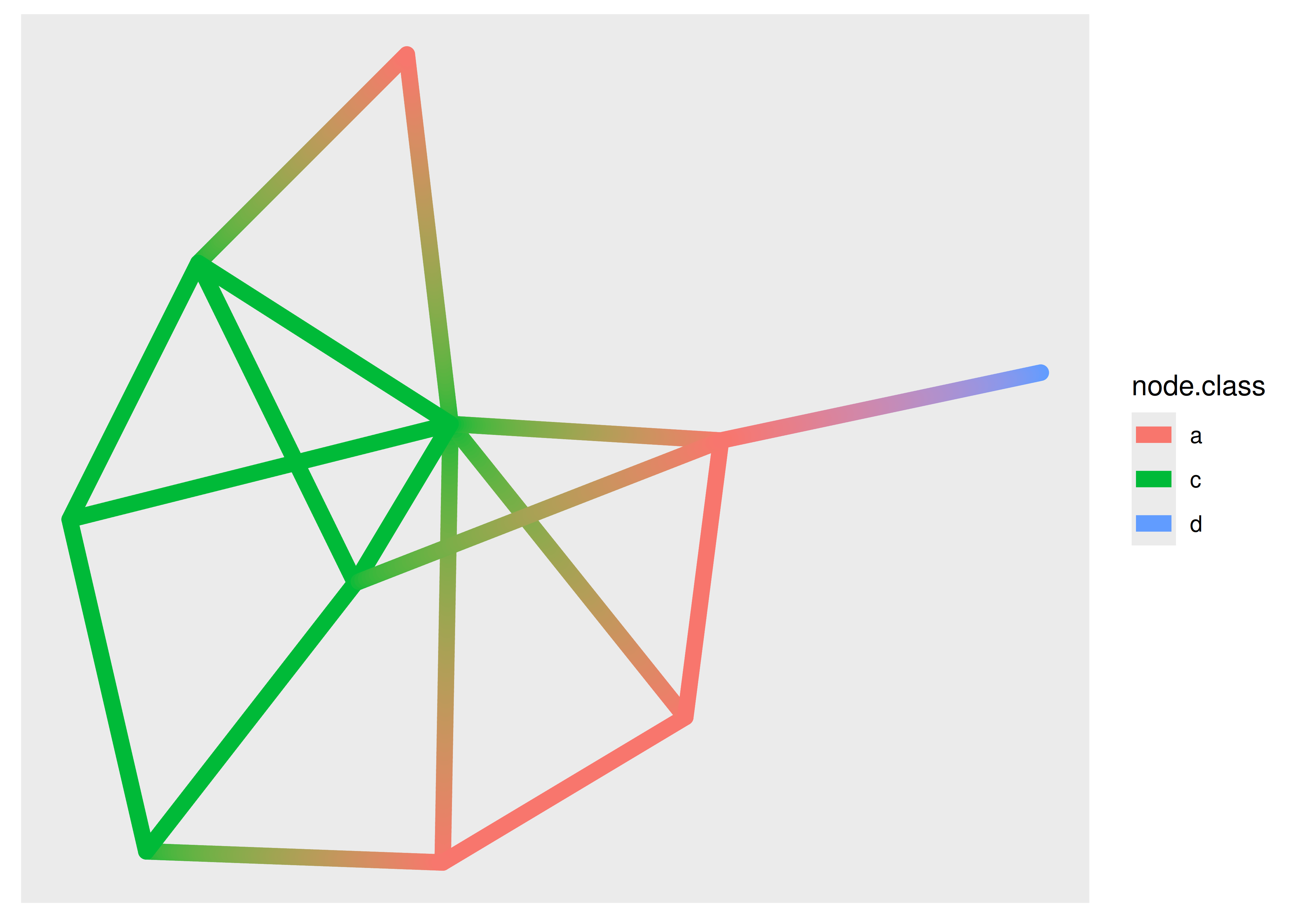 El uso de la variable node.class puede sorprenderte. Las geoms de borde tienen acceso a las variables de los nodos terminales a través de variables con prefijos especiales. Para las versiones estándar y 0, están disponibles a través de las variables con prefijo node1. y node2., y para la versión 2, están disponibles a través de las variables con prefijo node. (como se usó anteriormente). Las tres versiones de geoms de borde son comunes a todos los tipos de geoms de borde, no solo a geom_edge_link().