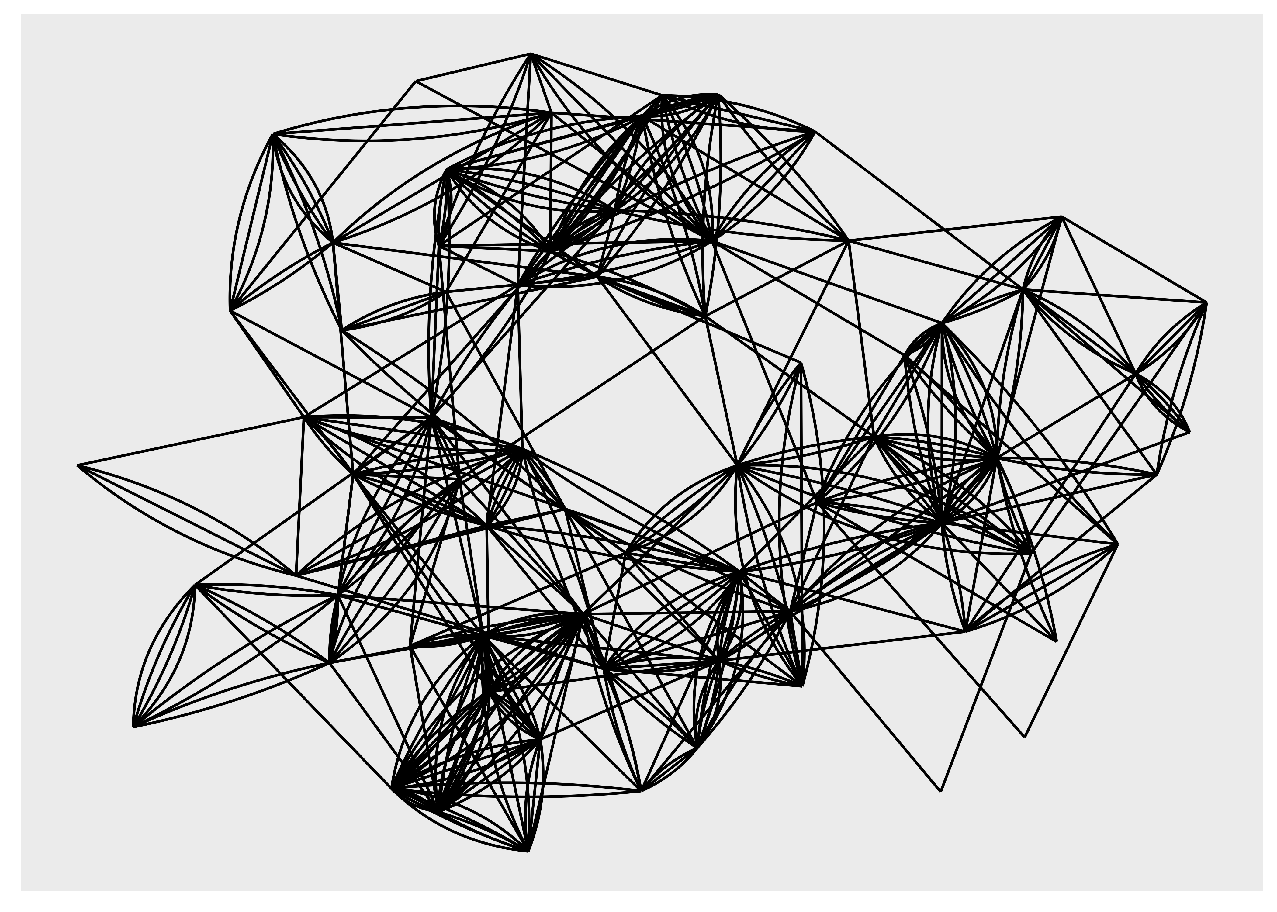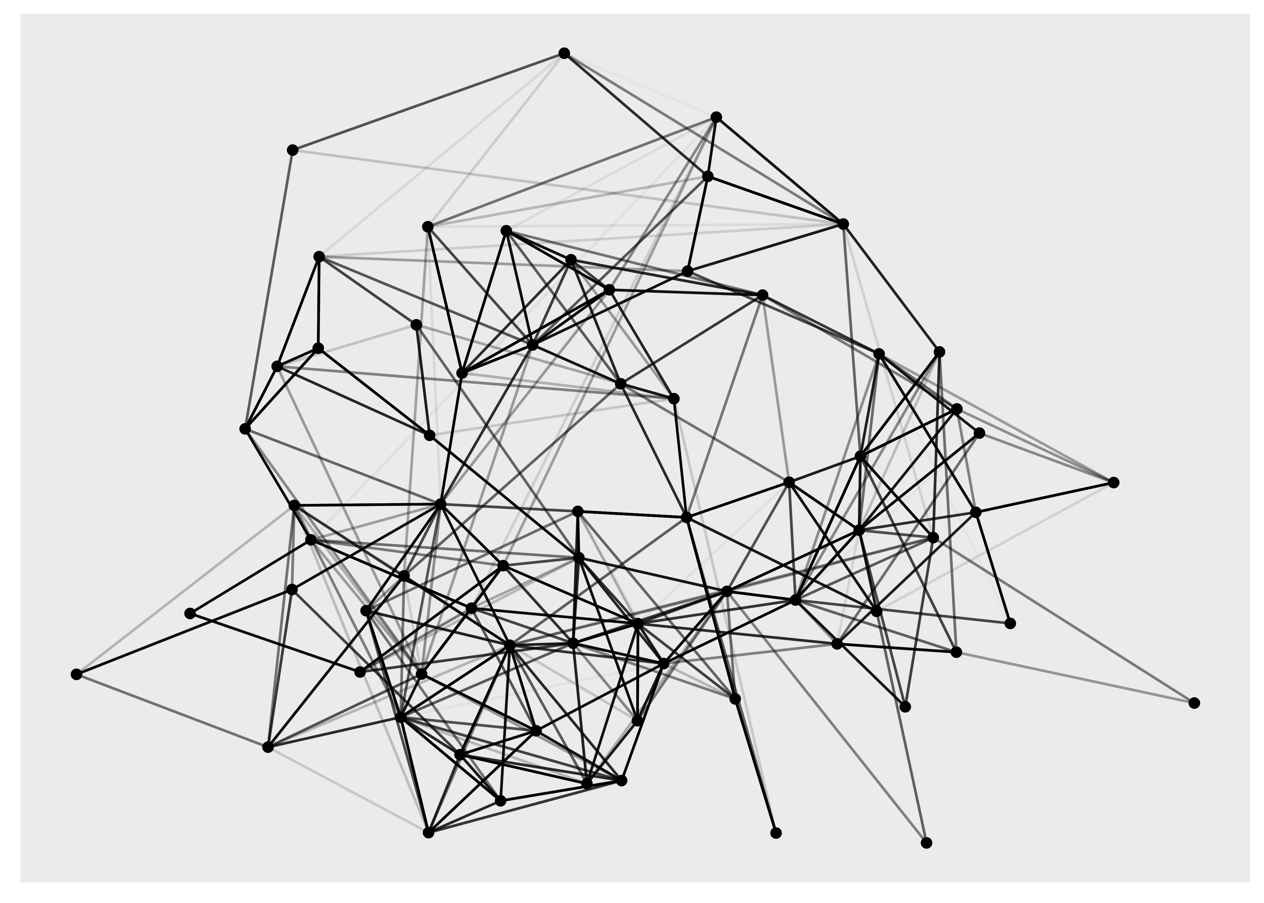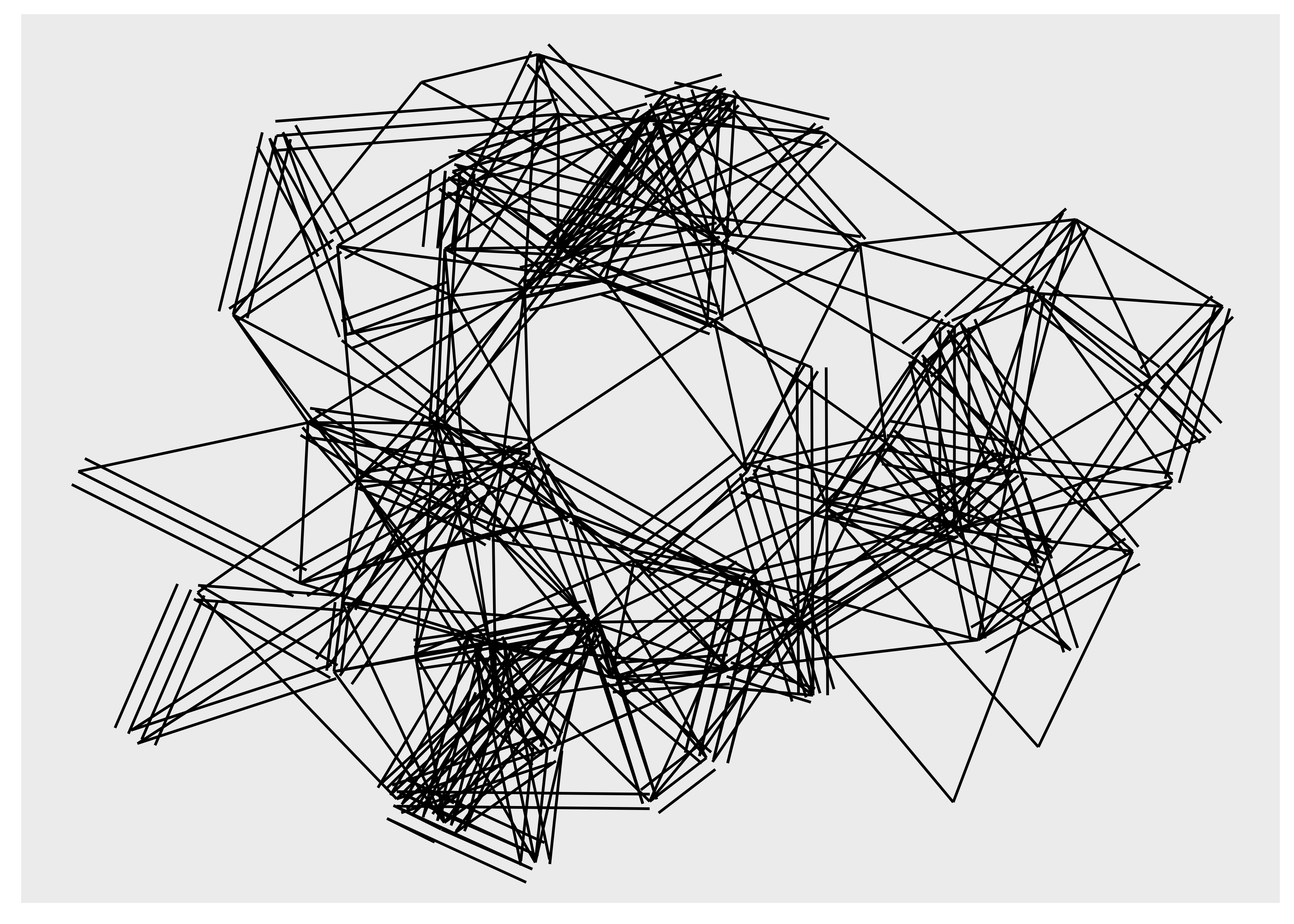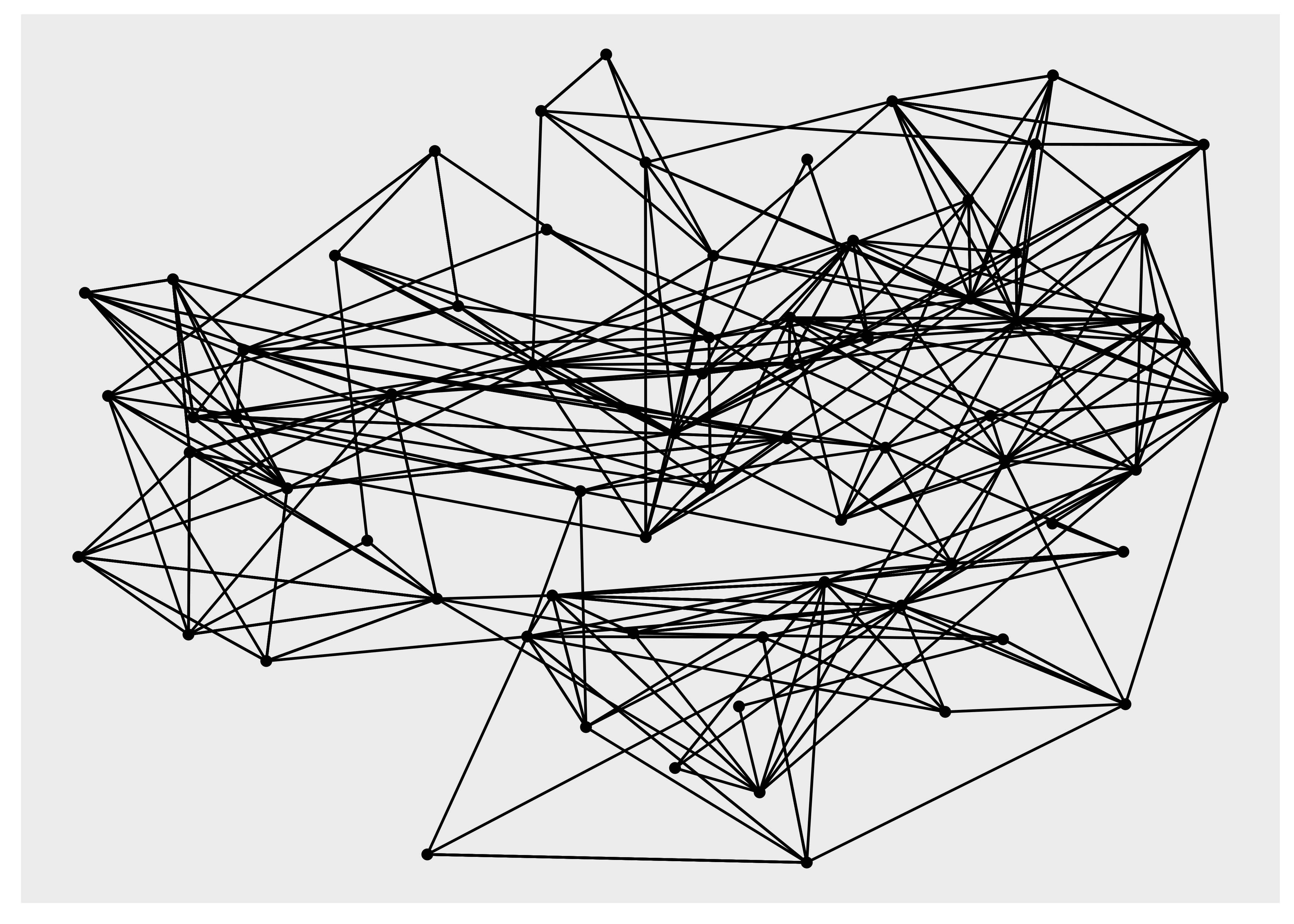 ggraph se basa en tidygraph y ggplot2 para permitir una gramática de gráficos completa y familiar para datos de red. Aún así, es un poco diferente de la mayoría de los paquetes de extensión ggplot2 ya que funciona con otro tipo de datos que es fundamentalmente diferente de los datos tabulares. Más aún, la mayoría de las visualizaciones de redes no se preocupan por asignar variables a la estética x e y, ya que se preocupan por mostrar la topología de la red más que las relaciones entre dos variables. Para mostrar la topología de la red, se emplea el concepto de diseños. Los diseños son algoritmos que utilizan la estructura de la red para calcular (a menudo arbitrarios) los valores x e y para cada nodo que luego pueden usarse con fines de visualización. Para decirlo de otra manera, al trazar datos tabulares, la estética x e y casi siempre se asignan a variables existentes en los datos (o transformaciones estadísticas de datos existentes), mientras que al trazar datos de red x e y. se asignan a valores derivados de la topología de la red y que por sí solos no tienen sentido.