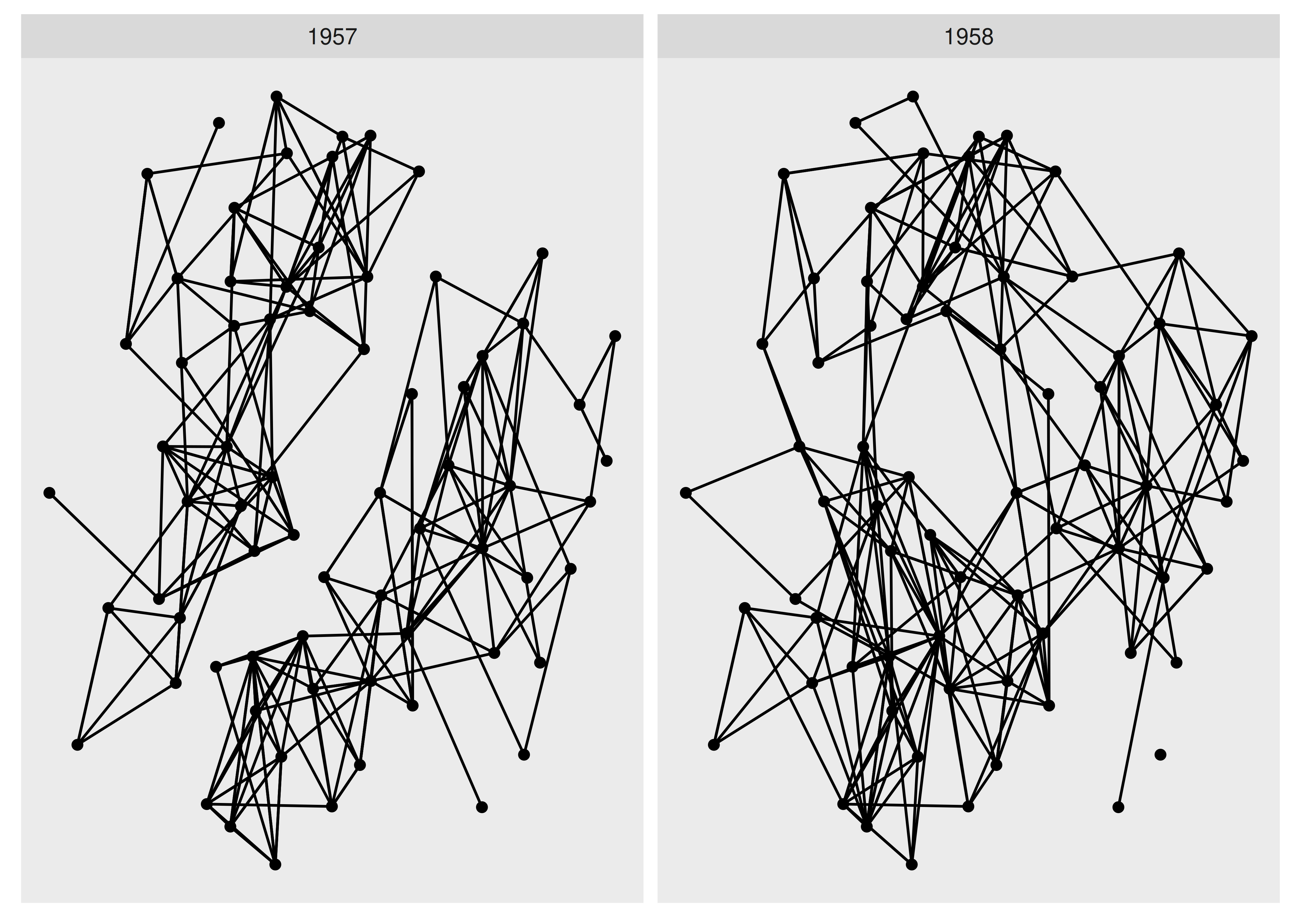 Como queda muy claro con el facetado, vemos una clara evolución de las amistades que van de dos grupos completamente separados a un solo grupo más mixto.