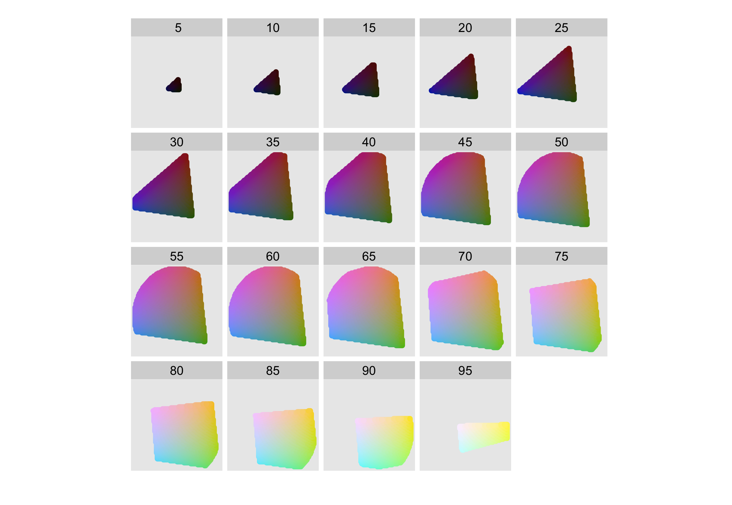 A nivel físico, el color se produce por una mezcla de longitudes de onda de luz. Para caracterizar completamente un color, necesitamos conocer la mezcla completa de longitudes de onda. Afortunadamente para nosotros, el ojo humano sólo tiene tres receptores de color diferentes, por lo que podemos resumir la percepción de cualquier color en sólo tres números. Quizás esté familiarizado con la codificación RGB del espacio de color, que define un color según las intensidades de luz roja, verde y azul necesarias para producirlo. Un problema con este espacio es que no es perceptualmente uniforme: los dos colores que están separados por una unidad pueden parecer similares o muy diferentes dependiendo de dónde se encuentren en el espacio de color. Esto dificulta la creación de un mapeo de una variable continua a un conjunto de colores. Ha habido muchos intentos de crear espacios de color que sean más perceptualmente uniformes. Usaremos un intento moderno llamado espacio de color HCL, que tiene tres componentes: hue, chroma y lluminance:
