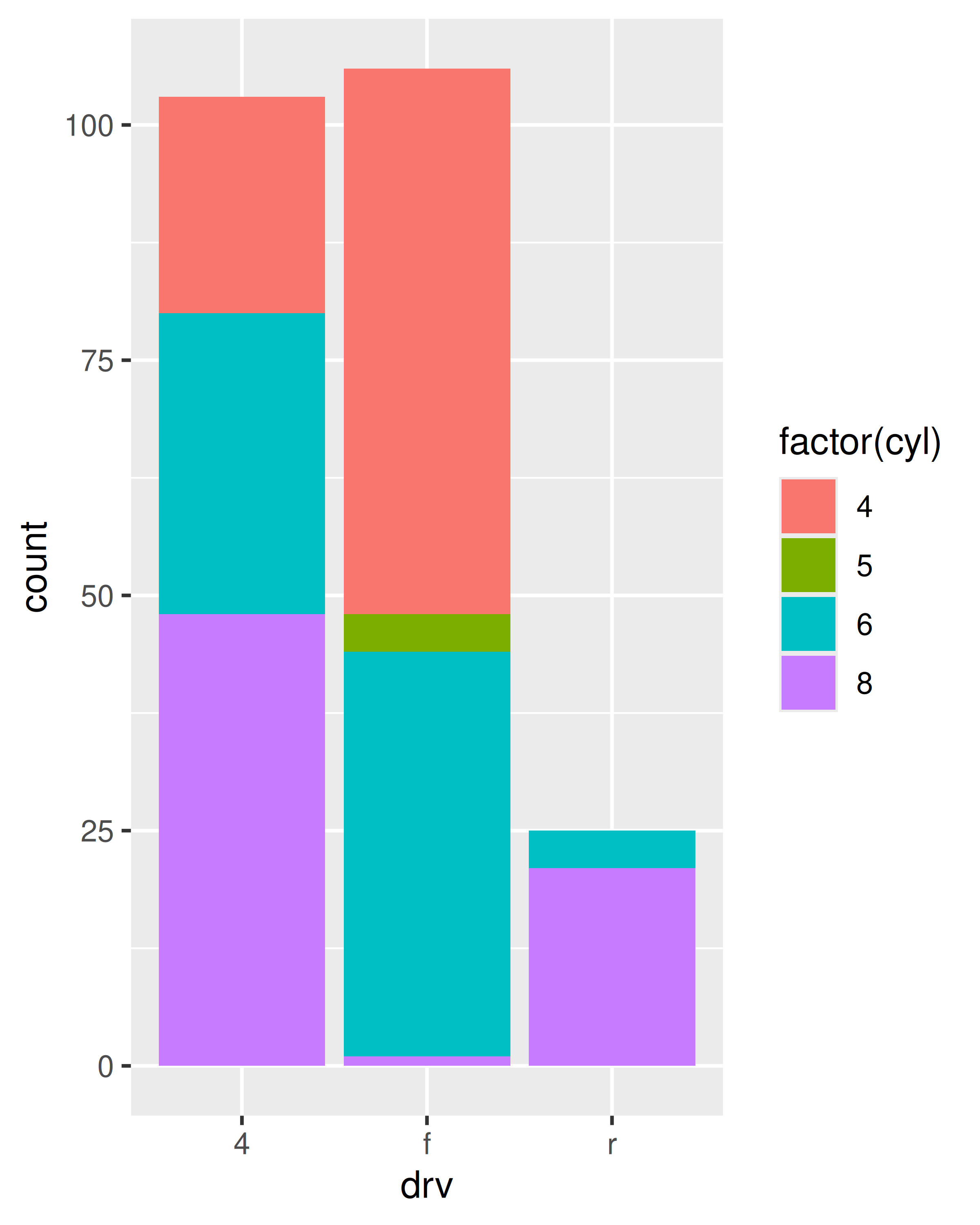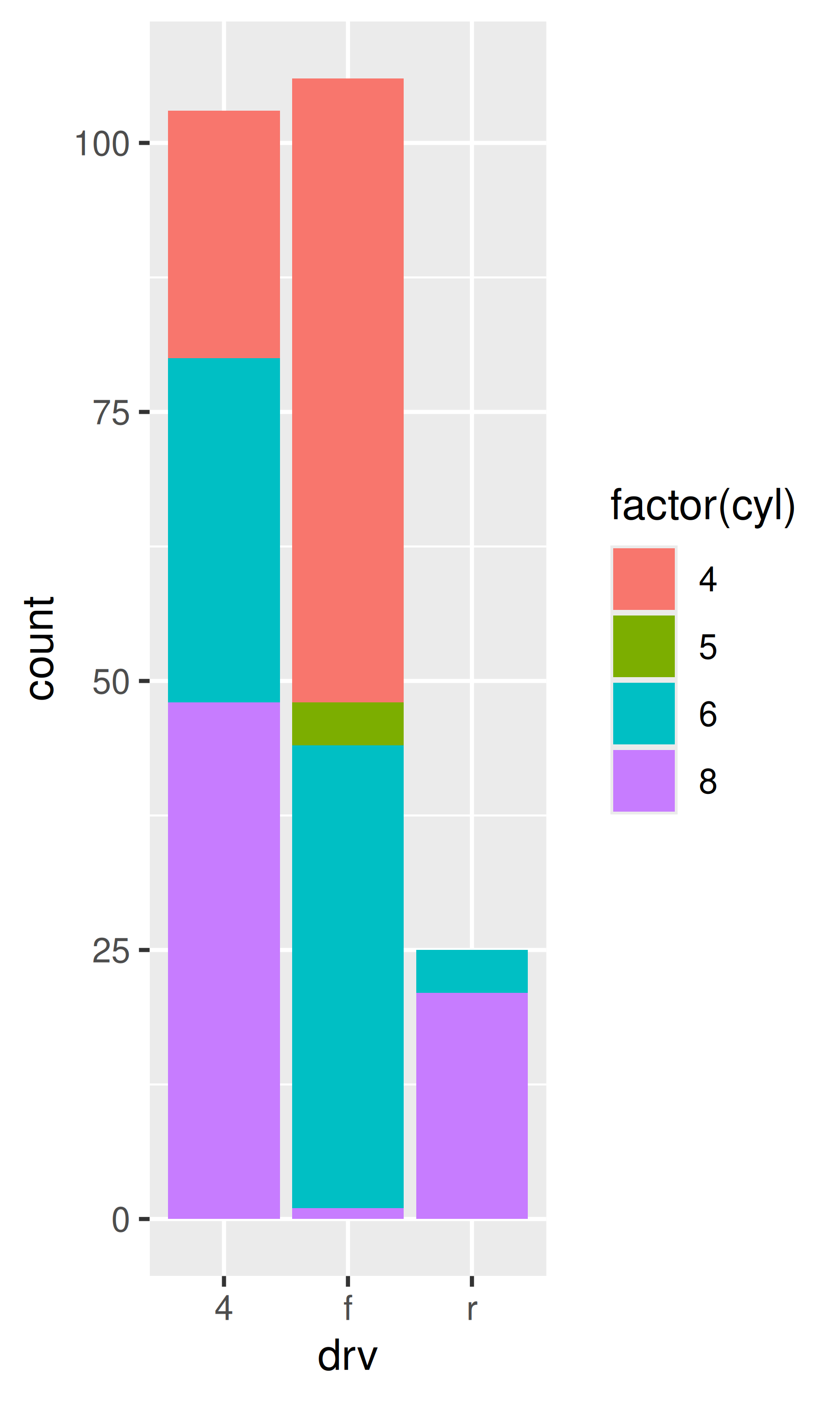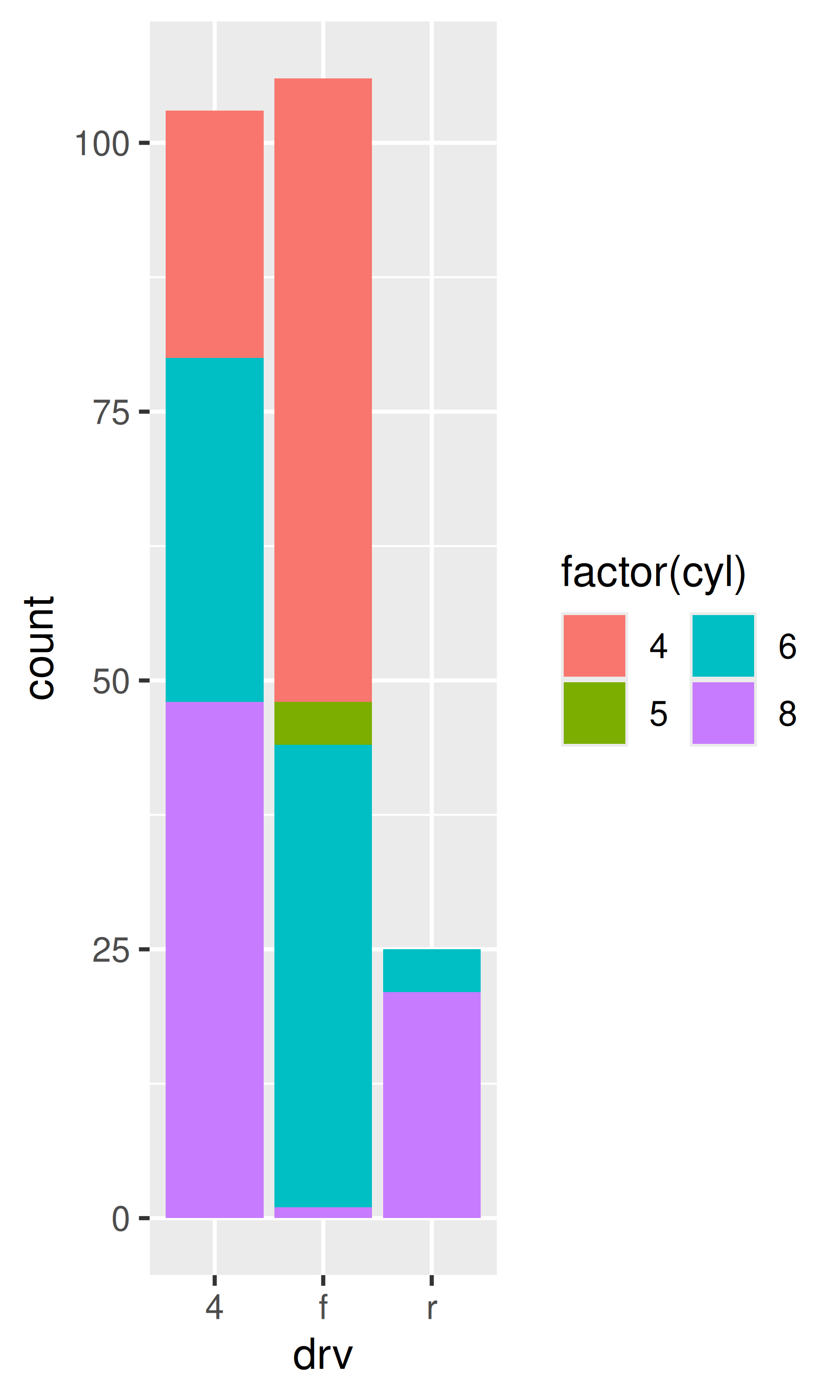 nrowoncolque especifican las dimensiones de la mesa.byrowcontrola cómo se llena la tabla:FALSEla llena por columna (el valor predeterminado),TRUEla llena por fila.base <- ggplot(mpg, aes(drv, fill = factor(cyl))) + geom_bar() base base + guides(fill = guide_legend(ncol = 2)) base + guides(fill = guide_legend(ncol = 2, byrow = TRUE))