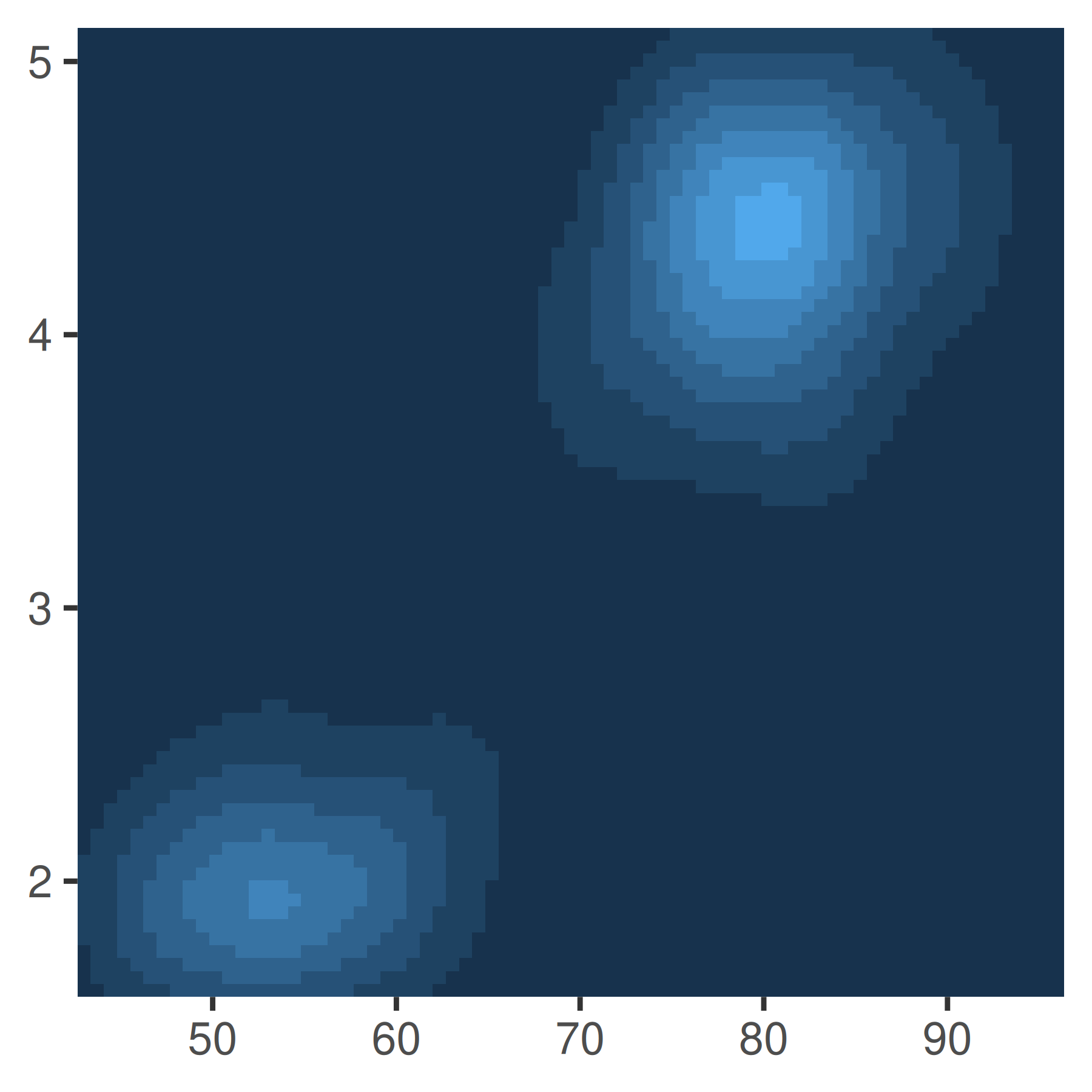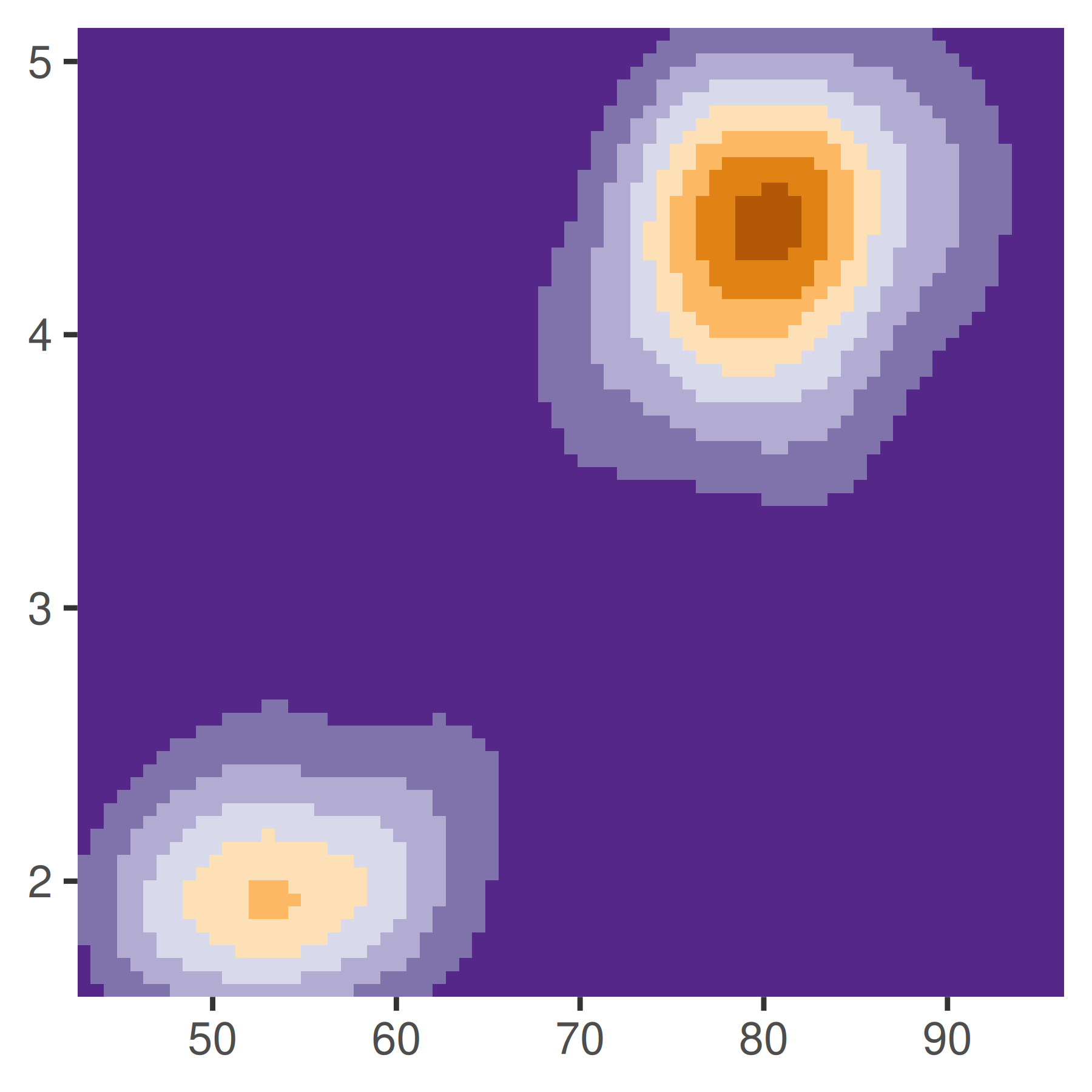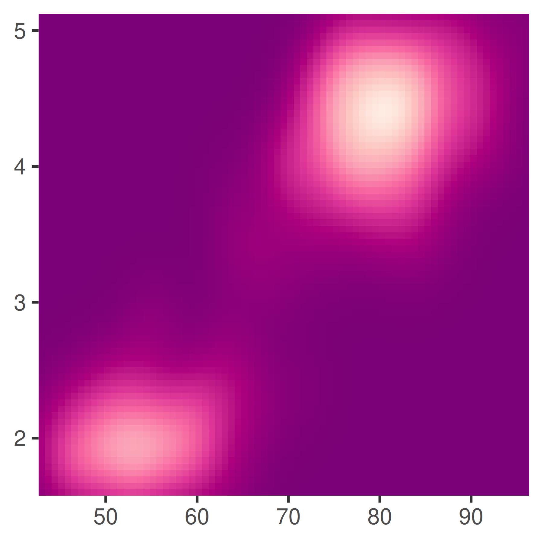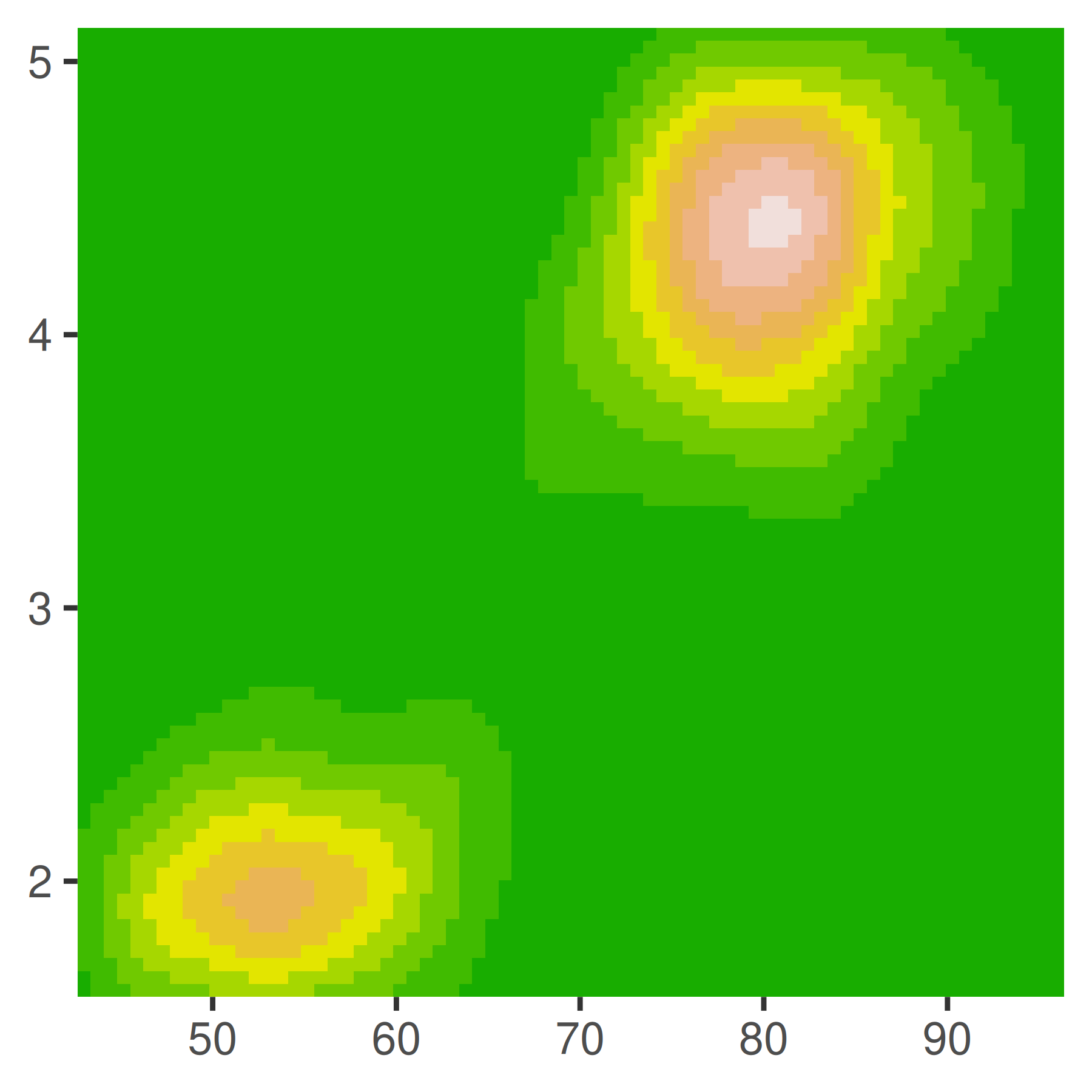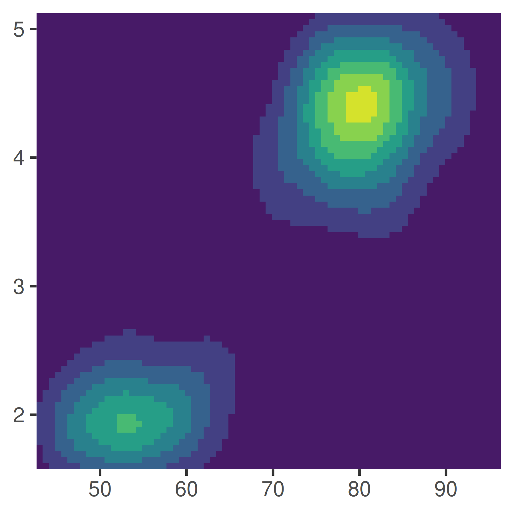 Los degradados de color se utilizan a menudo para mostrar la altura de una superficie 2D. Los gráficos de esta sección utilizan la superficie de una estimación de densidad 2D del conjunto de datos faithful (Azzalini y Bowman 1990), que registra el tiempo de espera entre erupciones y durante cada erupción del géiser Old Faithful en el Parque Yellowstone. Ocultamos las leyendas y configuramos expand en 0, para centrarnos en la apariencia de los datos. Recuerde: aunque usamos la gráfica erupt para ilustrar conceptos usando una estética de relleno, las mismas ideas se aplican a las escalas de color. Cada vez que hacemos referencia a scale_fill_*() en esta sección, hay un scale_color_*() correspondiente para la estética del color (o scale_color_*() si prefiere la ortografía estadounidense).