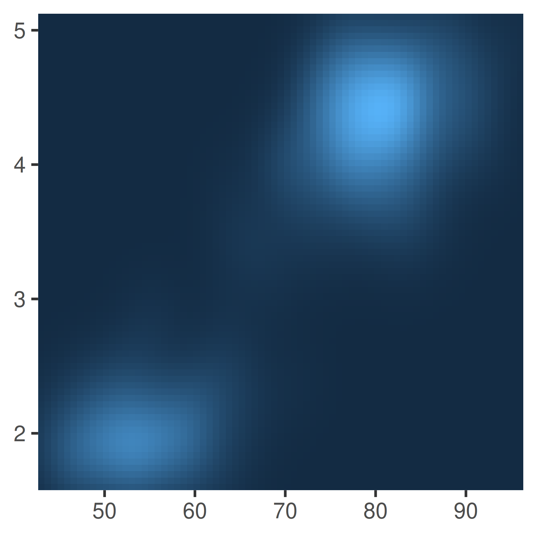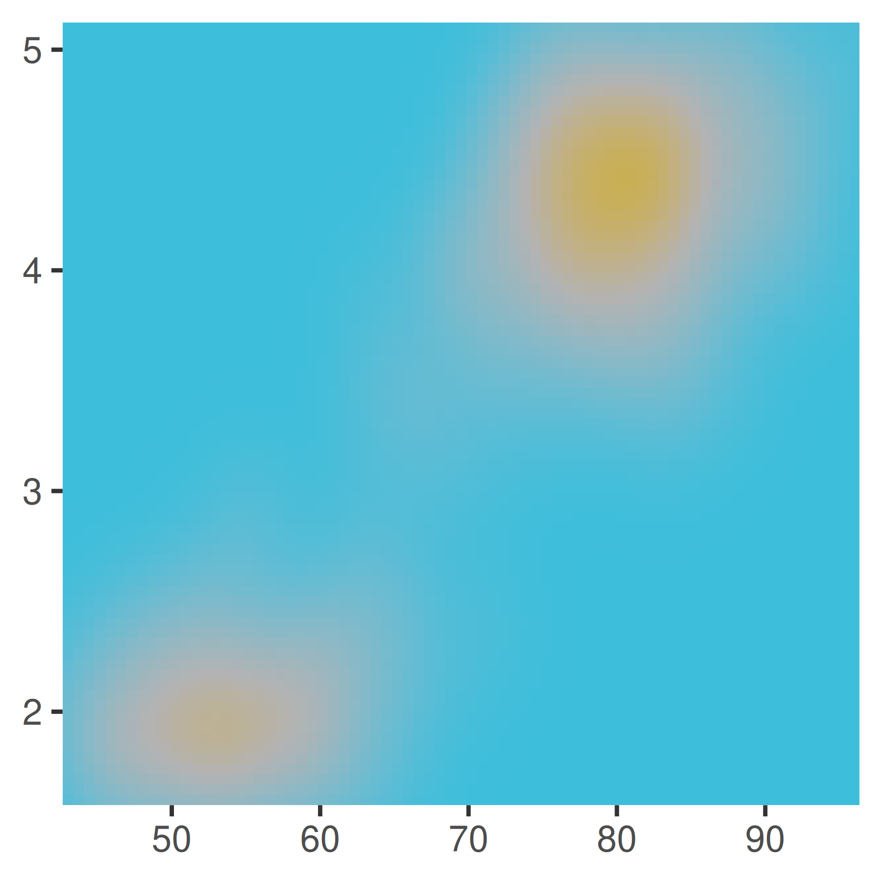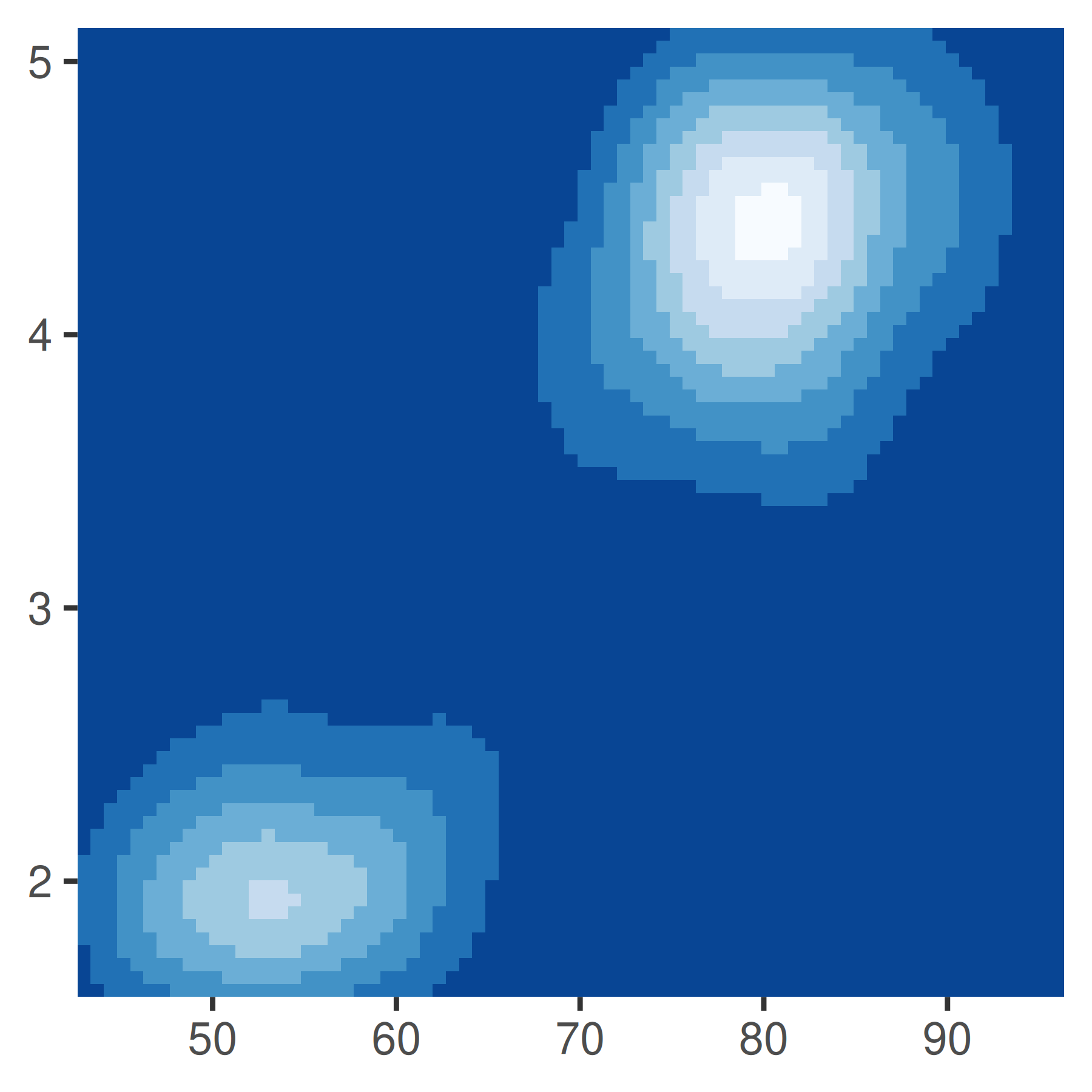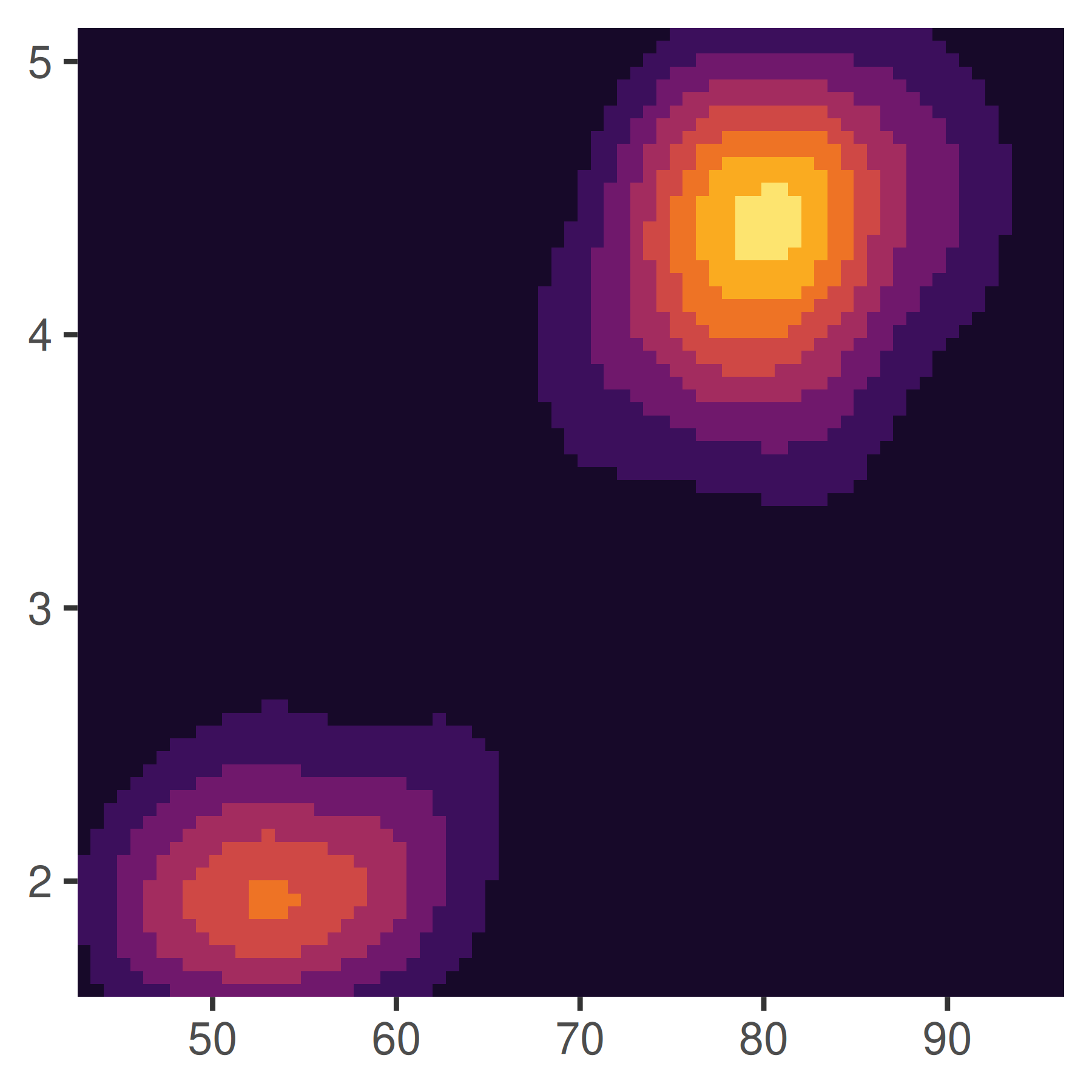 Los degradados de color se utilizan a menudo para mostrar la altura de una superficie 2D. Los gráficos de esta sección utilizan la superficie de una estimación de densidad 2D del conjunto de datos faithful (Azzalini y Bowman 1990), que registra el tiempo de espera entre erupciones y durante cada erupción del géiser Old Faithful en el Parque Yellowstone. Ocultamos las leyendas y configuramos expand en 0, para centrarnos en la apariencia de los datos. Recuerde: aunque usamos la gráfica erupt para ilustrar conceptos usando una estética de relleno, las mismas ideas se aplican a las escalas de color. Cada vez que hacemos referencia a scale_fill_*() en esta sección, hay un scale_color_*() correspondiente para la estética del color (o scale_color_*() si prefiere la ortografía estadounidense).