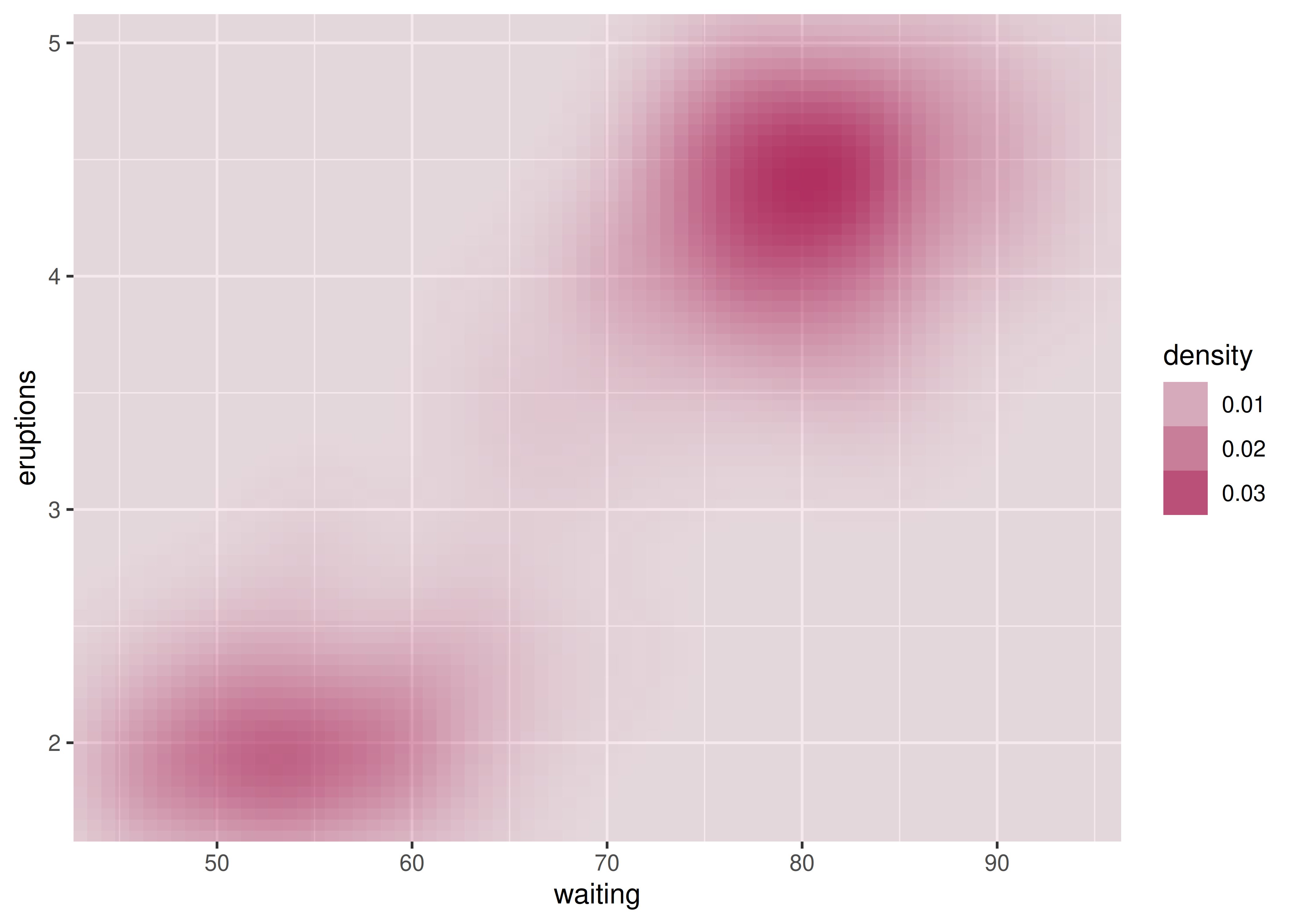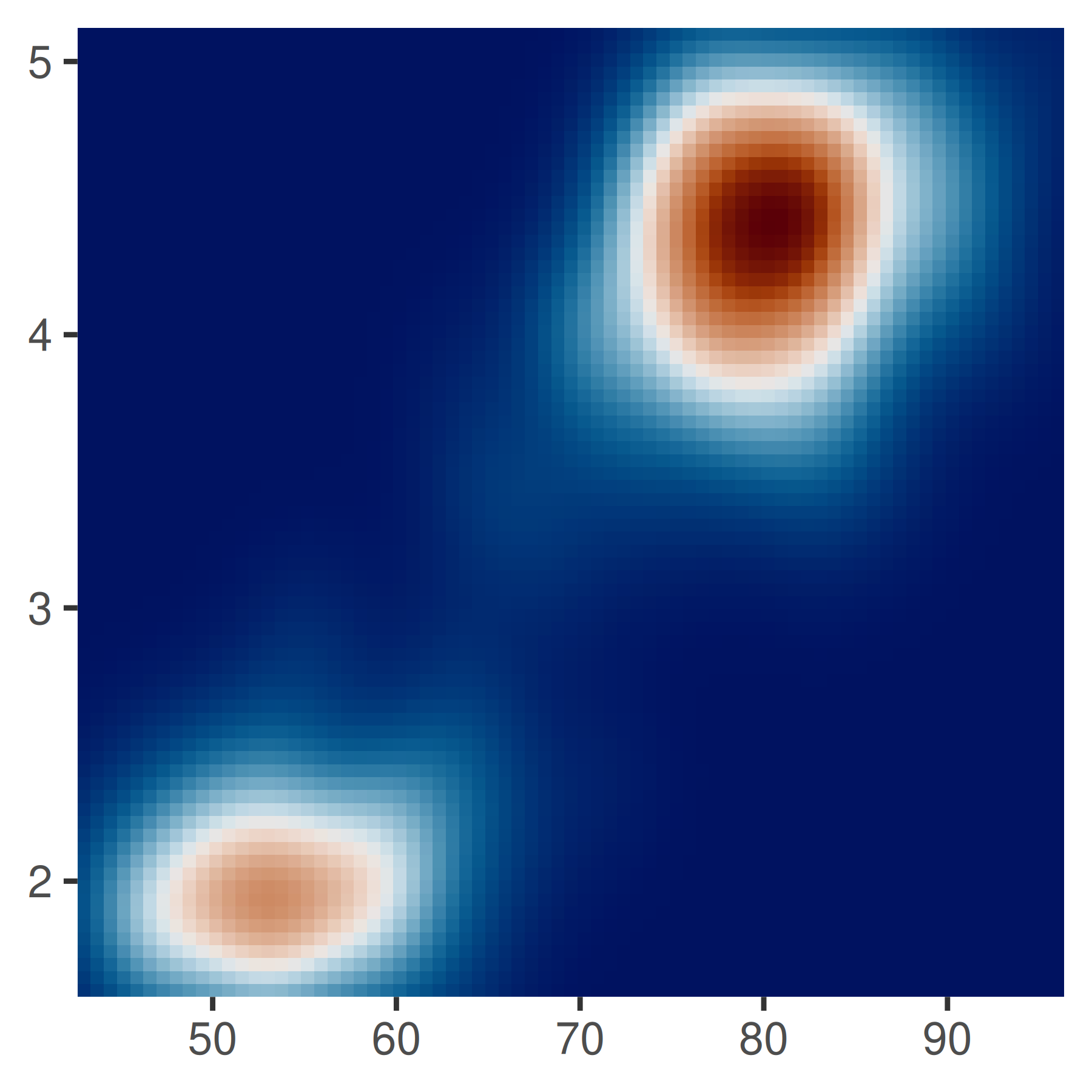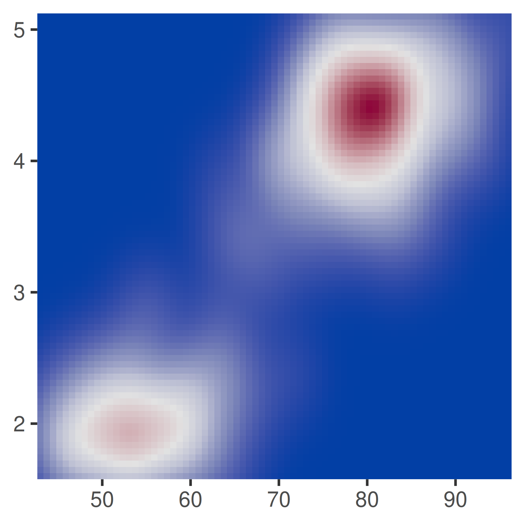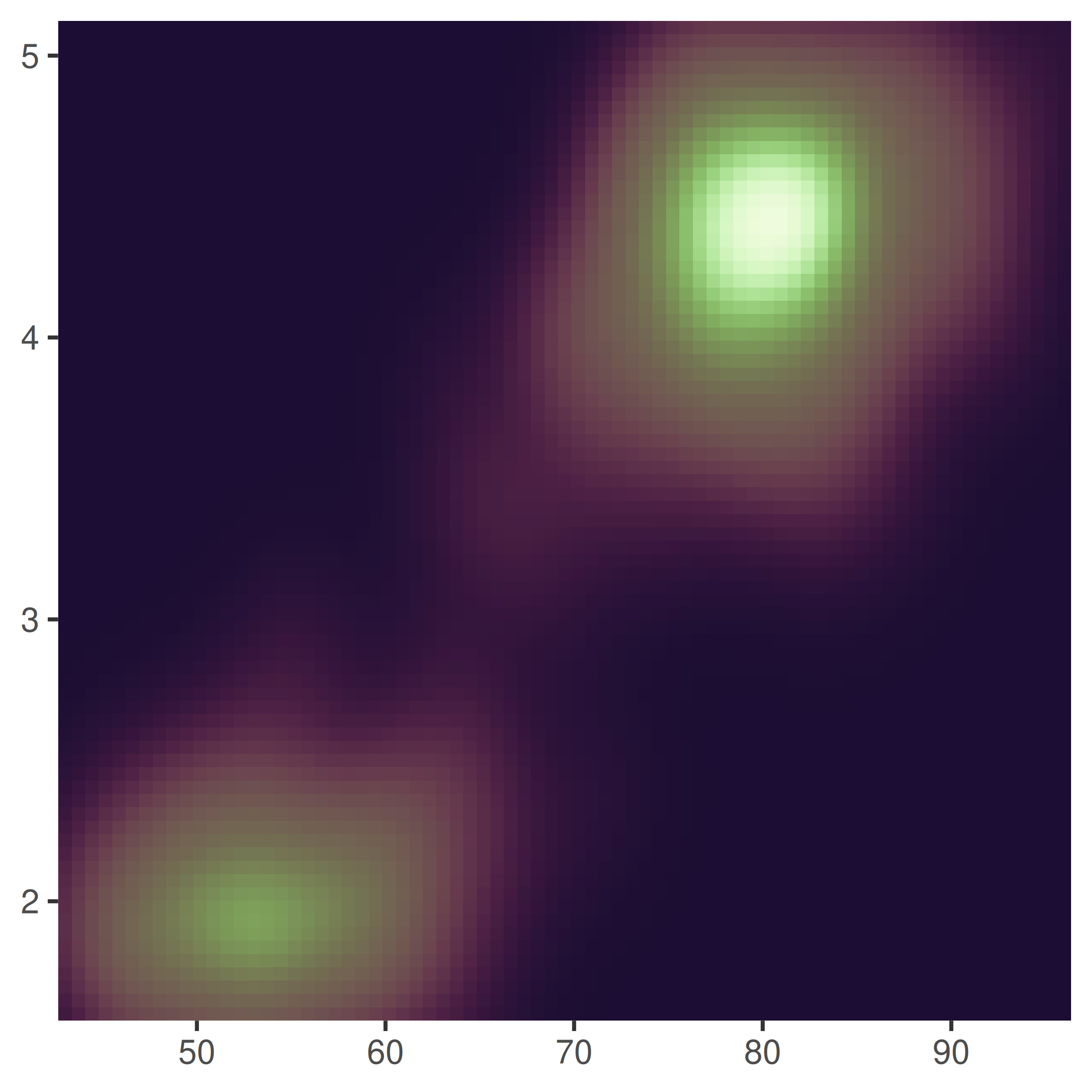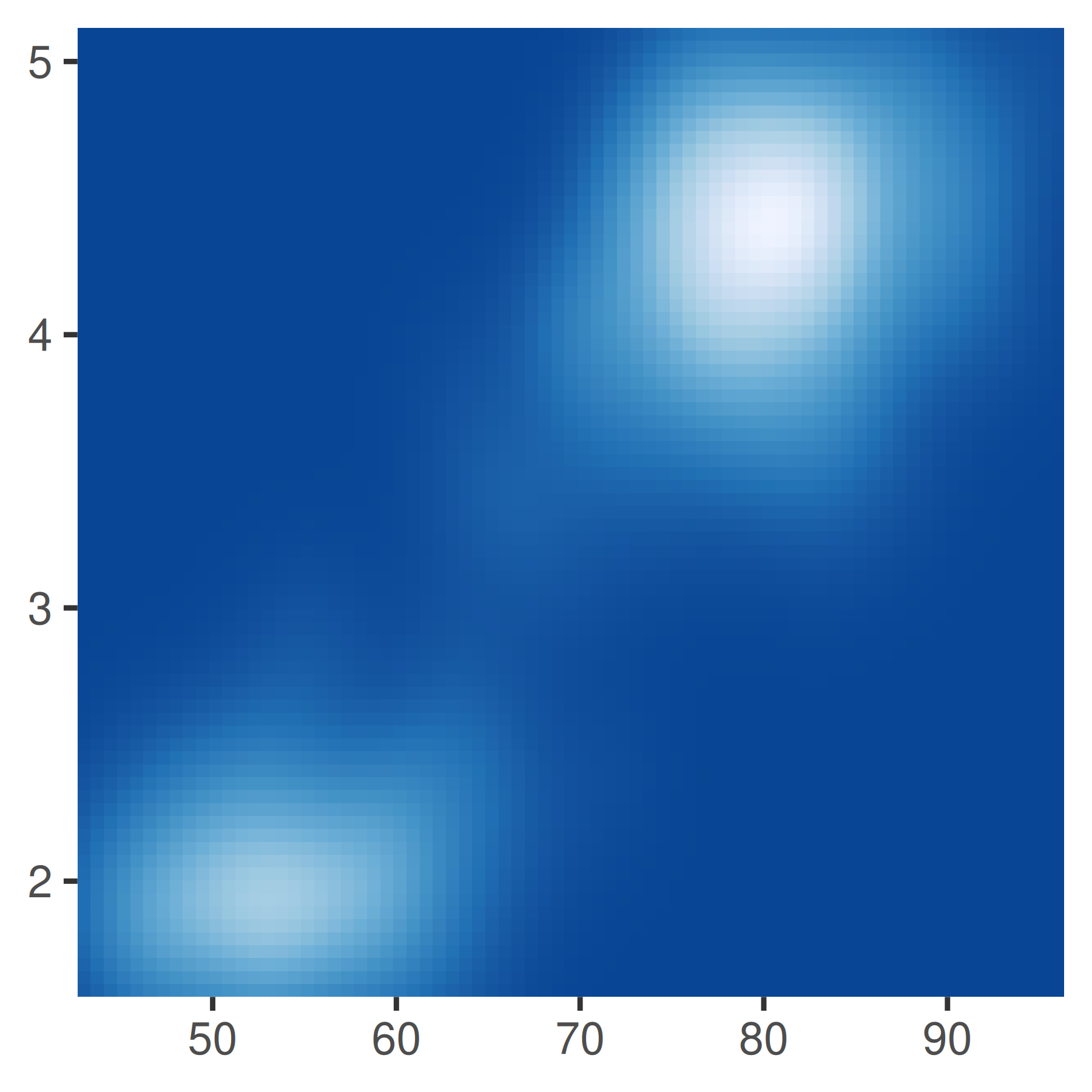 Los degradados de color se utilizan a menudo para mostrar la altura de una superficie 2D. Los gráficos de esta sección utilizan la superficie de una estimación de densidad 2D del conjunto de datos faithful (Azzalini y Bowman 1990), que registra el tiempo de espera entre erupciones y durante cada erupción del géiser Old Faithful en el Parque Yellowstone. Ocultamos las leyendas y configuramos expand en 0, para centrarnos en la apariencia de los datos. Recuerde: aunque usamos la gráfica erupt para ilustrar conceptos usando una estética de relleno, las mismas ideas se aplican a las escalas de color. Cada vez que hacemos referencia a scale_fill_*() en esta sección, hay un scale_color_*() correspondiente para la estética del color (o scale_color_*() si prefiere la ortografía estadounidense).