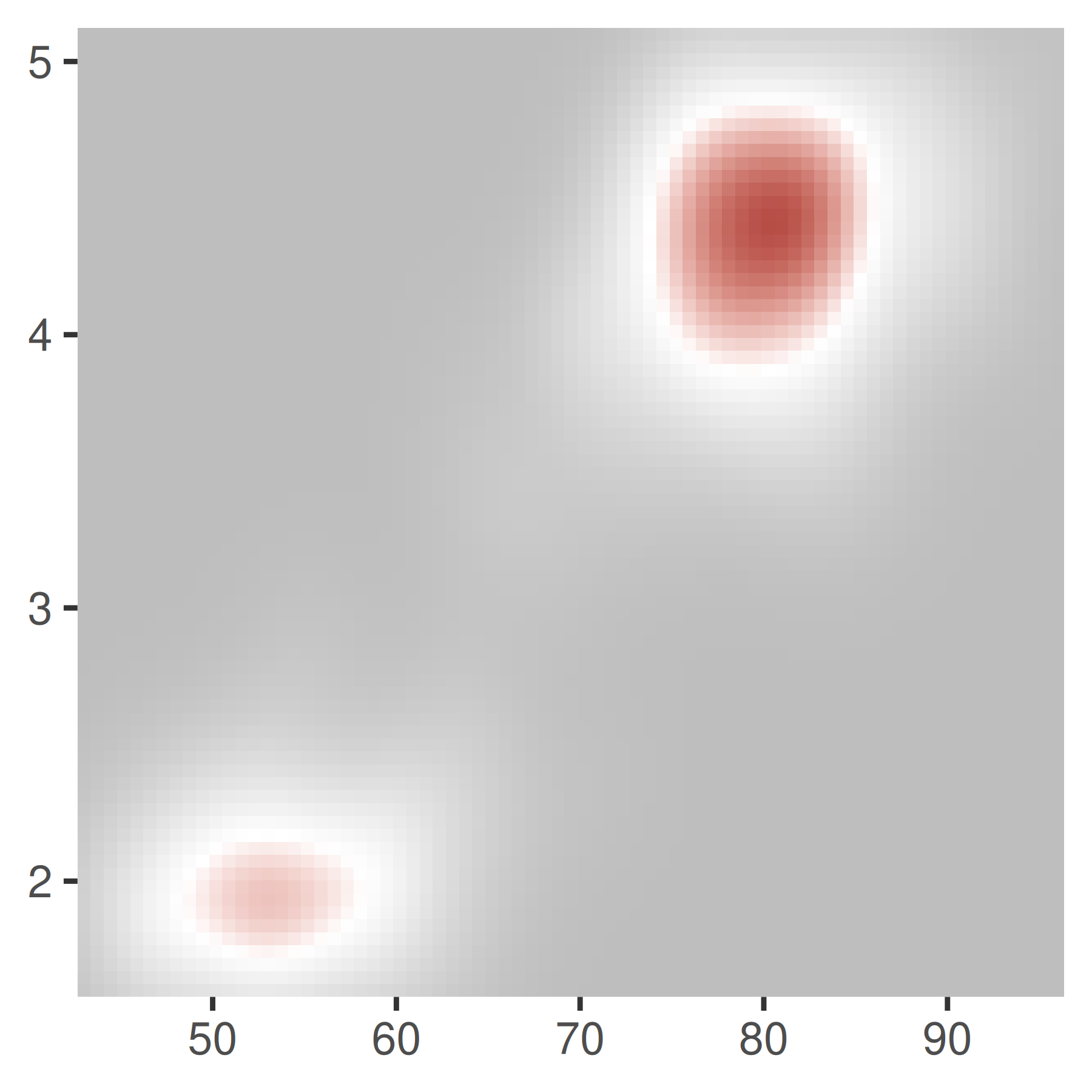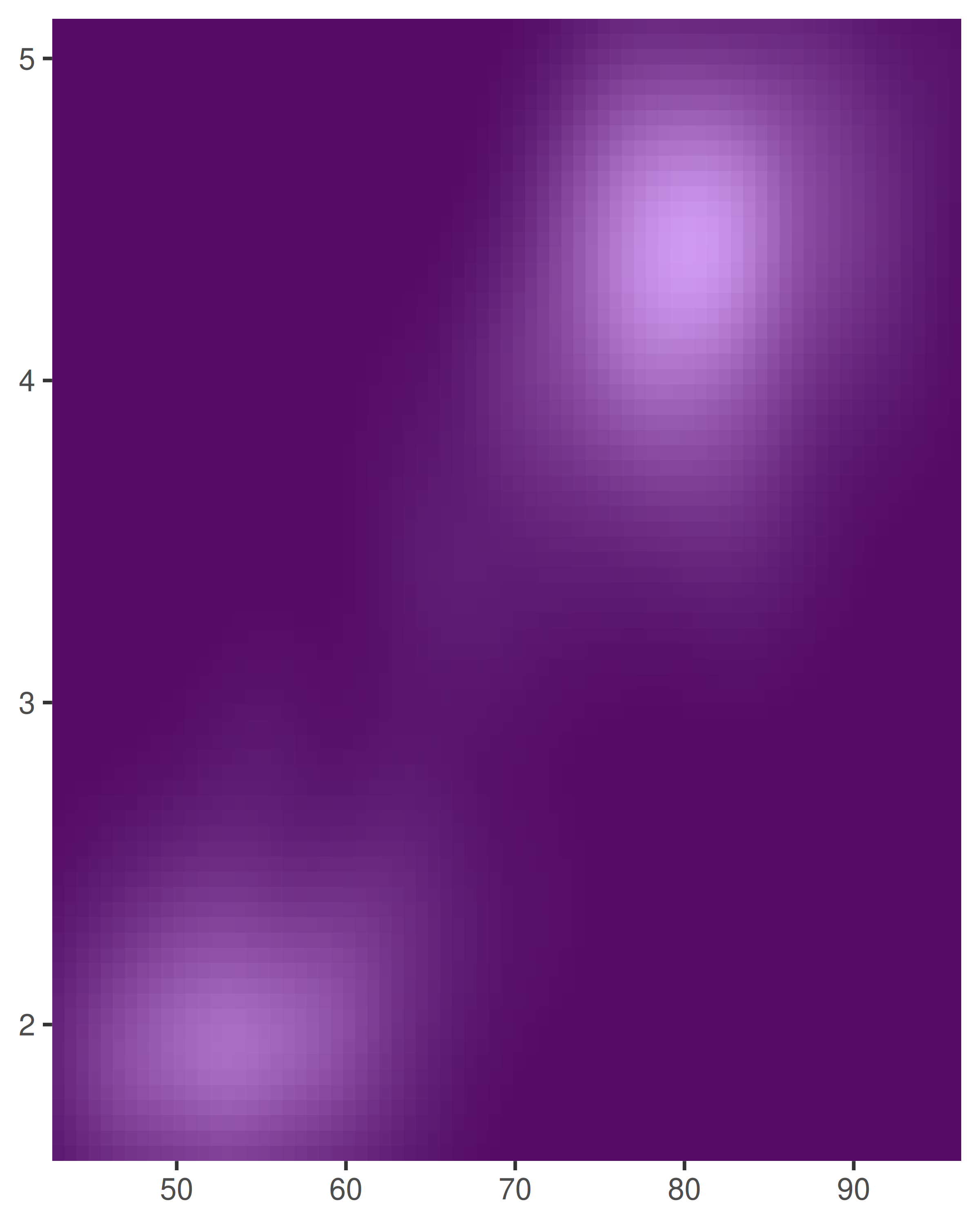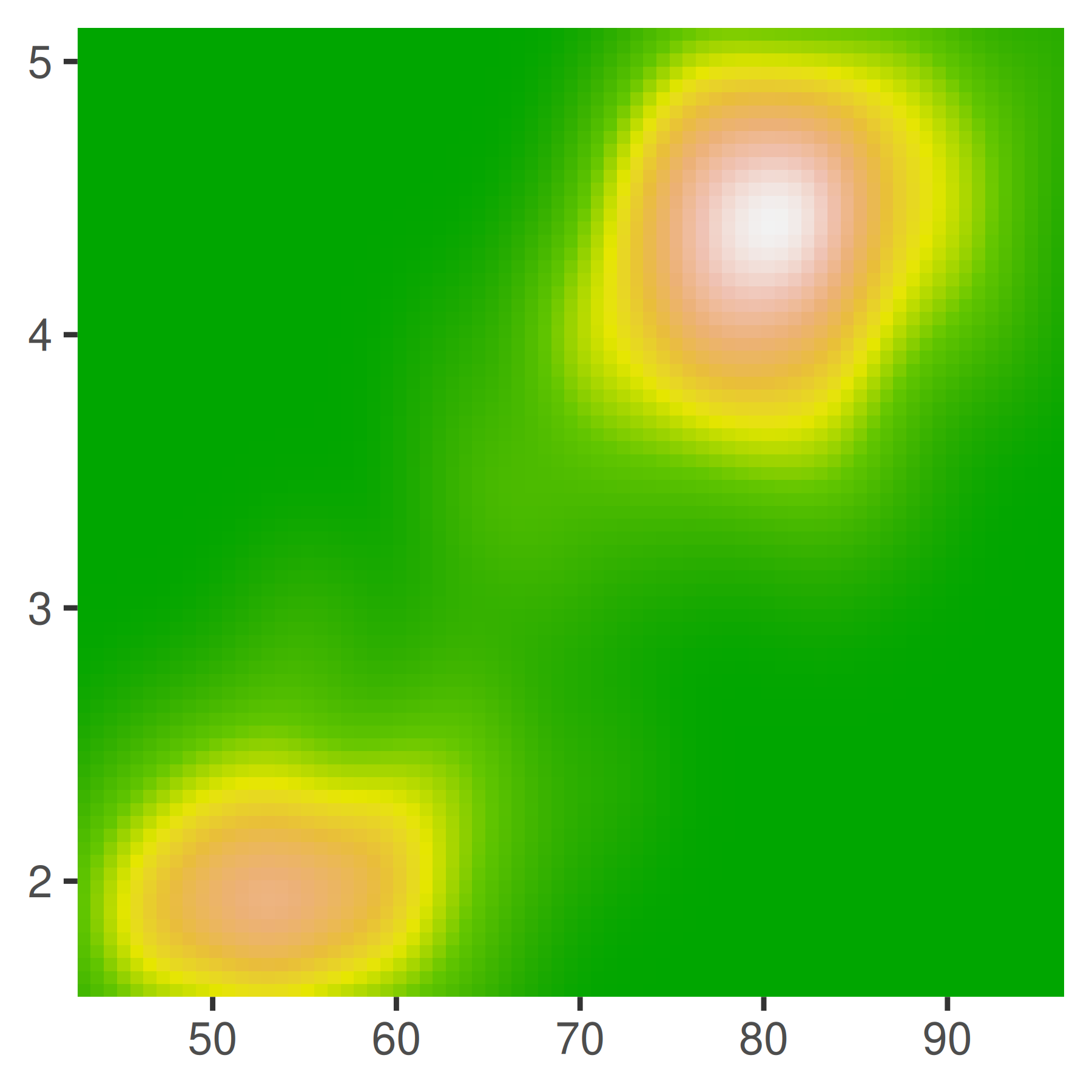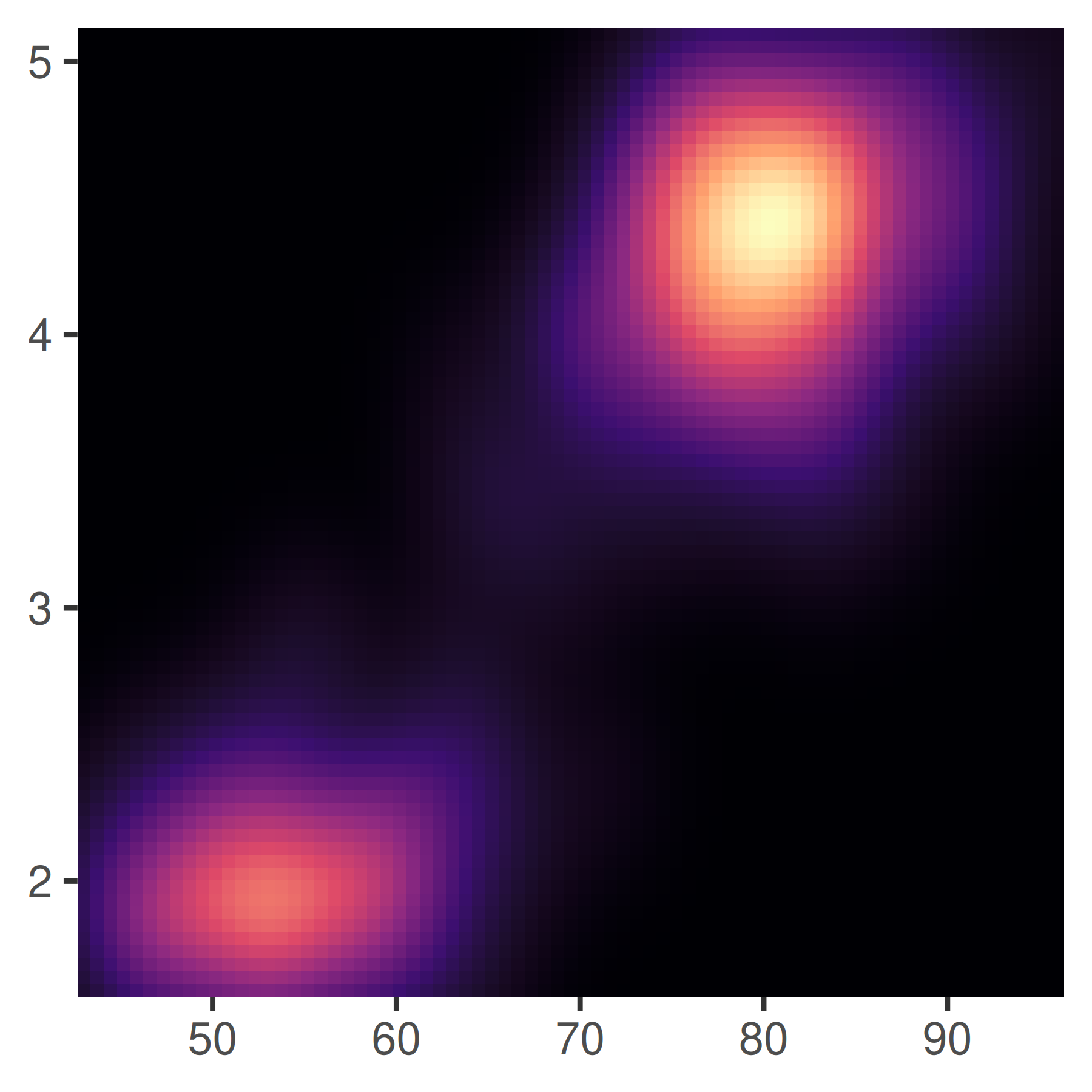 Los degradados de color se utilizan a menudo para mostrar la altura de una superficie 2D. Los gráficos de esta sección utilizan la superficie de una estimación de densidad 2D del conjunto de datos faithful (Azzalini y Bowman 1990), que registra el tiempo de espera entre erupciones y durante cada erupción del géiser Old Faithful en el Parque Yellowstone. Ocultamos las leyendas y configuramos expand en 0, para centrarnos en la apariencia de los datos. Recuerde: aunque usamos la gráfica erupt para ilustrar conceptos usando una estética de relleno, las mismas ideas se aplican a las escalas de color. Cada vez que hacemos referencia a scale_fill_*() en esta sección, hay un scale_color_*() correspondiente para la estética del color (o scale_color_*() si prefiere la ortografía estadounidense).