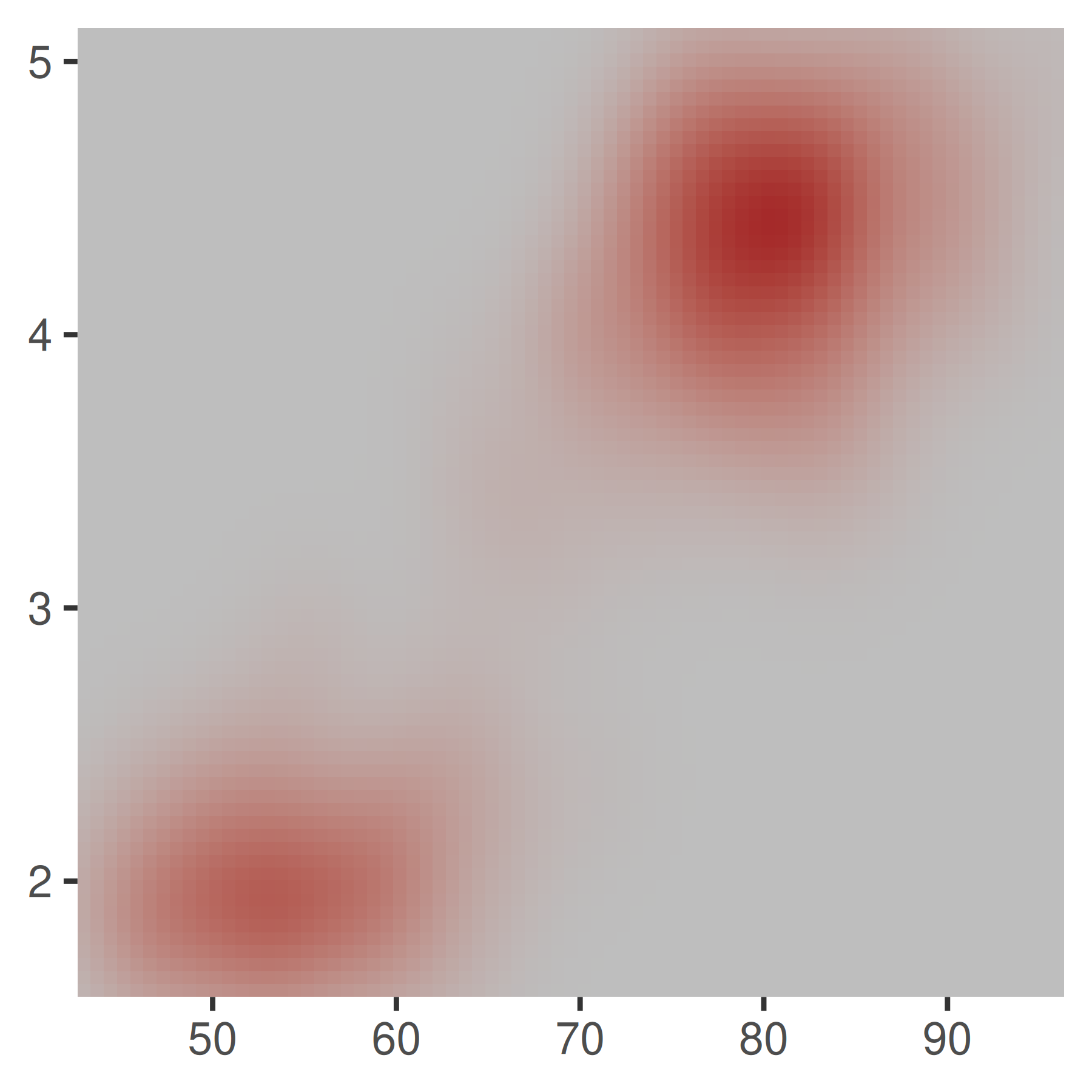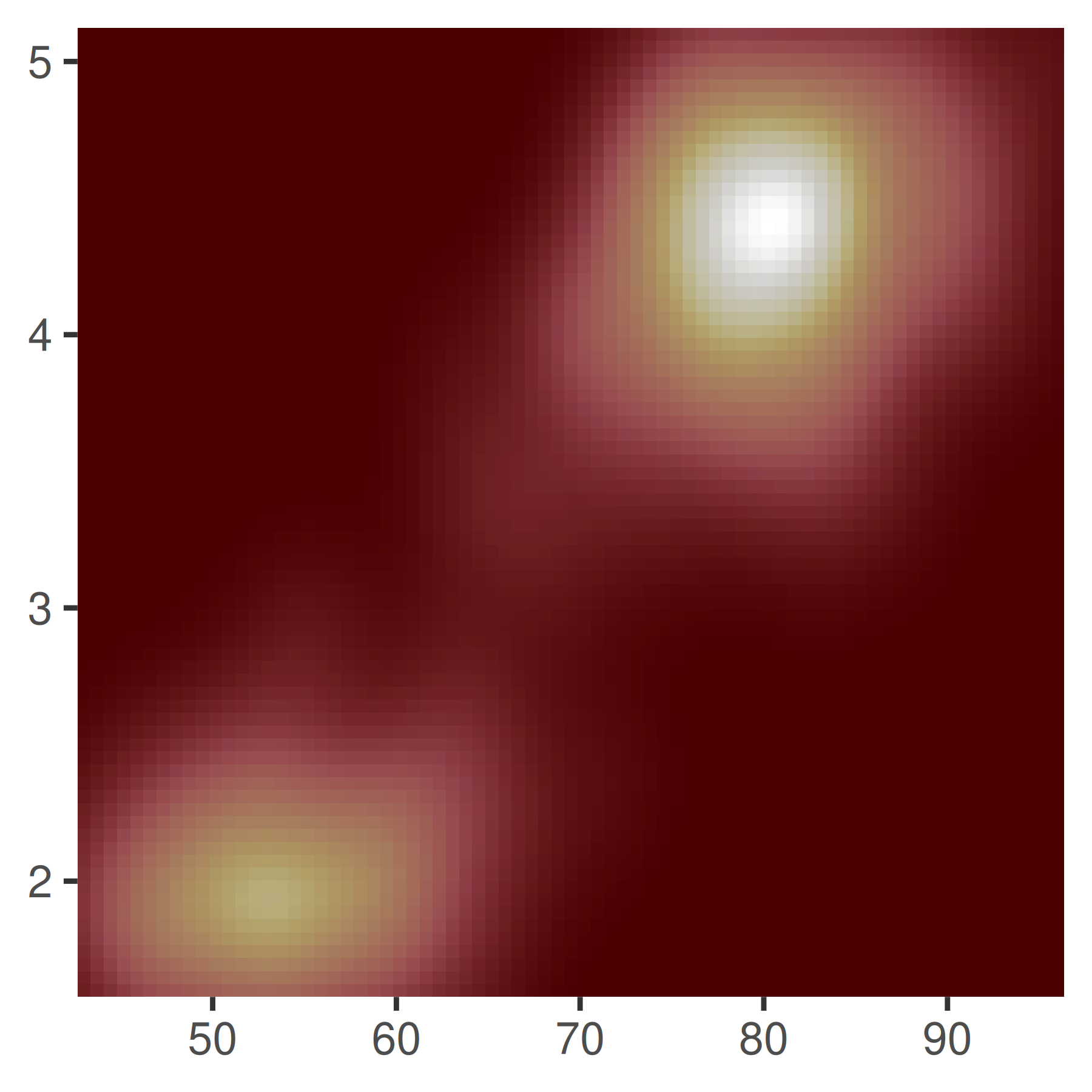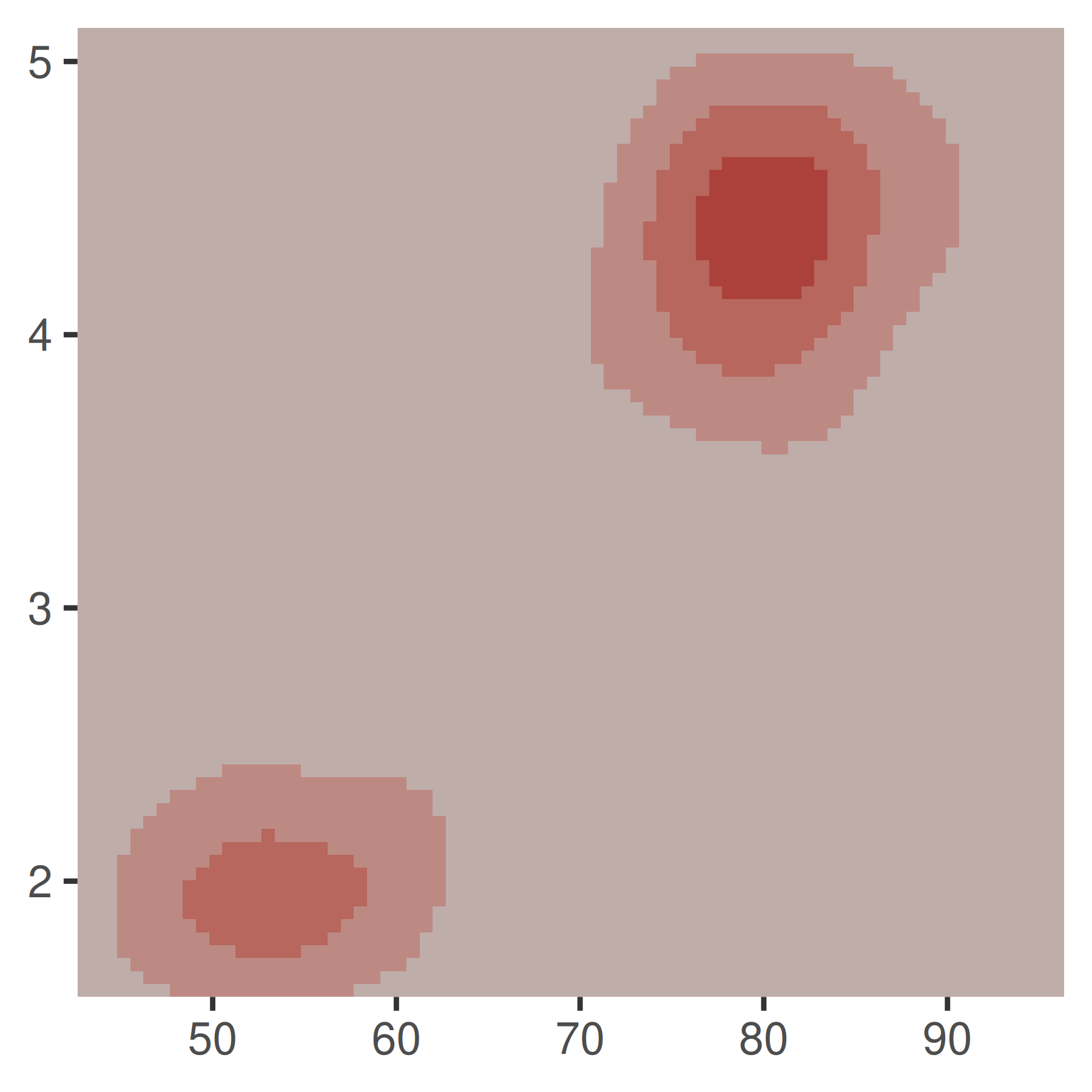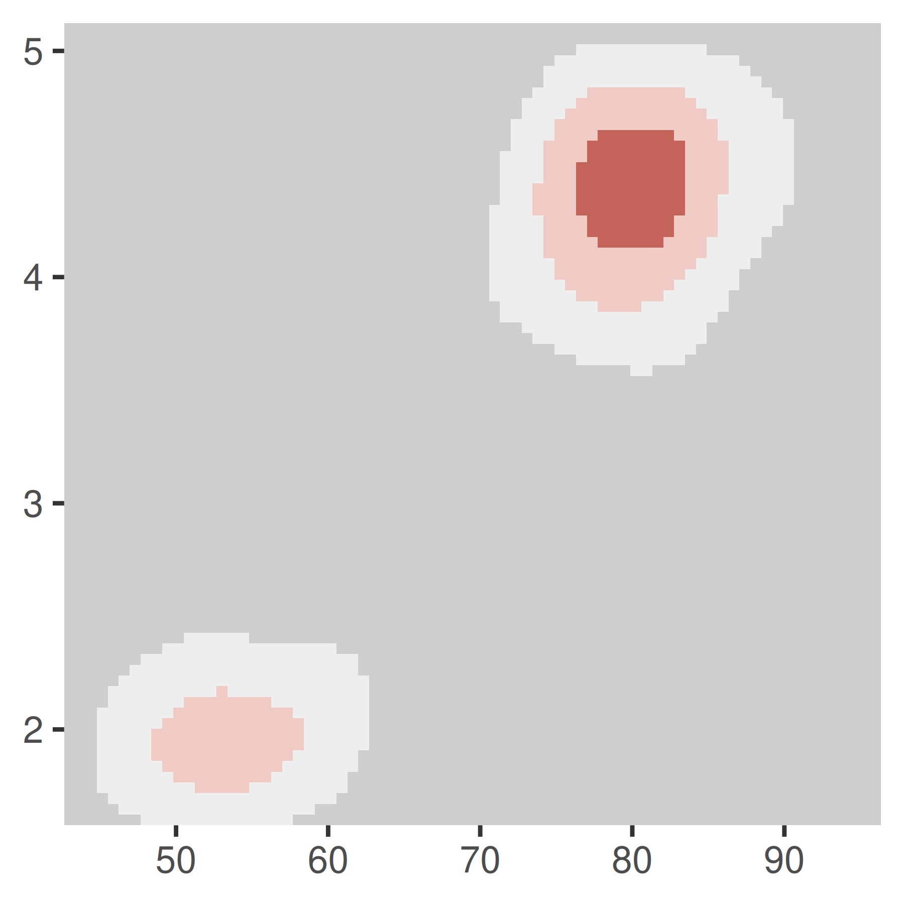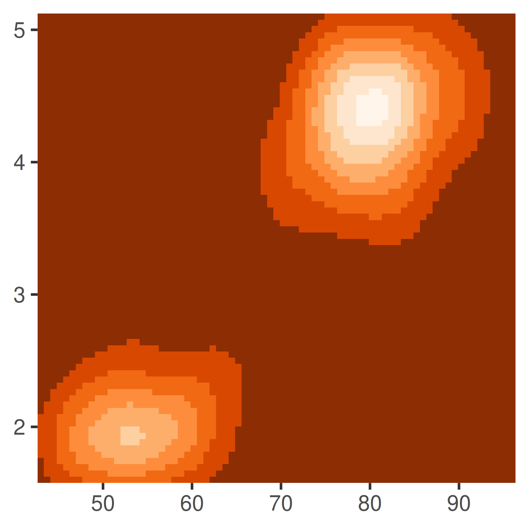 Los degradados de color se utilizan a menudo para mostrar la altura de una superficie 2D. Los gráficos de esta sección utilizan la superficie de una estimación de densidad 2D del conjunto de datos faithful (Azzalini y Bowman 1990), que registra el tiempo de espera entre erupciones y durante cada erupción del géiser Old Faithful en el Parque Yellowstone. Ocultamos las leyendas y configuramos expand en 0, para centrarnos en la apariencia de los datos. Recuerde: aunque usamos la gráfica erupt para ilustrar conceptos usando una estética de relleno, las mismas ideas se aplican a las escalas de color. Cada vez que hacemos referencia a scale_fill_*() en esta sección, hay un scale_color_*() correspondiente para la estética del color (o scale_color_*() si prefiere la ortografía estadounidense).