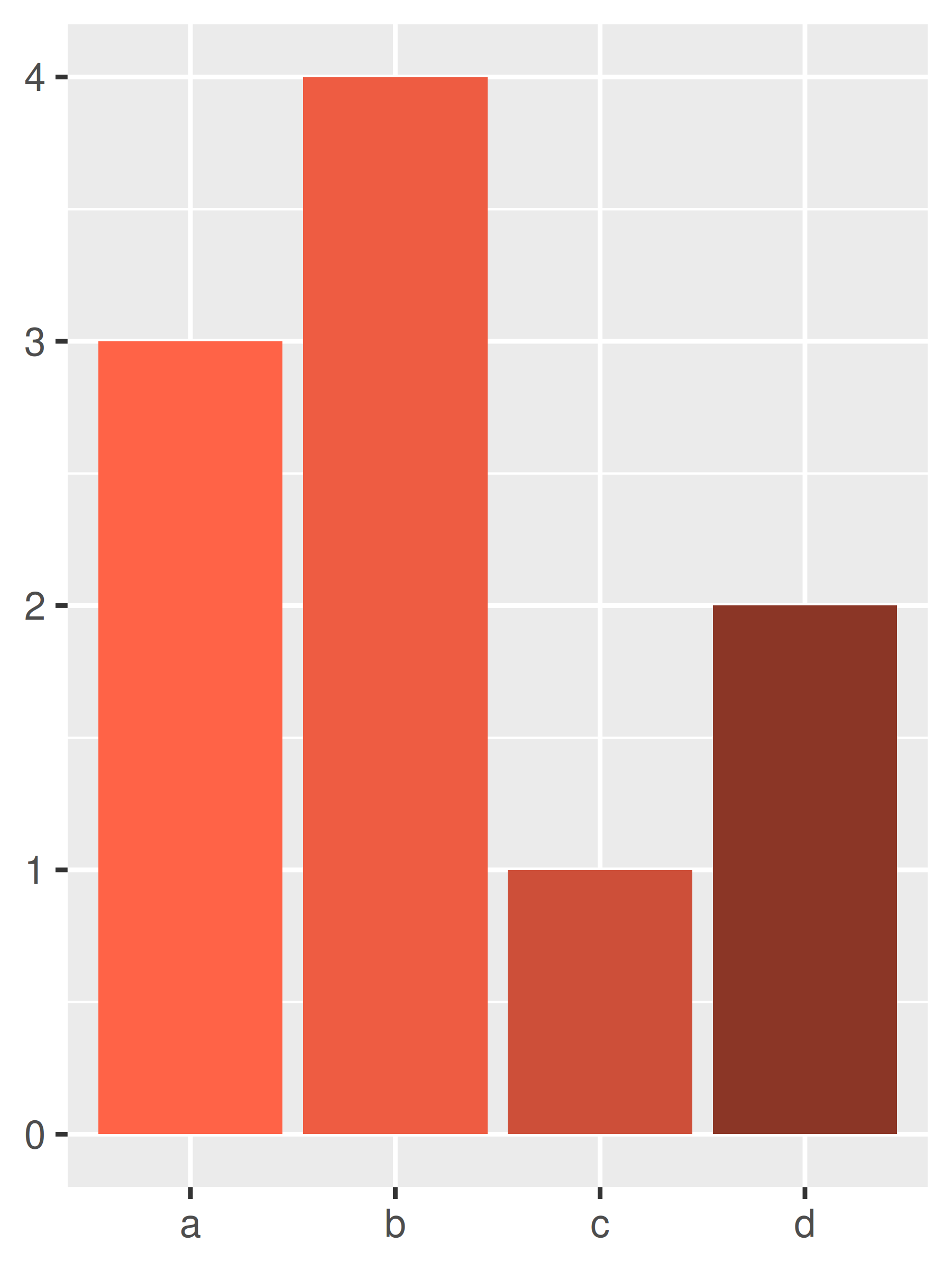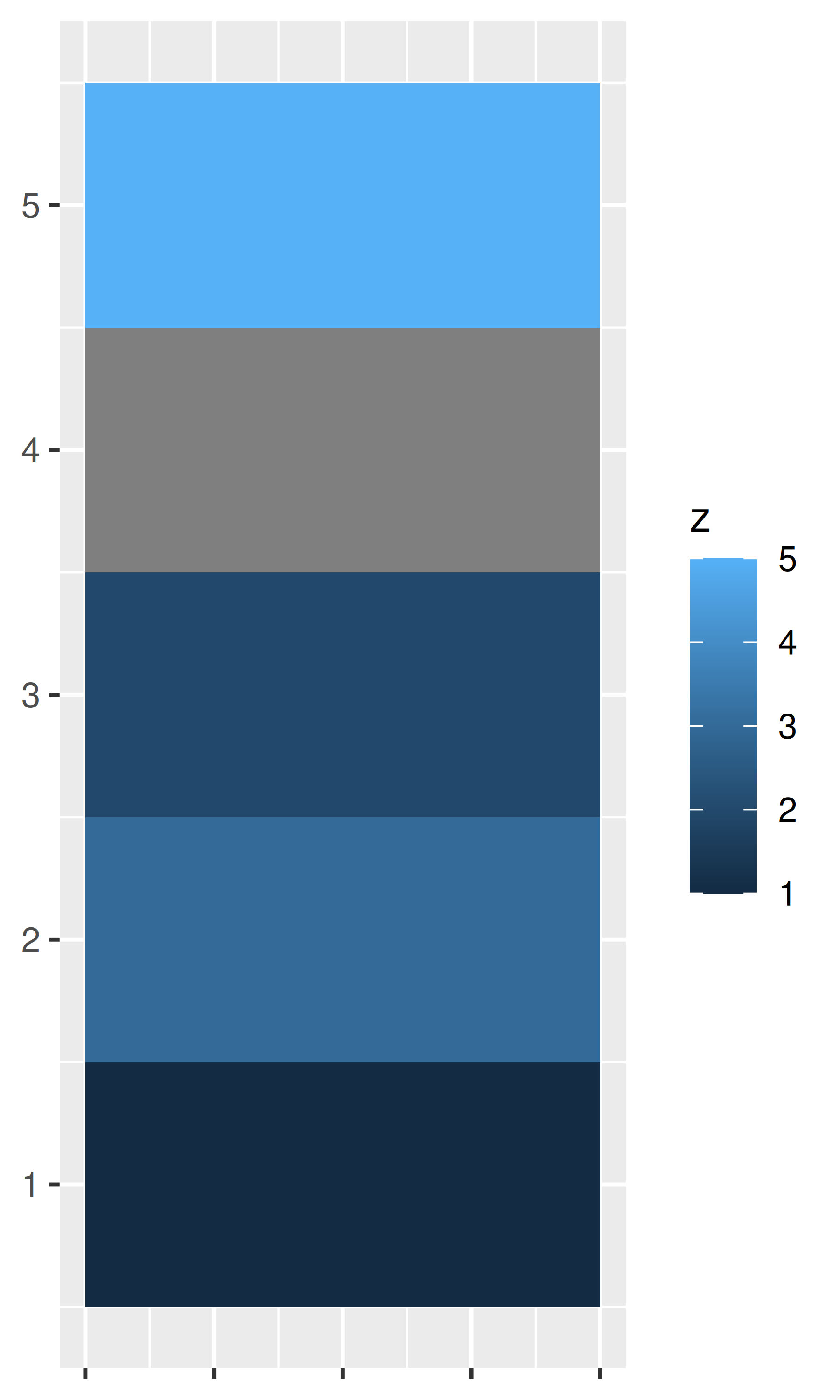 The use of gradient scales is illustrated below. The first plot uses a scale that linearly interpolates from grey (hex code: "#bebebe") at the low end of the scale limits to brown ("#a52a2a") at the high end. The second plot has the same endpoints but uses scale_fill_gradient2() to interpolate first from grey to white (#ffffff) and then from white to brown. Note that the mid argument specifies the colour to be shown at the intermediate point, and midpoint is the value in the data at which this colour is used (the default is midpoint = 0). The third method is to use scale_fill_gradientn() which takes a vector of reference colours as its argument, and constructs a scale that linearly interpolates between the specified values. By default, the colours are presumed to be equally spaced along the scale, but if you prefer you can specify a vector of values that correspond to each of the reference colours.