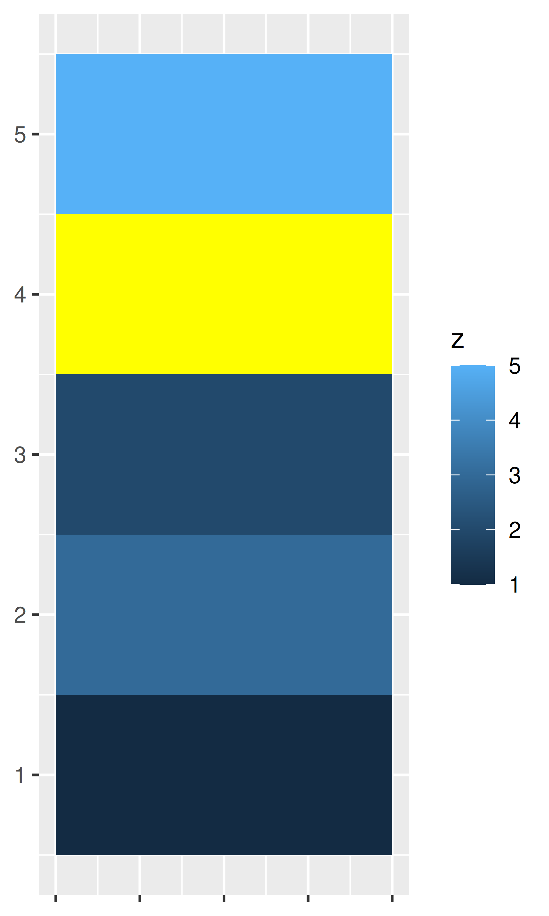 Las escalas de gradiente de tres puntos tienen criterios de diseño ligeramente diferentes. Normalmente, el objetivo de una escala de este tipo es transmitir la impresión perceptiva de que existe un punto medio natural (a menudo un valor cero) del cual divergen los demás valores. El gráfico de la izquierda a continuación muestra cómo crear una escala divergente “amarillo/azul”, aunque es un poco artificial en este ejemplo.
