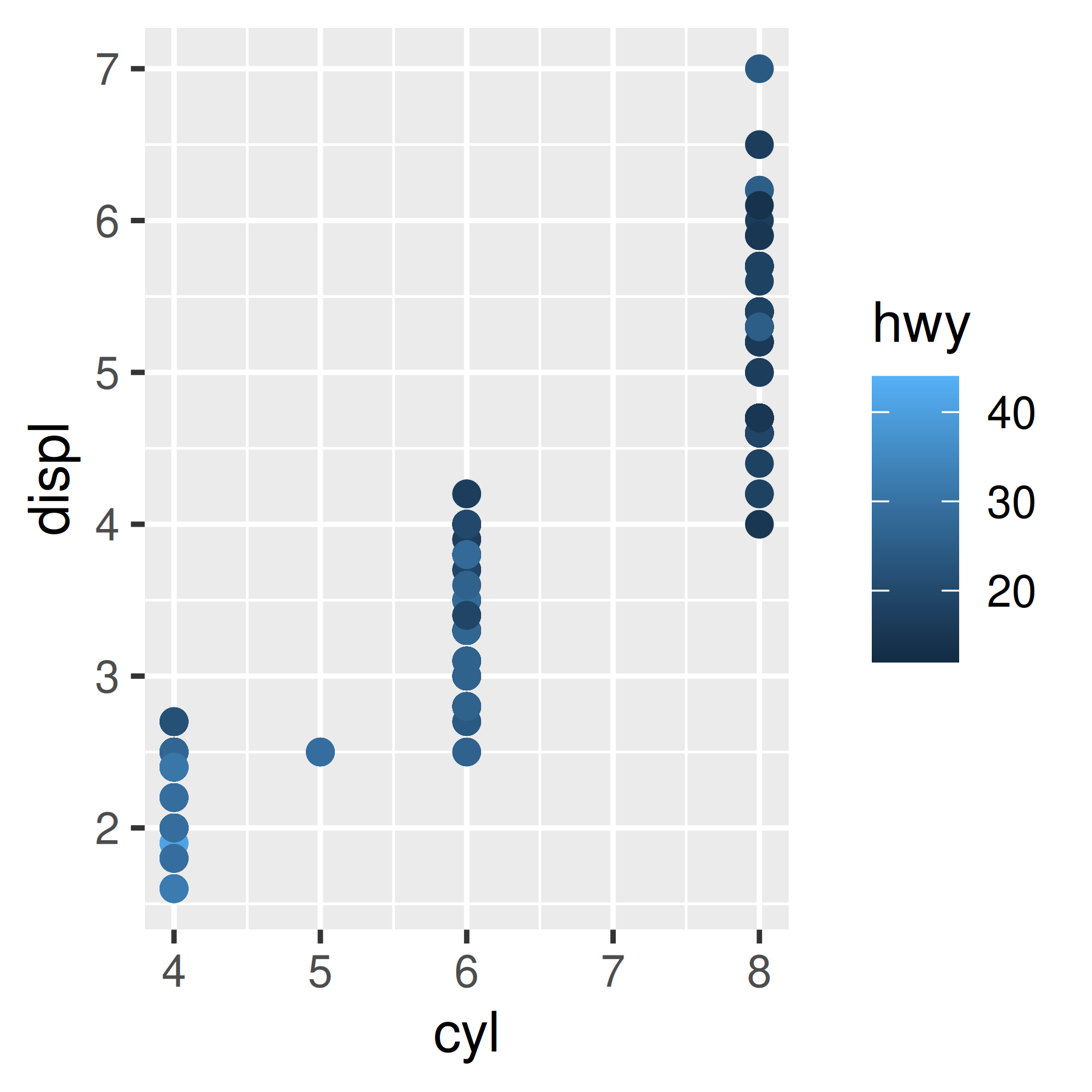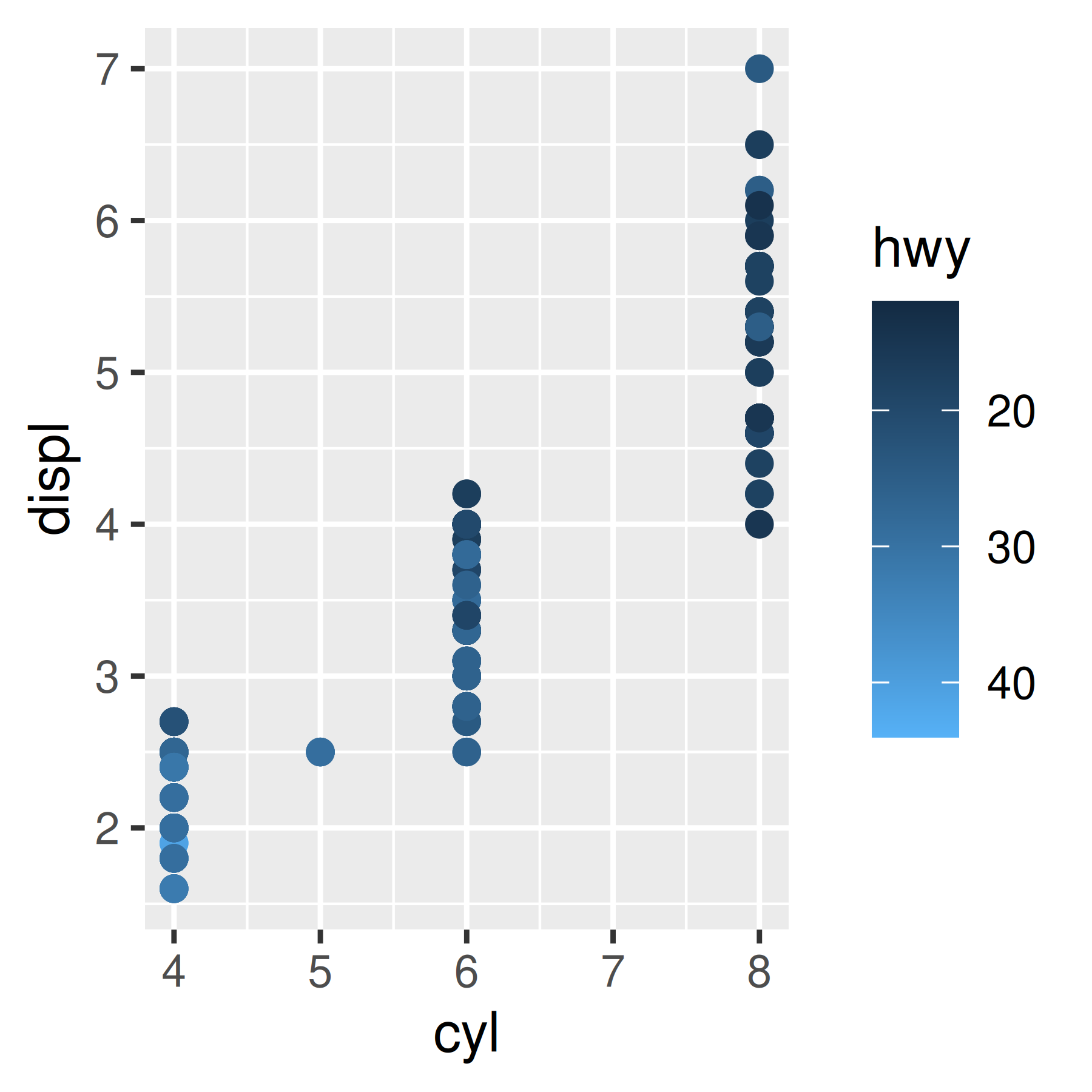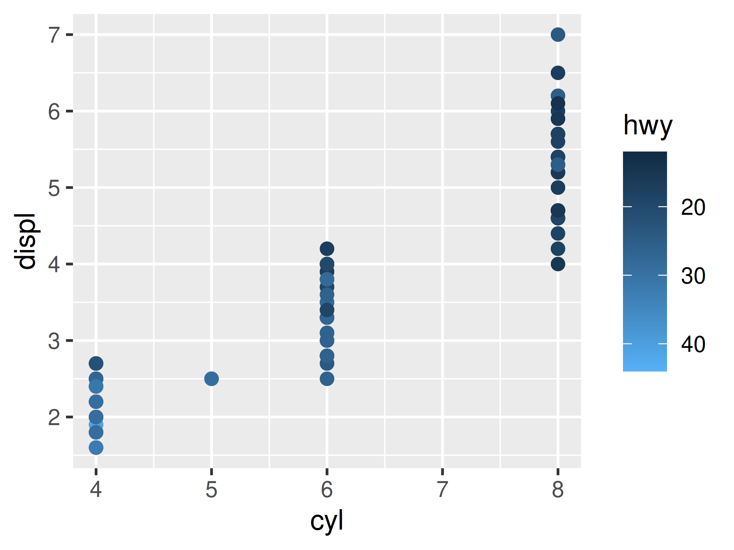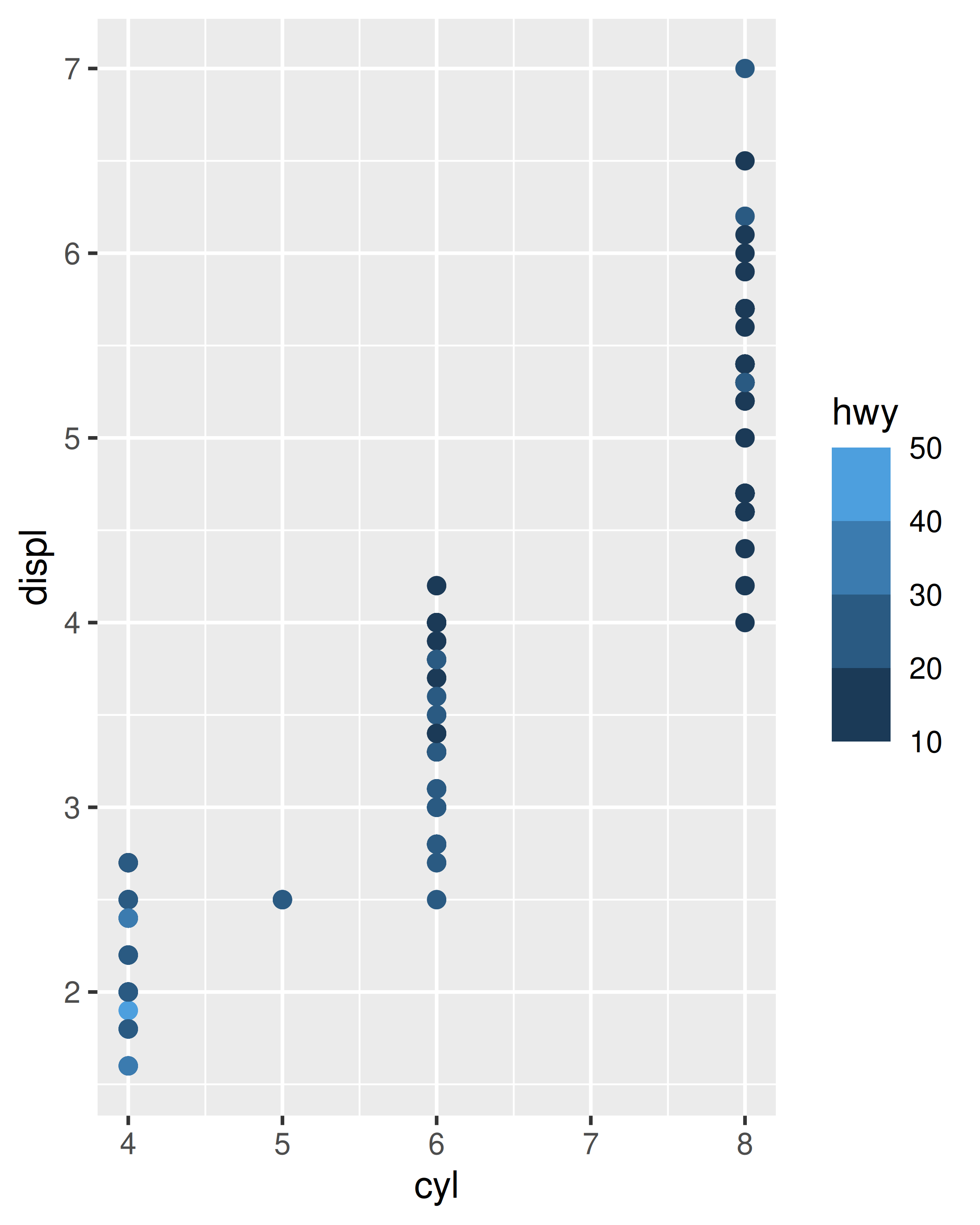 show.limitsindica si los valores deben mostrarse en los extremos de la barra de color escalonada, de forma análoga al argumento correspondiente enguide_bins()base <- ggplot(mpg, aes(cyl, displ, colour = hwy)) + geom_point(size = 2) + scale_color_binned() base base + guides(colour = guide_coloursteps(show.limits = TRUE))
